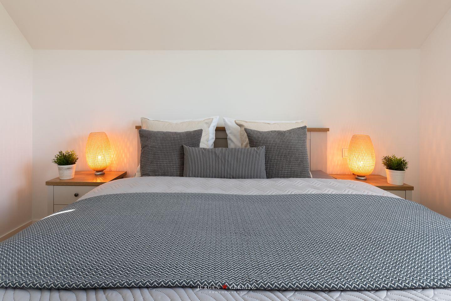 Die voll ausgestattete offene Küche lädt Dich zu gemeinsamen Kochabenden ein, während das hochwertig eingerichtete Schlafzimmer mit einem Doppelbett (180 × 200 cm) für erholsame Nächte sorgt.