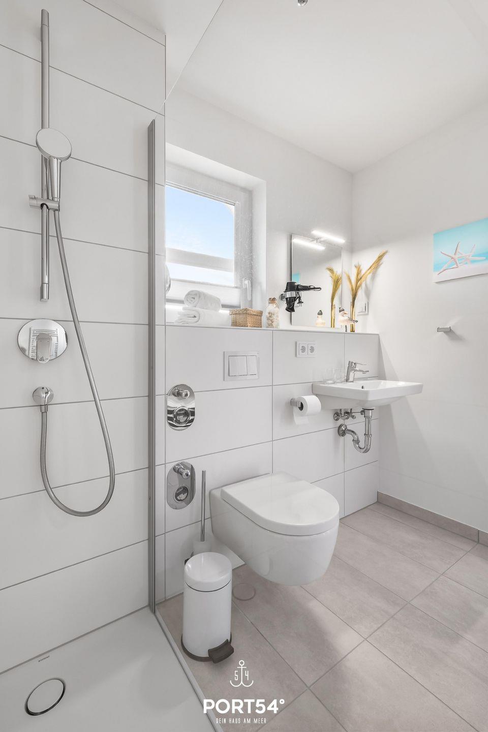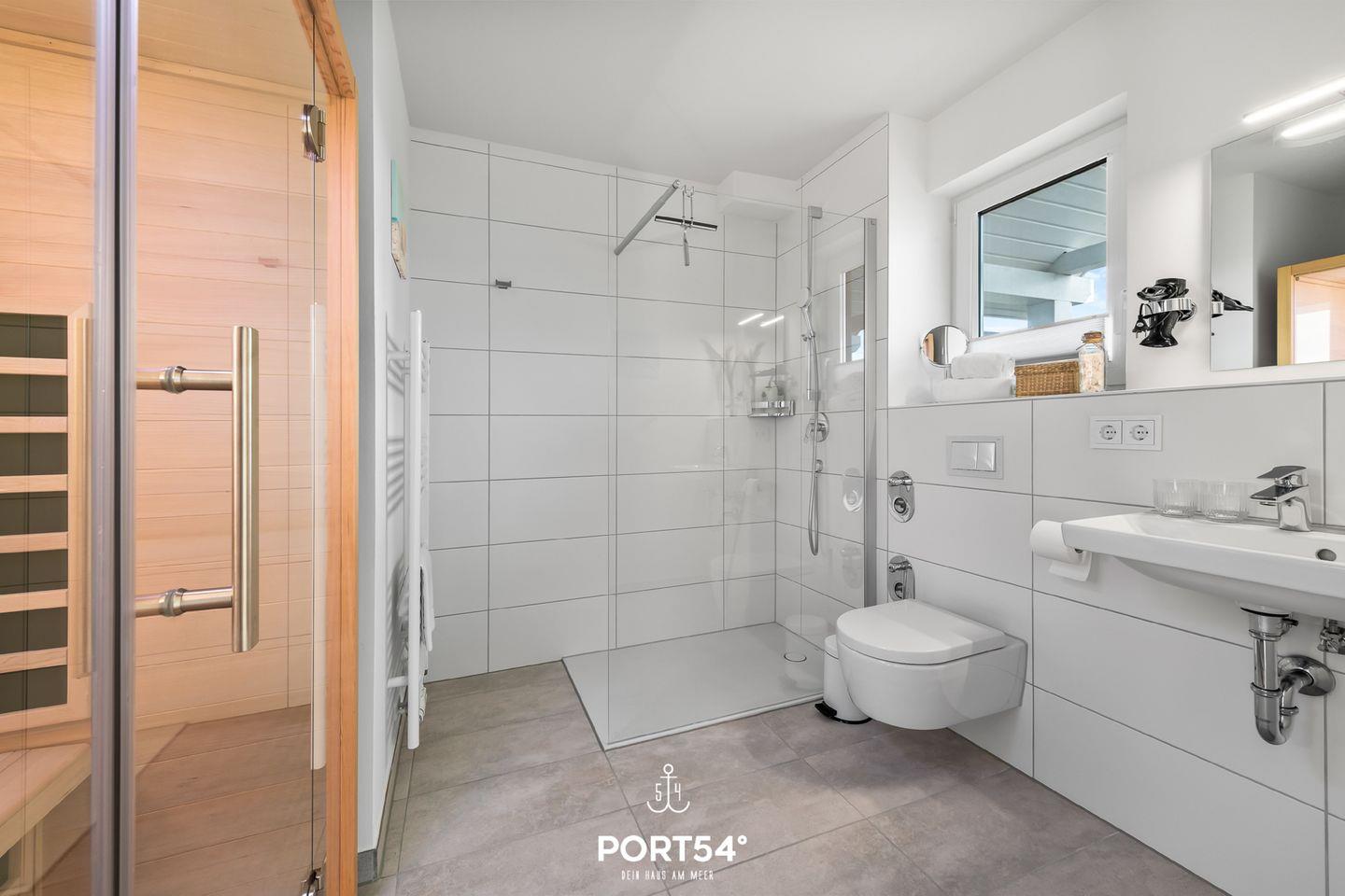 Dein Tag beginnt im modernen Badezimmer, das Dir nicht nur einen Handtuchtrockner, einen Föhn und eine erfrischende ebenerdige Dusche bietet, sondern auch das Highlight: eine eigene Infrarot-Sauna – Wellness pur.