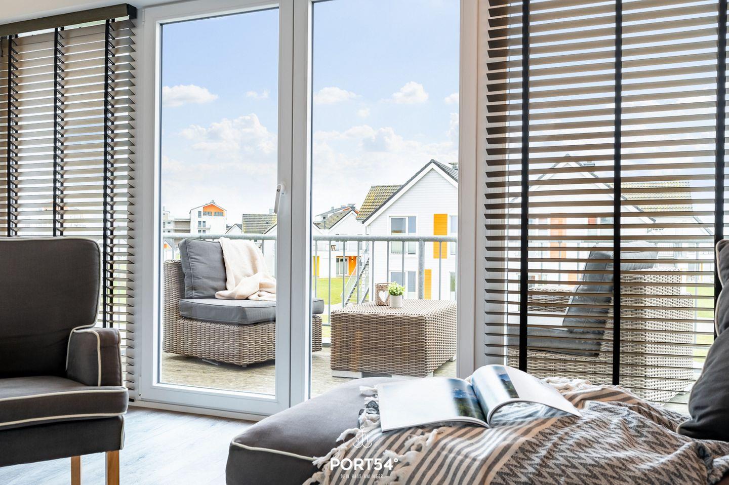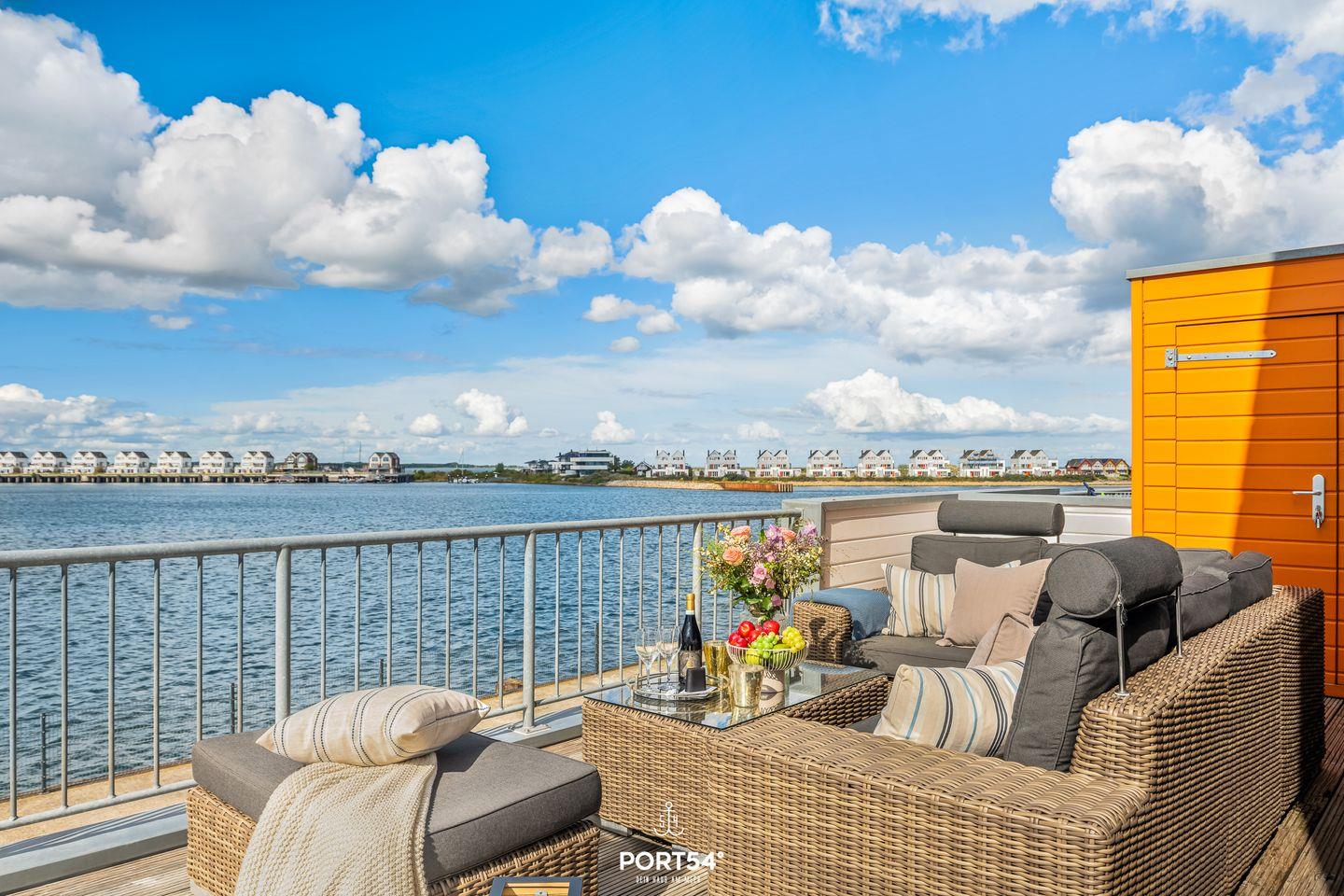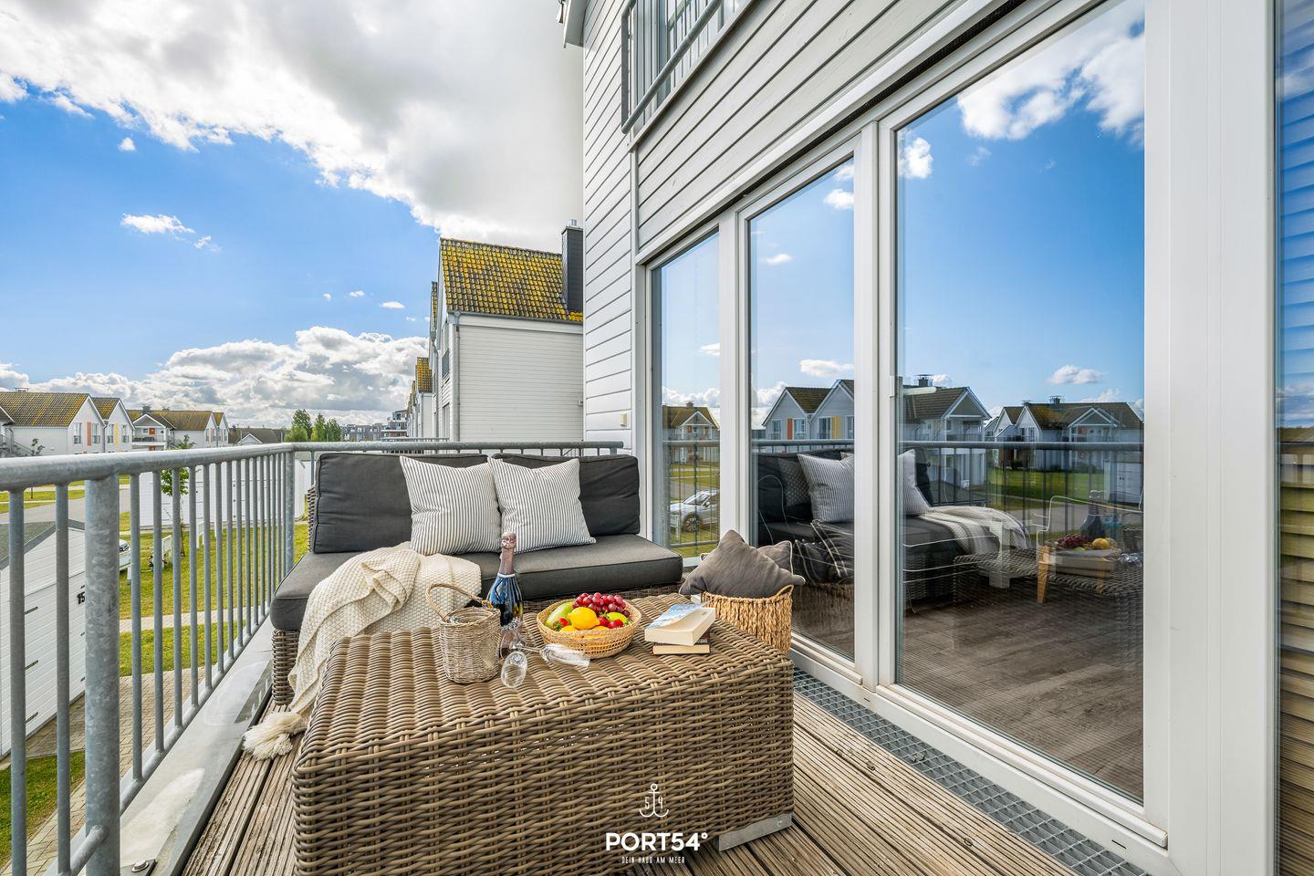 Der großzügige Balkon in Richtung Wasserseite lädt Dich zu sonnenverwöhnten Stunden ein und bietet Dir einen malerischen Blick auf den Hafen von Olpenitz. Hier kannst Du Deine Urlaubstage ausklingen lassen, die Meeresbrise genießen und spektakuläre Sonnenuntergänge erleben.