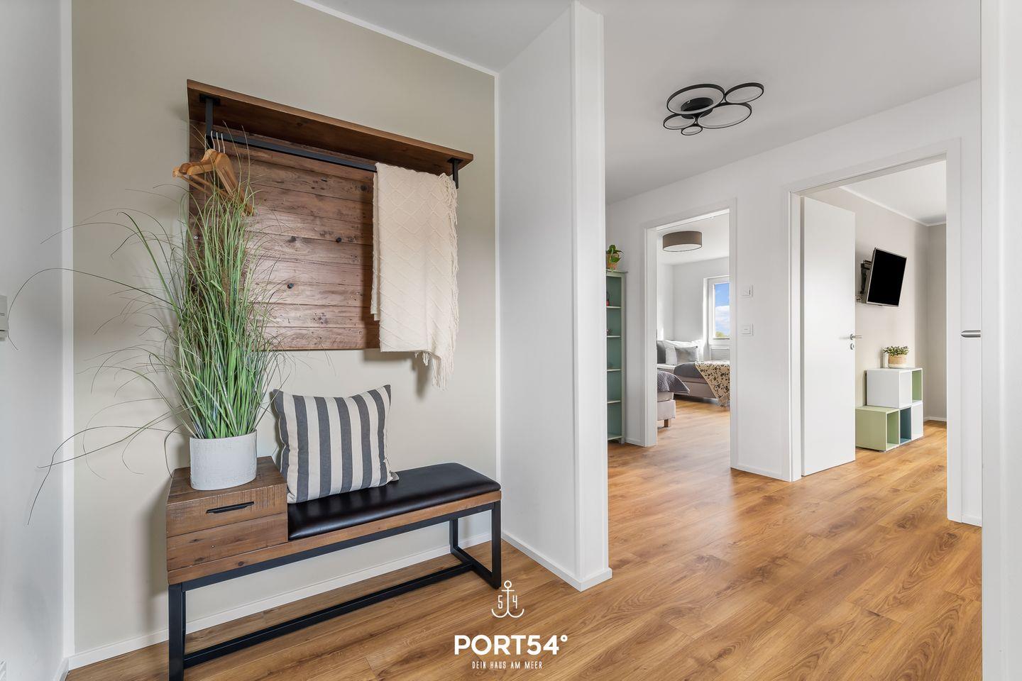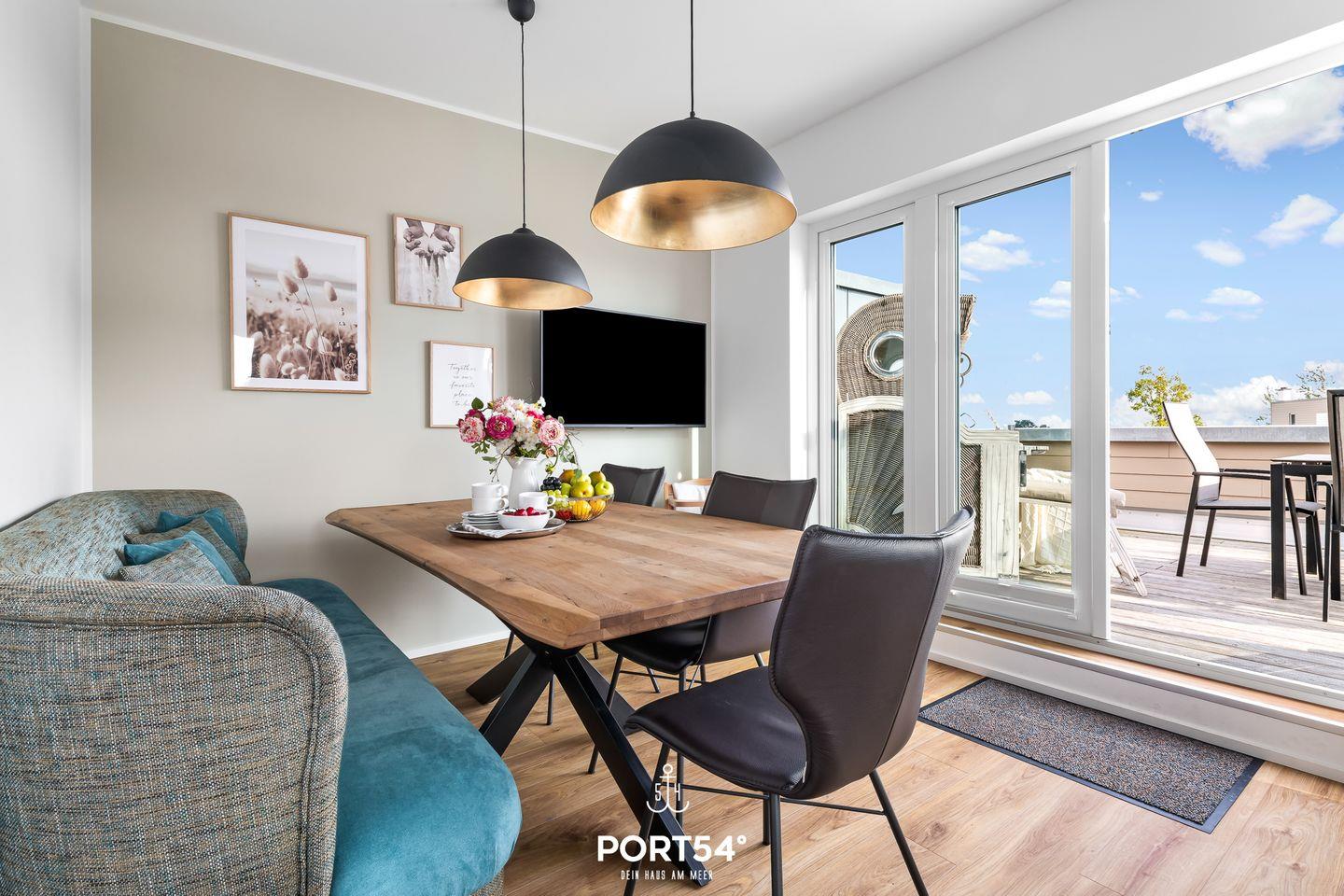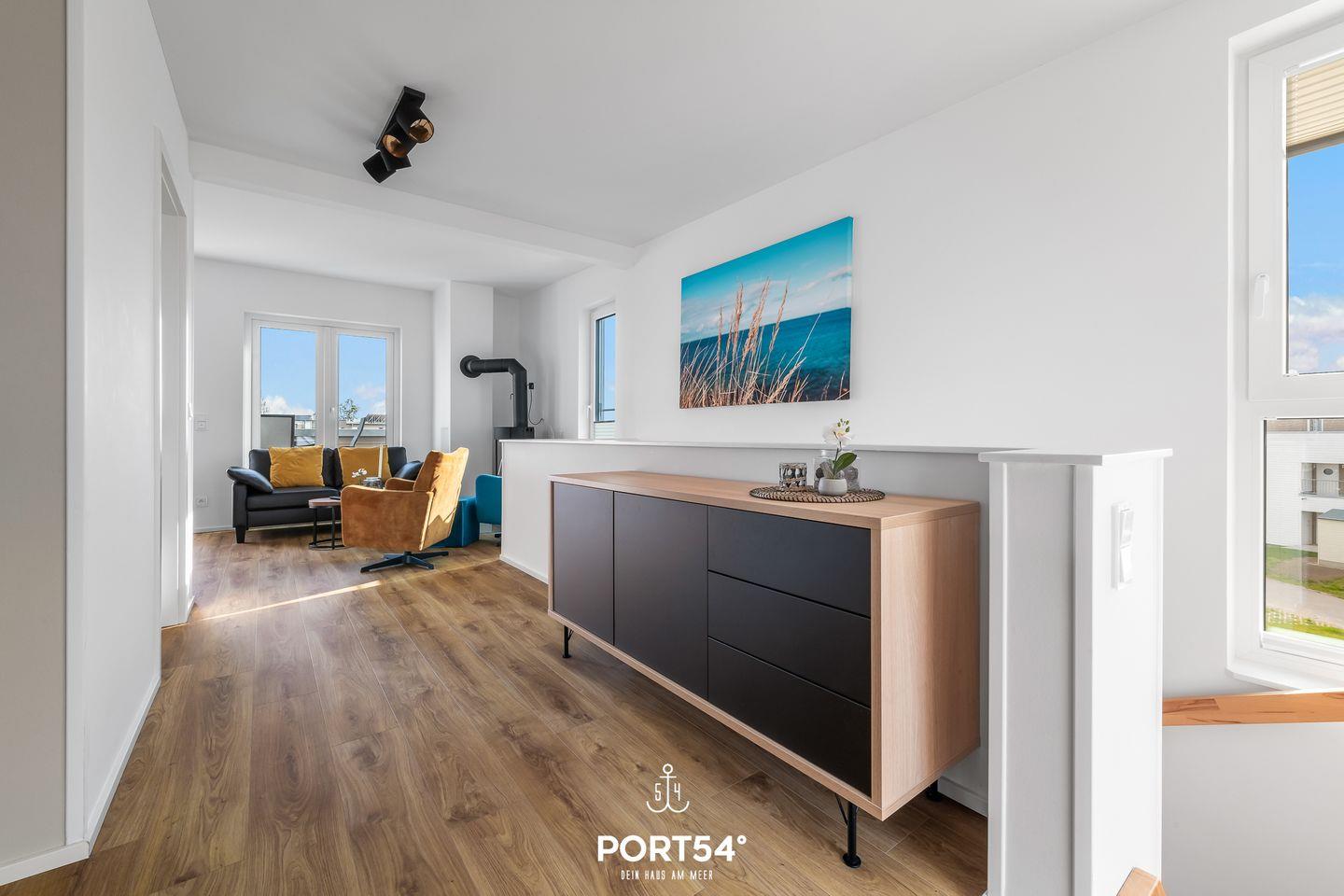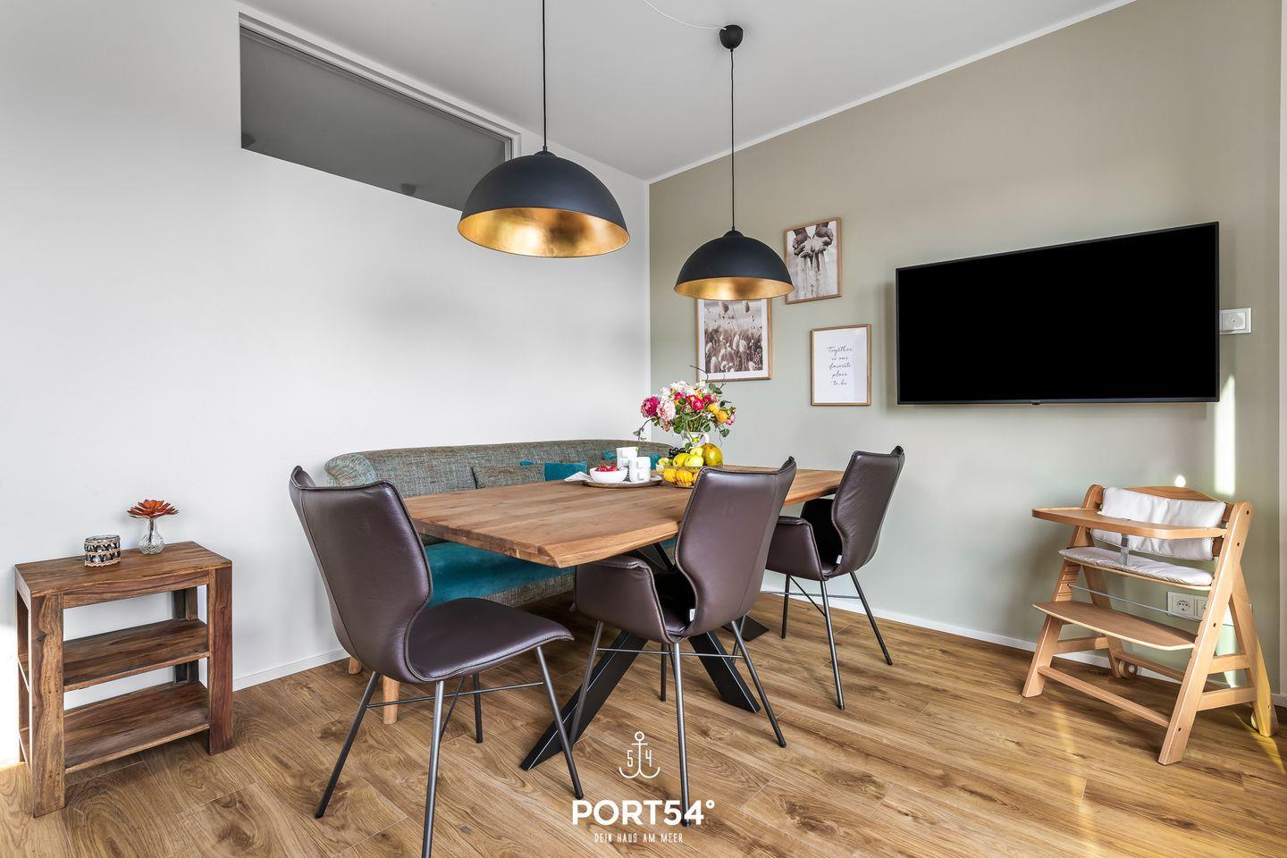 Herzlich Willkommen in der Ferienwohnung "Janus' Shelter" in Olpenitz! Die großzügige und hochwertig ausgestattete Maisonette-Ferienwohnung im 1. und 2. Obergeschoss bietet Ihnen einen unvergesslichen Urlaub an der Ostsee! Auf 130m² bietet "Janus' Shelter" Platz für 6 Personen und verspricht schöne Stunden im hohen Norden. Beim Betreten der lichtdurchfluteten Ferienwohnung kommt direkt Urlaubsfeeling auf! Im offen gestalteten Wohnzimmer mit Kamin und Zugang zur großzügigen Dachterrasse befindet sich eine gemütliche Sitzecke zum entspannten Lesen oder Ausruhen. Der geräumige Essbereich mit seiner bequemen Sitzbank ist der ideale Ort für gesellige Abende mit Blick auf die Ostsee. Die Küche ist modern und mit allem ausgestattet, was Sie für gesellige Kochabende benötigen. Der Bistrotisch mit Platz für 4 Personen lädt zum gemeinsamen Kochen ein. Für unsere kleinen Gäste stellen wir ein Kinderreisebett und einen Kinderhochstuhl bereit. Die drei gemütlichen Schlafzimmer laden zu erholsamen Urlaubsnächten ein. Alle sind mit einem Flachbild-Fernseher mit Magenta-TV ausgestattet. Das größte Schlafzimmer ist mit Wildeiche-Massivholzmöbeln eingerichtet und bietet neben einem Schreibtisch noch eine gemütliche Leseecke. Das Doppelbett ist 180cm x 200cm groß. Das zweite Schlafzimmer verfügt über ein 160cm x 200cm großes Boxspringbett. Die zwei einzelnen Boxspringbetten im dritten Schlafzimmer können auf Anfrage auch als Doppelbett gestellt werden. Falls dies gewünscht wird, vermerken Sie dies bitte unbedingt bei Ihrer Buchung. Auf der gleichen Etage befindet sich das Hauptbad mit bodengleicher Dusche und einer Infrarot-Sauna für Wellnessliebhaber. Das zweite Badezimmer auf der oberen Etage lädt zum Entspannen in der Badewanne ein. Das absolute Highlight der Wohnung ist die 28m² große Dachterrasse. Hier können Sie im Strandkorb oder auf den Sonnenliegen ausruhen oder beim geselligen Beisammensein rund um den großzügigen Tisch den Blick auf die Ostsee und das Wolkenpanorama genießen. Auch ein Elektrogrill steht bereit. Zwei eigene PKW-Stellplätze, eine E-Ladesäule und ein Fahrradschuppen befinden sich direkt vor der Unterkunft. Der Schuppen ist abschließbar und bietet Unterstellmöglichkeiten für Fahrräder oder Strand- und Sportgeräte. Der Weidefelder Sandstrand ist zu jeder Jahreszeit ein reizvolles Ausflugsziel. Mit Strandkörben, Restaurant, Kiosk und einer Wassersportschule bietet er alle Möglichkeiten für einen ausgiebigen Strandtag, aber auf dem langen Strandabschnitt auch Rückzugsorte, um Meer und Sonne - vielleicht bei einem Glas Wein oder Bier - zu genießen. Der maritim gestaltete Minigolfplatz ist ebenfalls in unmittelbarer Nähe und der Yachthafen mit angrenzender Hafenpromenade ist von Janus' Shelter in wenigen Minuten zu Fuß erreichbar.