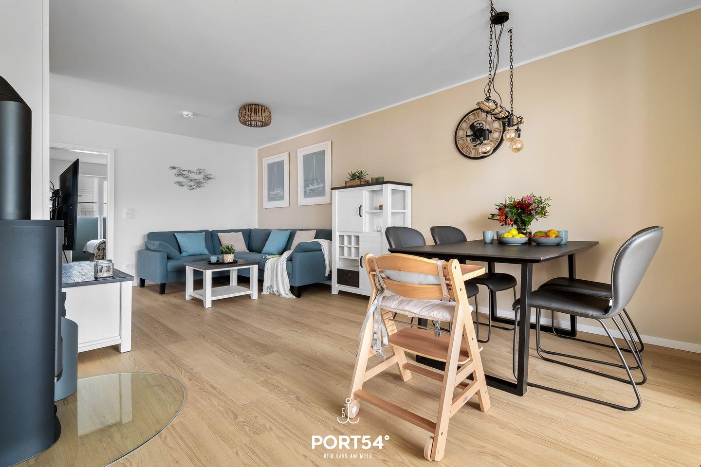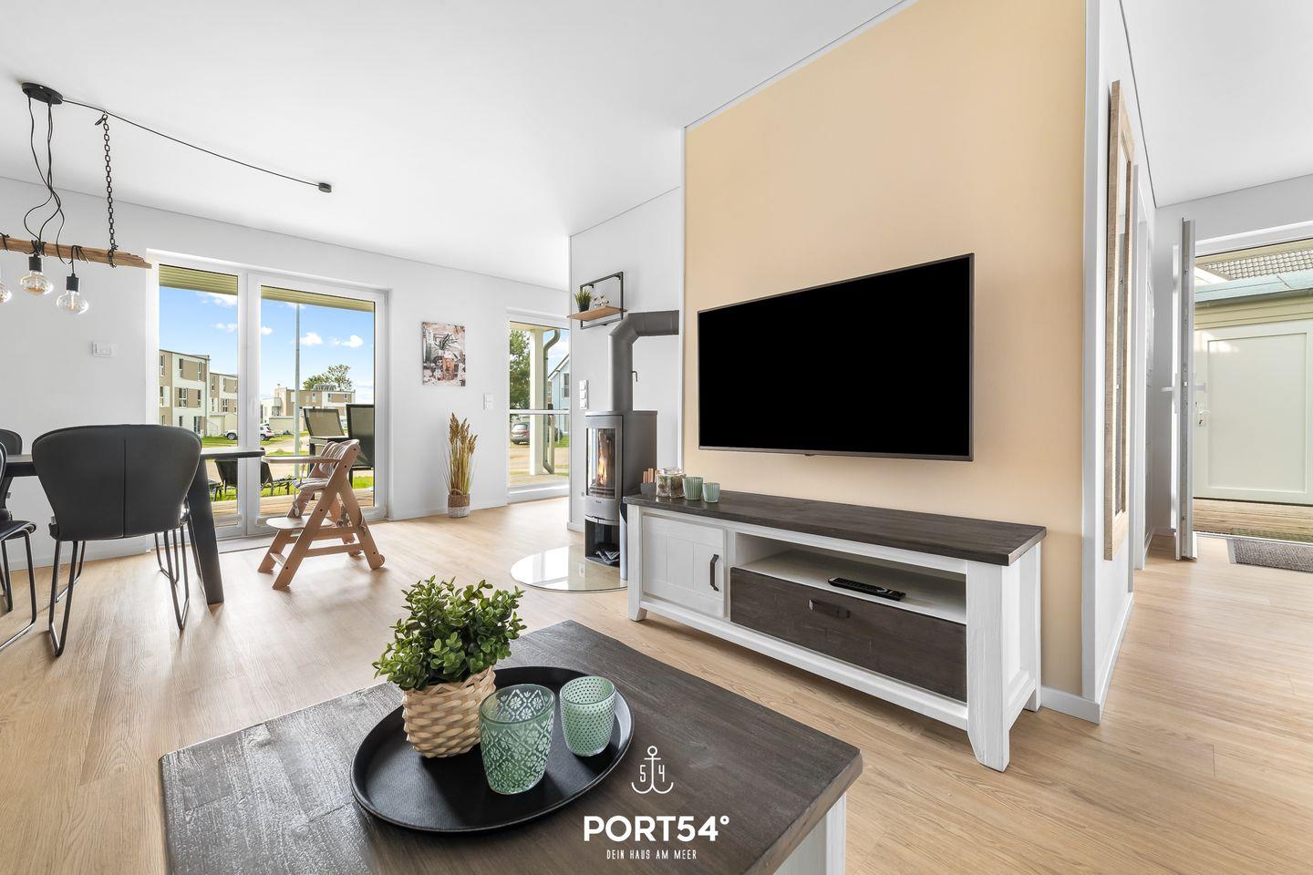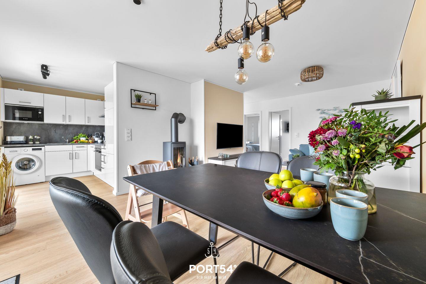 Im Erdgeschoss gelegen erwartet Sie eine großzügige Ferienwohnung mit vielen Annehmlichkeiten für einen Traumurlaub in Ostseenähe. Das Wohnzimmer verfügt über einen Kaminofen und einen Flatscreen-TV. Hier können Sie es sich mit Ihrer Lieblingsserie gemütlich machen und Ihren Urlaub in vollen Zügen genießen, während der Kamin eine gemütliche Atmosphäre und Wärme spendet. Die moderne Küche ist voll ausgestattet, sodass hier leckere Urlaubsgerichte gezaubert werden können. Der angeschlossene Essbereich bietet Platz für 4 Personen. In der Wohnung gibt es 2 Schlafzimmer. Das eine Zimmer verfügt über ein großes Boxspring-Doppelbett. In dem anderen Schlafzimmer stehen 2 bequeme Einzelboxspringbetten zur Verfügung, die zu einem Doppelbett zusammengeschoben werden können. Hier befindet sich außerdem ein Schreibtisch. Beide Schlafzimmer sind mit Flachbild-TV's ausgestattet, sodass auch fürs nächtliche Entertainment gesorgt ist. Das Badezimmer hat eine ebenerdige Dusche und als Highlight eine Infrarot-Sauna - nach langen Spaziergängen kann man sich dort wunderbar entspannen und aufwärmen. Ihre Vierbeiner sind herzlich Willkommen - wie auch kleine Gäste: wir stellen einen Kinderhochstuhl, ein Kinderreisebett und einen Tritt bereit. Weitere Highlights des Hauses sind die zwei überdachten Terrassen mit Gartenmöbeln und einem Elektro-Grill. Entspannten Grill-Abenden auf der Terrasse an der frischen Ostseeluft steht somit nichts mehr im Wege! Der Weidefelder Strand befindet sich in fußläufiger Nähe - und bietet neben Strandkörben auch ein Restaurant und einen Kiosk. Im Strandkorb mit einem Glas Wein den Sonnenuntergang anschauen - was will man Mee(h)r? Fürs Entertainment im Urlaub ist in Olpenitz ebenfalls gesorgt - der Minigolfplatz ist innerhalb weniger Gehminuten zu erreichen. Unternehmungslustige kommen hier auf jeden Fall auf ihre Kosten, denn auch die Surfschule in Weidefeld ist ein beliebtes Ausflugsziel und bietet Wassersportkurse für jedermann an. Ein kostenfreier Parkplatz inkl. E-Ladestation befindet sich direkt vor der Unterkunft. Mitgebrachte oder ausgeliehene Fahrräder können im abschließbaren Fahrradschuppen untergestellt werden.