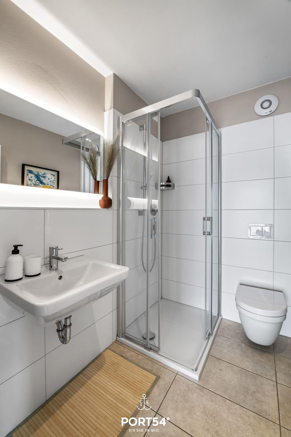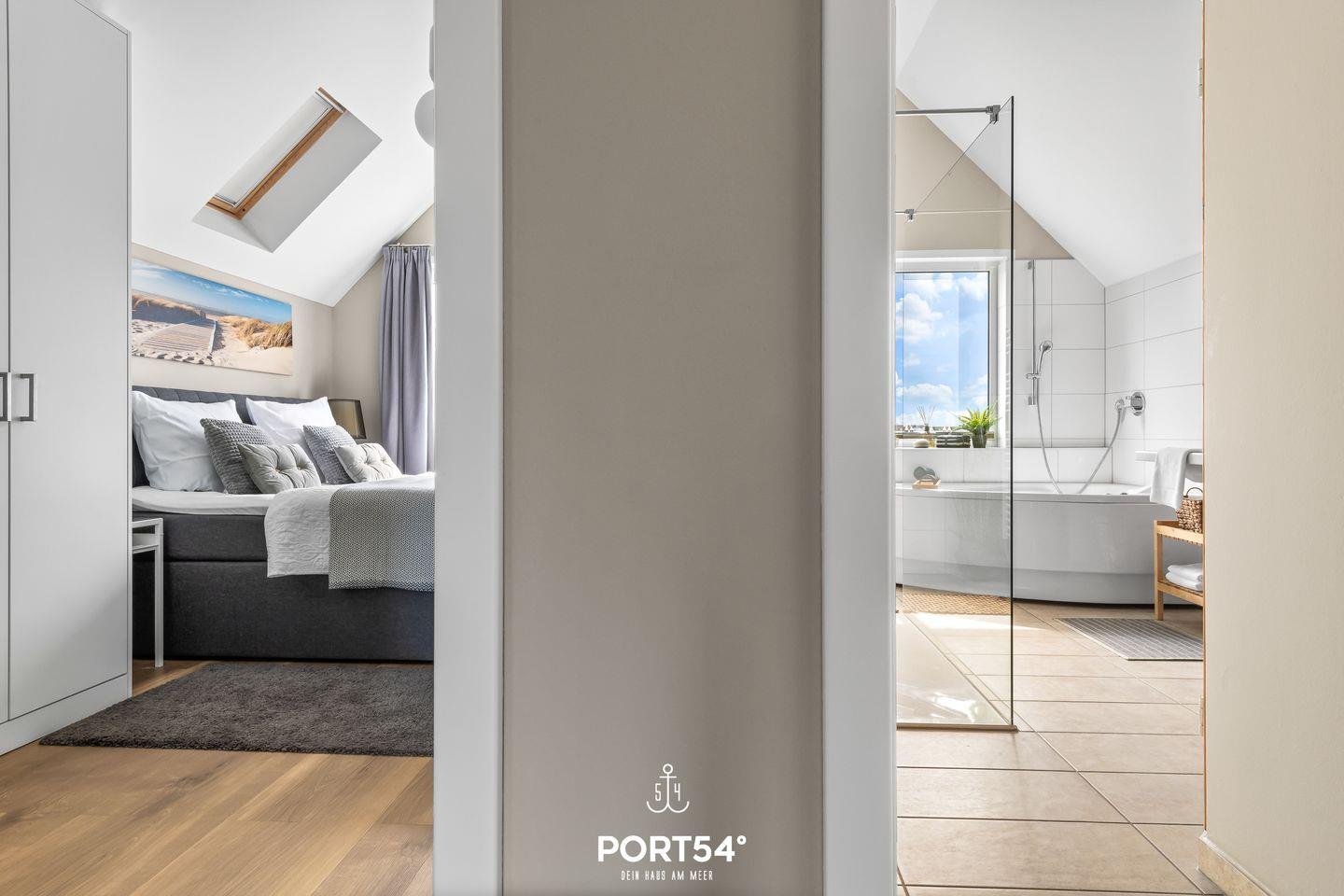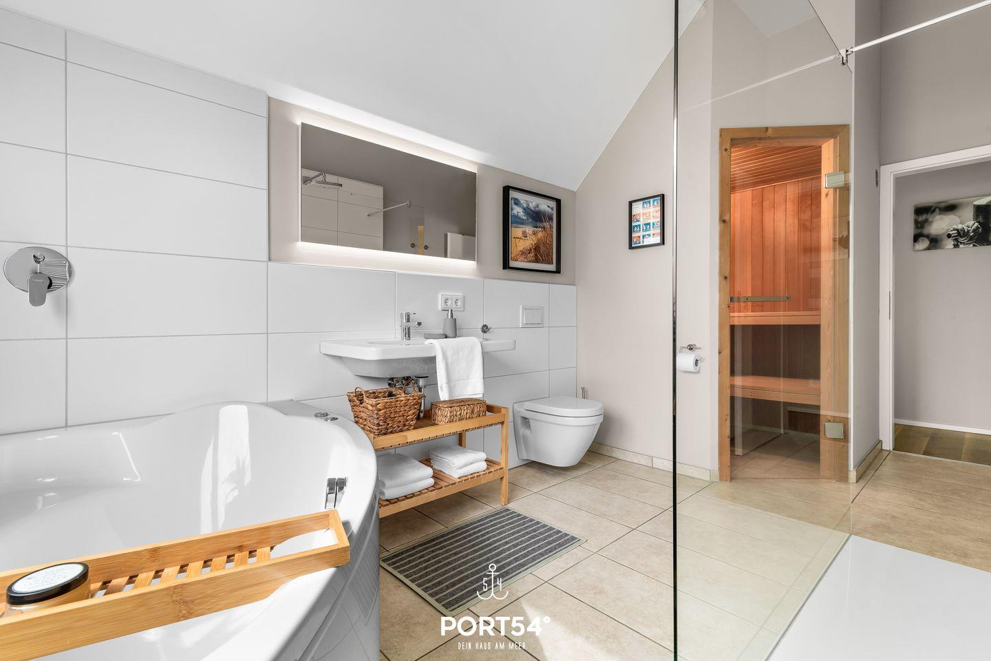 Das Wellnessbad ist ein weiteres Highlight: Eine finnische Sauna steht bereit, um nach einem erfrischenden Strandspaziergang für Entspannung zu sorgen. Die große Relax-Whirlwanne mit Wasserblick setzt dem Wohlfühlprogramm die Krone auf – hier tankst Du neue Energie und lässt den Alltag hinter Dir.