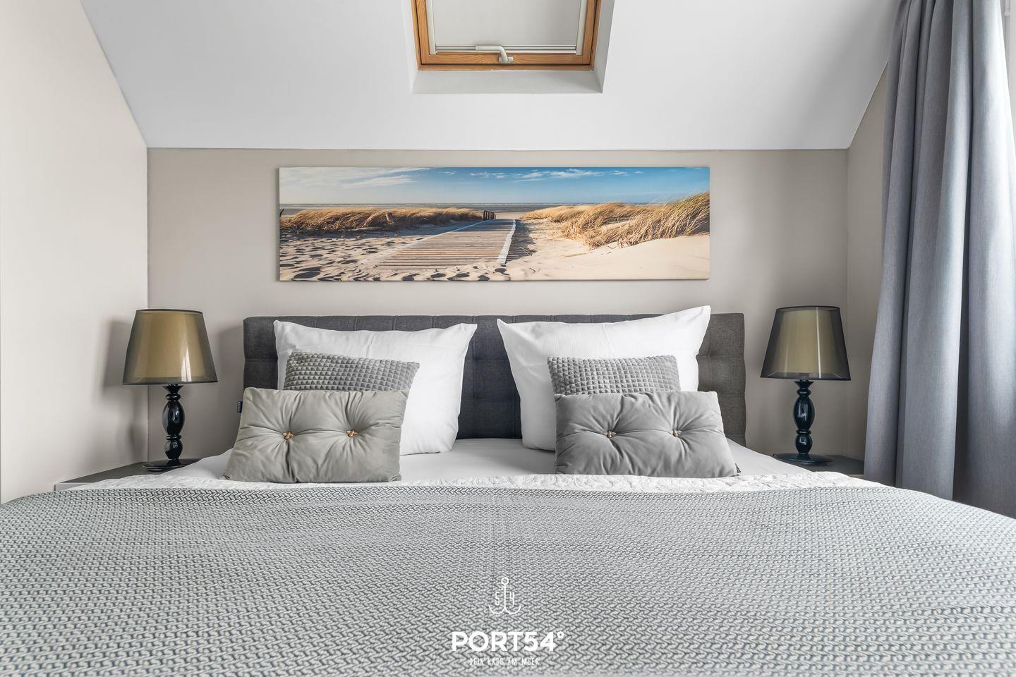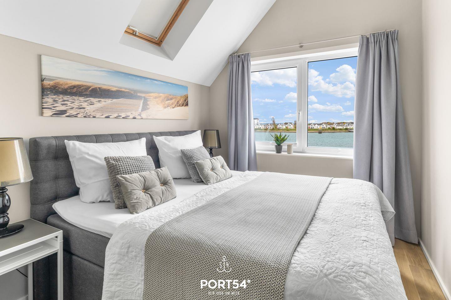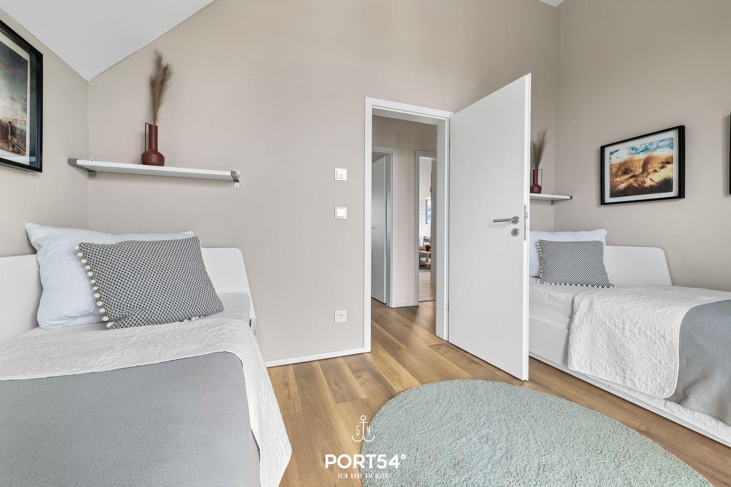Das Hauptschlafzimmer bietet ein Doppel-Boxspringbett und sorgt nicht nur für Komfort, sondern auch für einen traumhaften Blick auf den Hafen – eine Aussicht, die verzaubert. Das zweite Schlafzimmer hingegen schaut auf den malerischen Ostseefjord Schlei und verfügt über zwei Einzelbetten, wovon eins sich ausziehen lässt, um zusätzlichen Platz für kleine Urlauber zu schaffen. Selbstverständlich sind beide Schlafzimmer verdunkelbar.