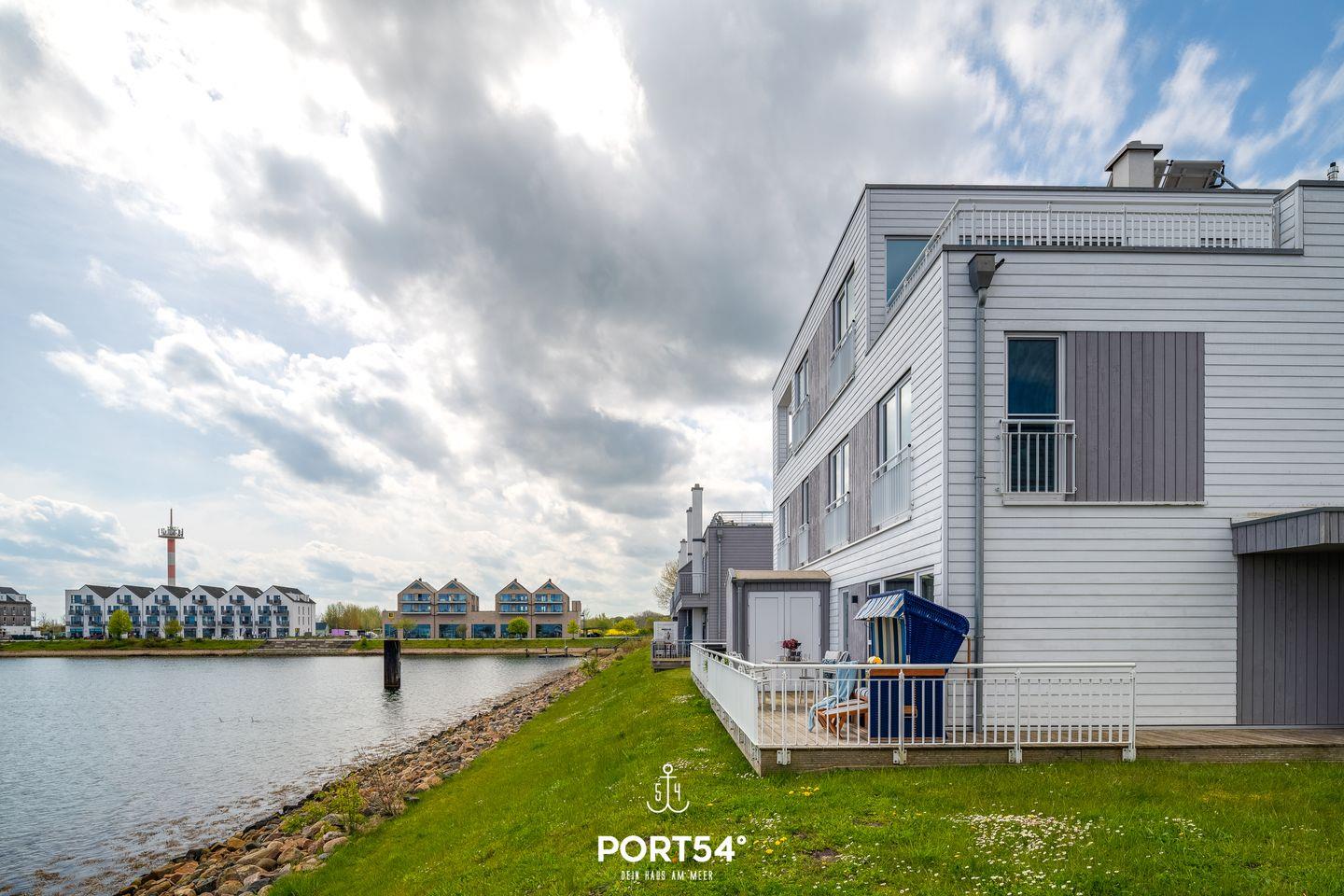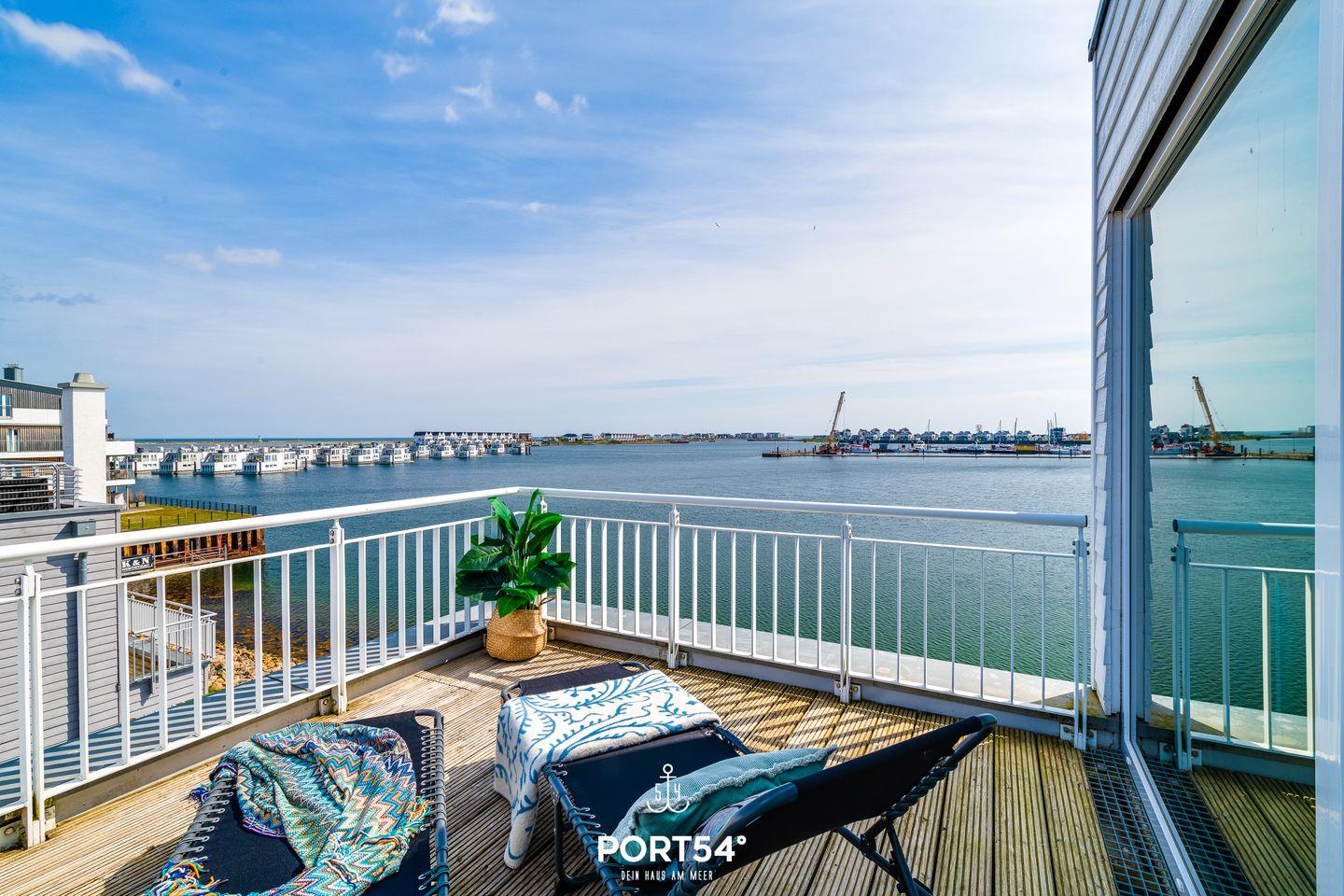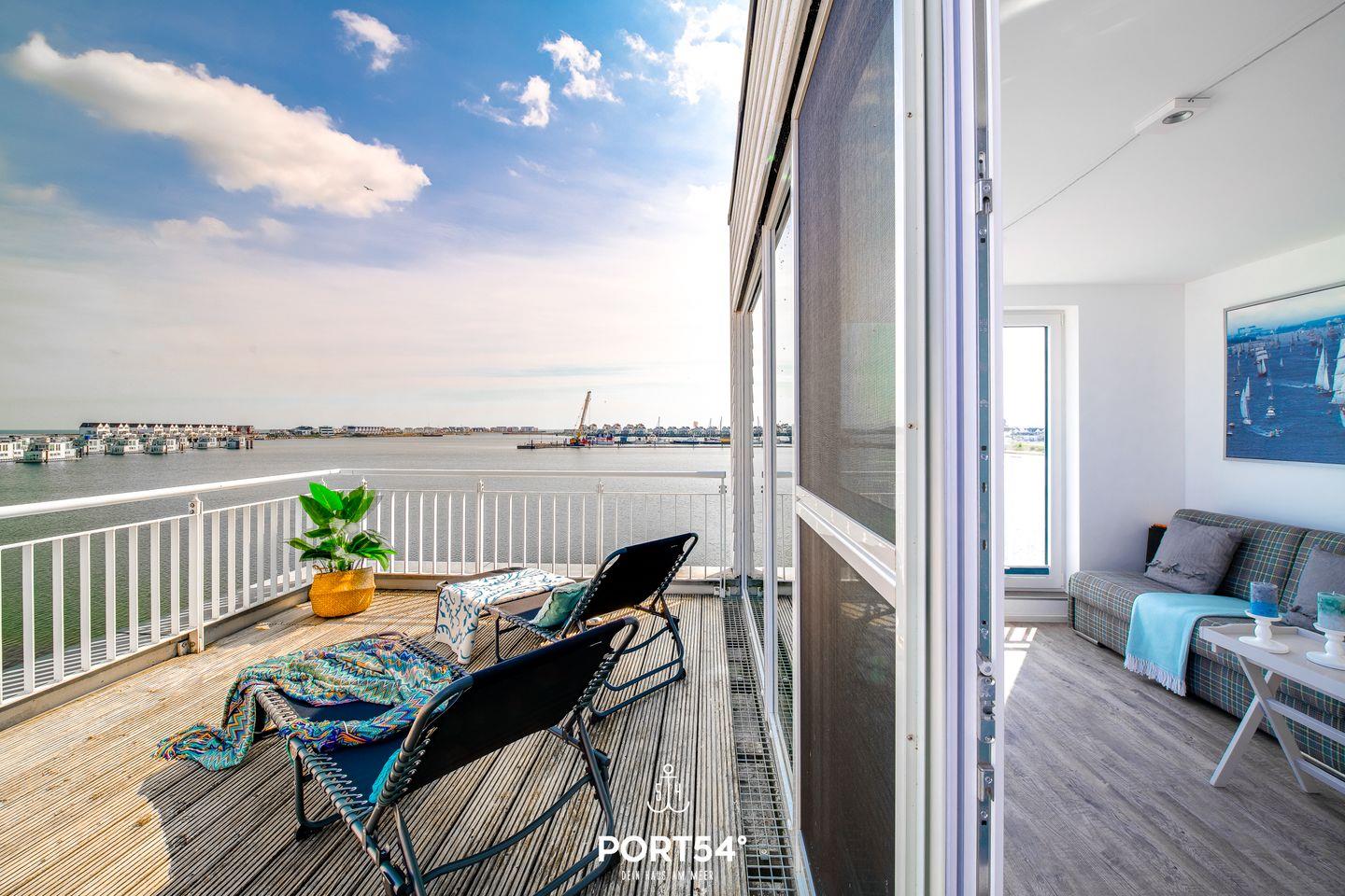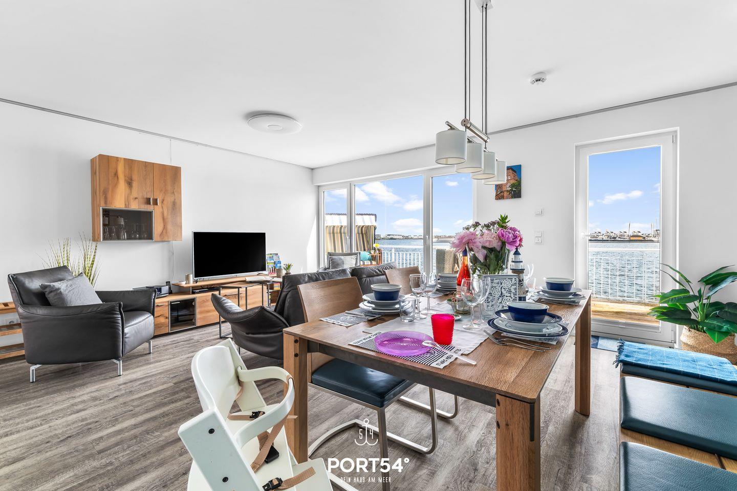 Der Wohn- und Essbereich bietet einen Blick auf den Hafen. Die Küche ist voll ausgestattet. Beide Schlafzimmer haben Wasserblick. Ein Highlight des Hauses ist das Studio, das mit einer Schlafcouch ausgestattet. Vom Studio aus erreichen Sie die Dachterrasse sowie Sauna und Dusche. Die Whirlwanne im Badezimmer verspricht Entspannung pur.