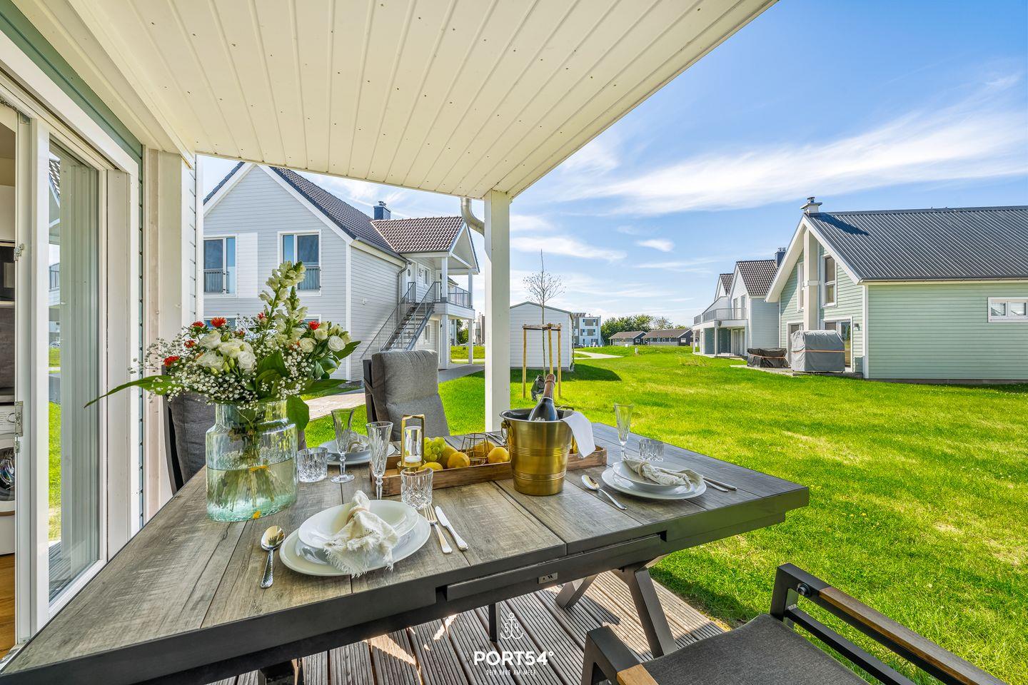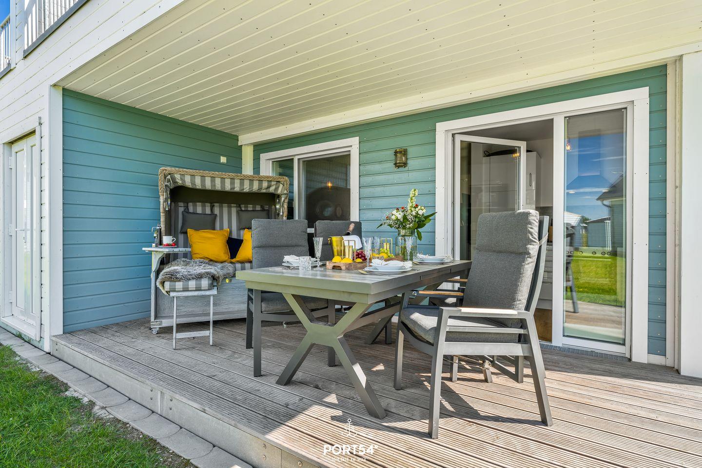 Von der Küche und dem Essbereich aus gelangst Du auf die überdachte Terrasse, auf der Du morgens Deinen Kaffee im Strandkorb genießen oder unvergessliche Grillabende erleben kannst.