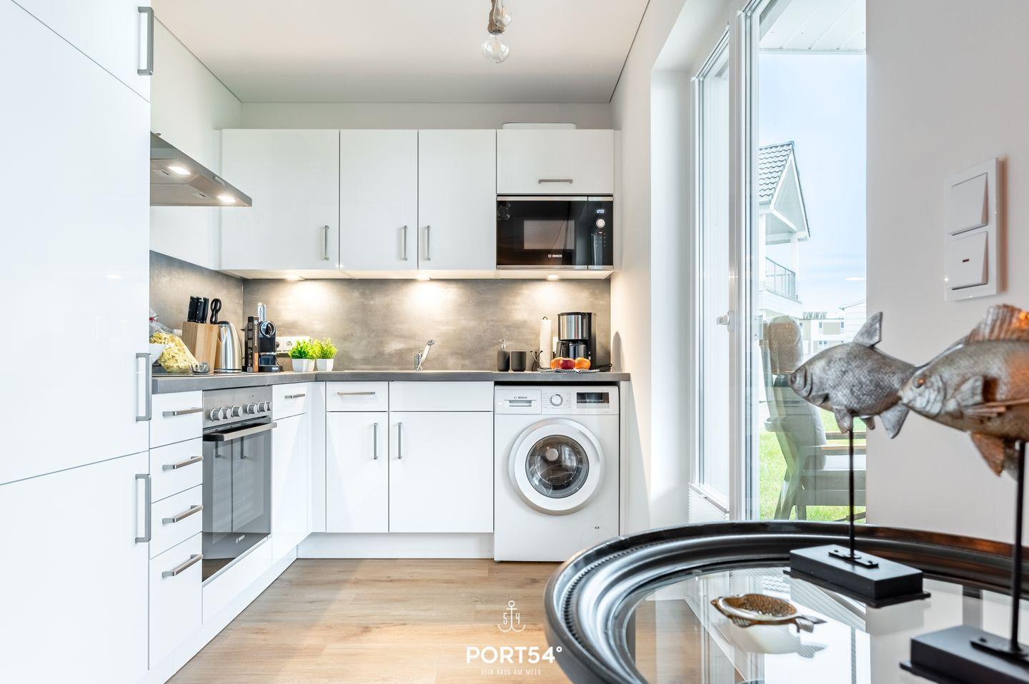Die offene Küche ist bestens ausgestattet und beherbergt eine Waschmaschine.
