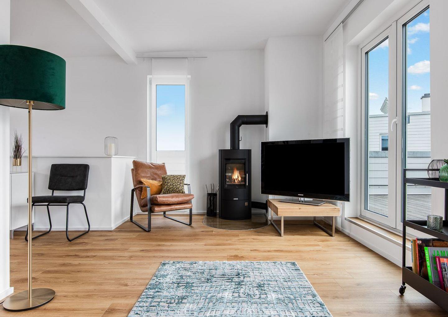 Die Wohnung „Sternelounge“ teilt sich auf 129 m² in drei Schlafzimmer mit zwei Doppelbetten und zwei Einzelbetten, einen offenen Wohn- und Essbereich mit Kamin, zwei Badezimmer mit Badewanne, Dusche und Infrarot-Sauna sowie eine Dachterrasse auf. Die Dachterrasse bietet Dir einen atemberaubenden Blick auf die Natur und auf das Meer.