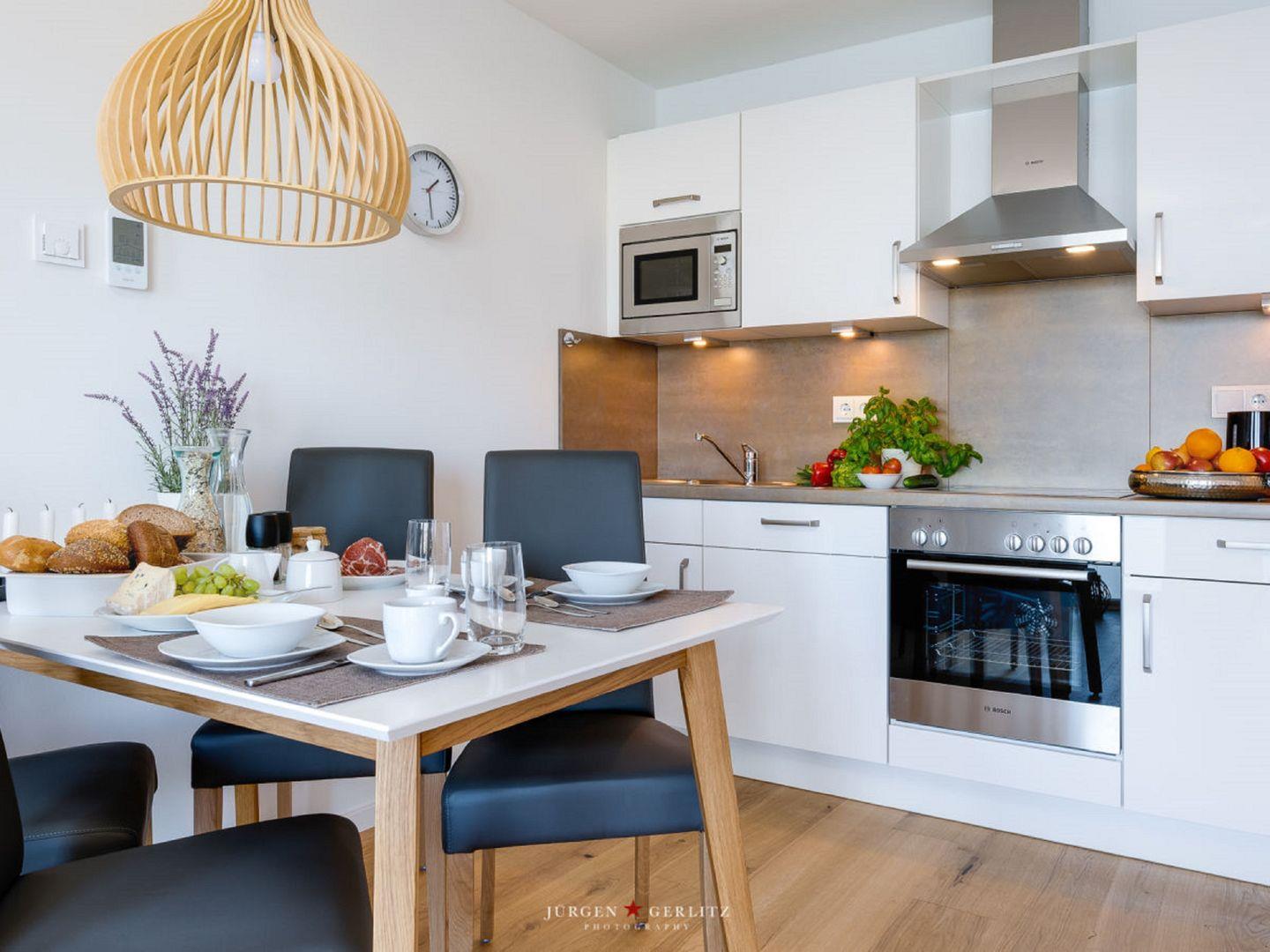 Moderne Ferienwohnung Knurrhahn mit Hafenblick, Balkon, Aufzug und voll ausgestatteter Küche in Olpenitz.