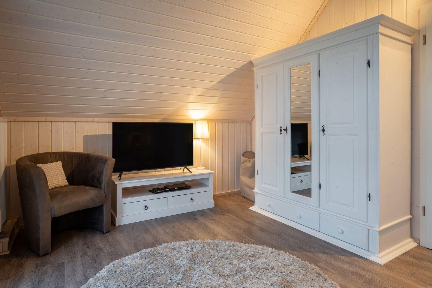 Für Unterhaltung ist im "Kuschelhaus" ebenfalls bestens gesorgt: Eine Wii-Spielekonsole mit einer Auswahl an Spielen steht Ihnen zur Verfügung, ebenso wie eine umfangreiche Spielesammlung für gesellige Abende. Für die kleinen Gäste sind ein Kinderhochstuhl und ein Kinderreisebett vorhanden, ebenso ein ausziehbares Treppenschutzgitter. Alle Fenster im Haus sind mit Sichtschutz ausgestattet, um Ihnen ein Höchstmaß an Privatsphäre zu gewährleisten.