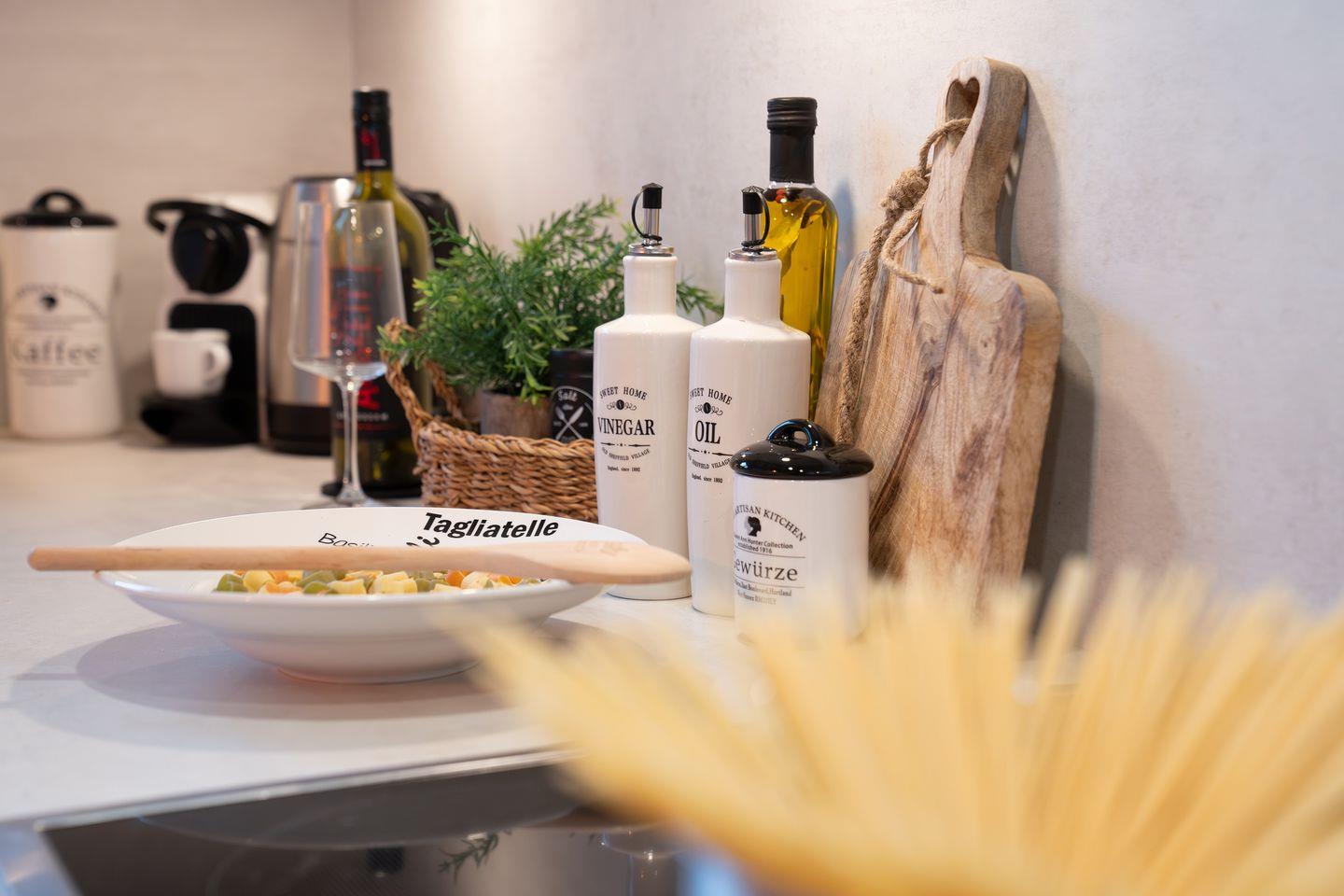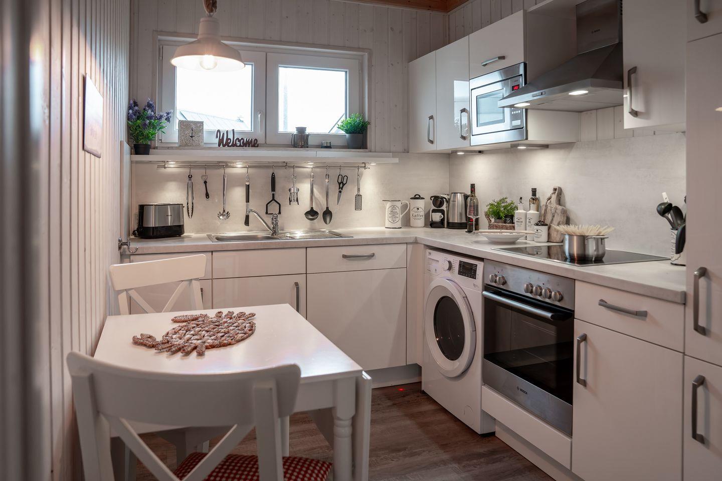 Die voll ausgestattete Küche ist ein Paradies für Hobbyköche und lässt keine Wünsche offen: Mit einem Ceran-Kochfeld, Backofen, Mikrowelle und einer Spülmaschine sind Sie bestens gerüstet, um kulinarische Köstlichkeiten zu zaubern. Zusätzlichen Komfort bieten eine Waschmaschine und ein Trockner, die Ihnen die Möglichkeit geben, auch während Ihres Aufenthalts stets frische Wäsche zur Verfügung zu haben.