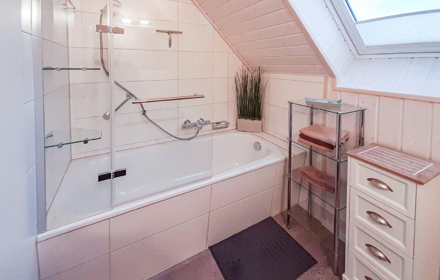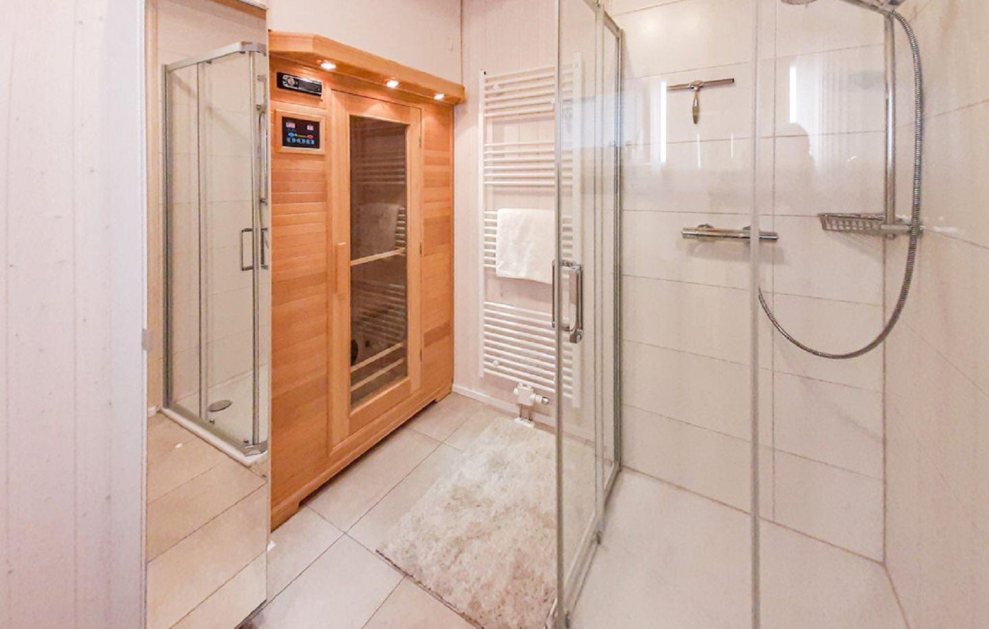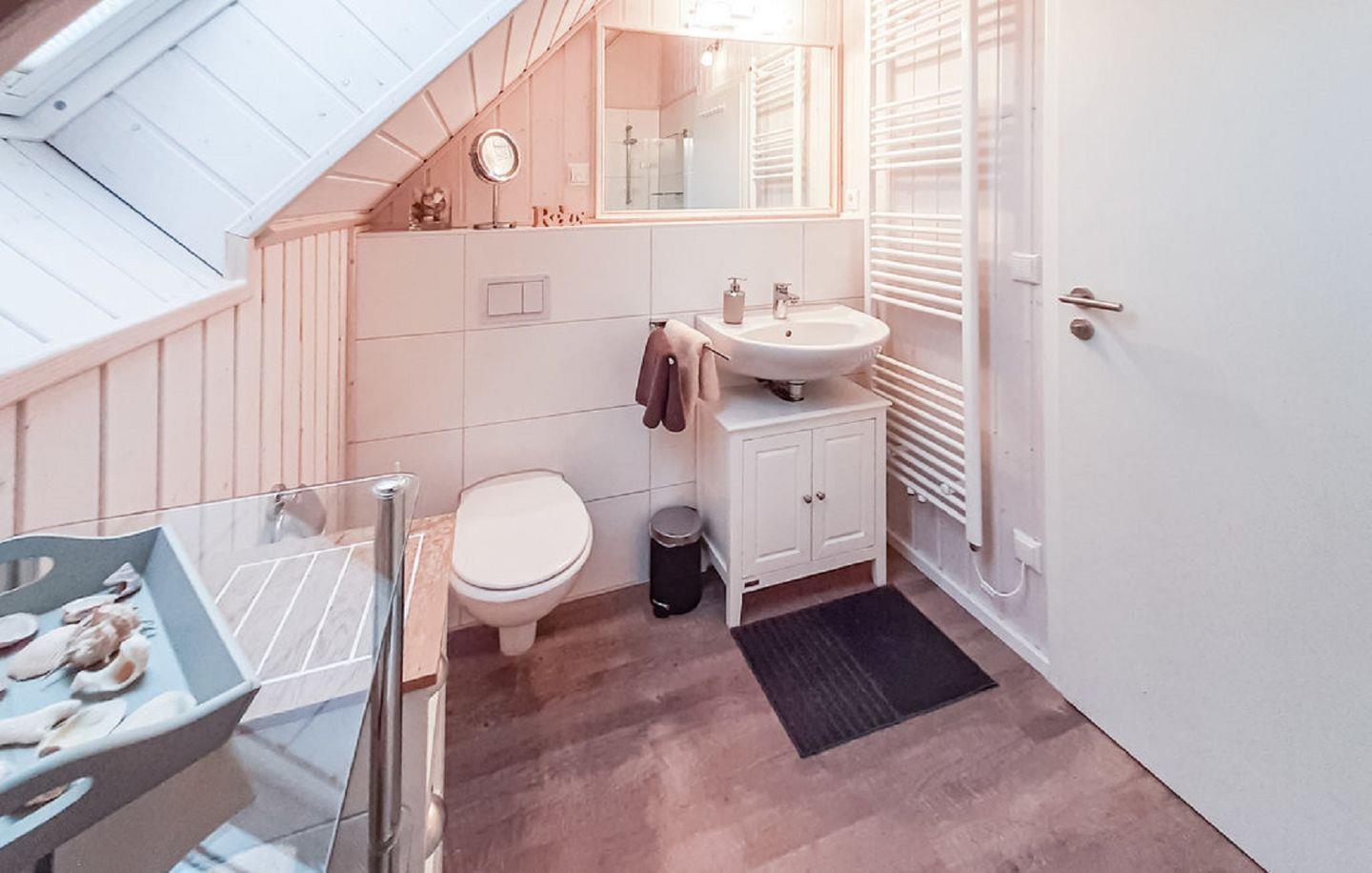 Im Erdgeschoss befindet sich ein modern gestaltetes Badezimmer mit Dusche, WC, Handtuchheizung und Föhn. Ein besonderes Highlight ist die luxuriöse Infrarotsauna, die wohltuende Entspannung nach einem Tag voller Aktivitäten bietet. Das obere Badezimmer begeistert mit einem Dachfenster, das Tageslicht hineinlässt, während der Sichtschutz Ihre Privatsphäre wahrt. Hier können Sie in der Badewanne entspannen und die wohlige Wärme der Handtuchheizung genießen.