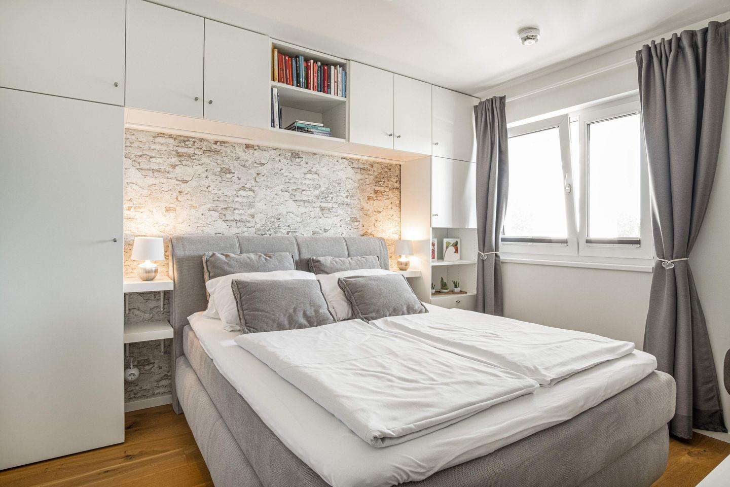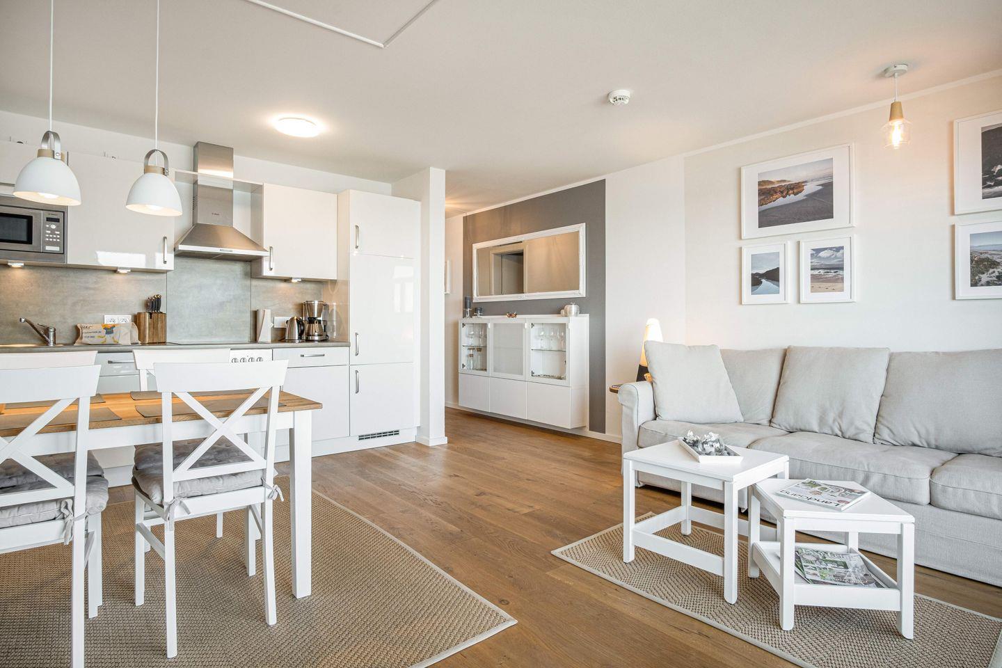 Mit einer Größe von 50 m² bietet die Unterkunft Platz für bis zu vier Personen und verfügt über ein gemütliches Schlafzimmer mit Doppelbett (160x200cm) sowie ein einladendes Wohnzimmer mit Schlafsofa für zwei weitere Gäste. Die offene Küche ist vollständig ausgestattet und lässt keine Wünsche offen – hier finden Sie unter anderem einen Herd mit Ceranfeld, einen Backofen, eine Spülmaschine und eine Kaffeemaschine, um Ihren Morgen perfekt zu beginnen. Der Esstisch lädt zu gemeinsamen Mahlzeiten ein, während Sie die frische Meeresbrise genießen können, die durch die Fenster strömt. Der Wohnbereich wirkt dank der bodentiefen Fenster zu jeder Tageszeit einladend hell und freundlich.