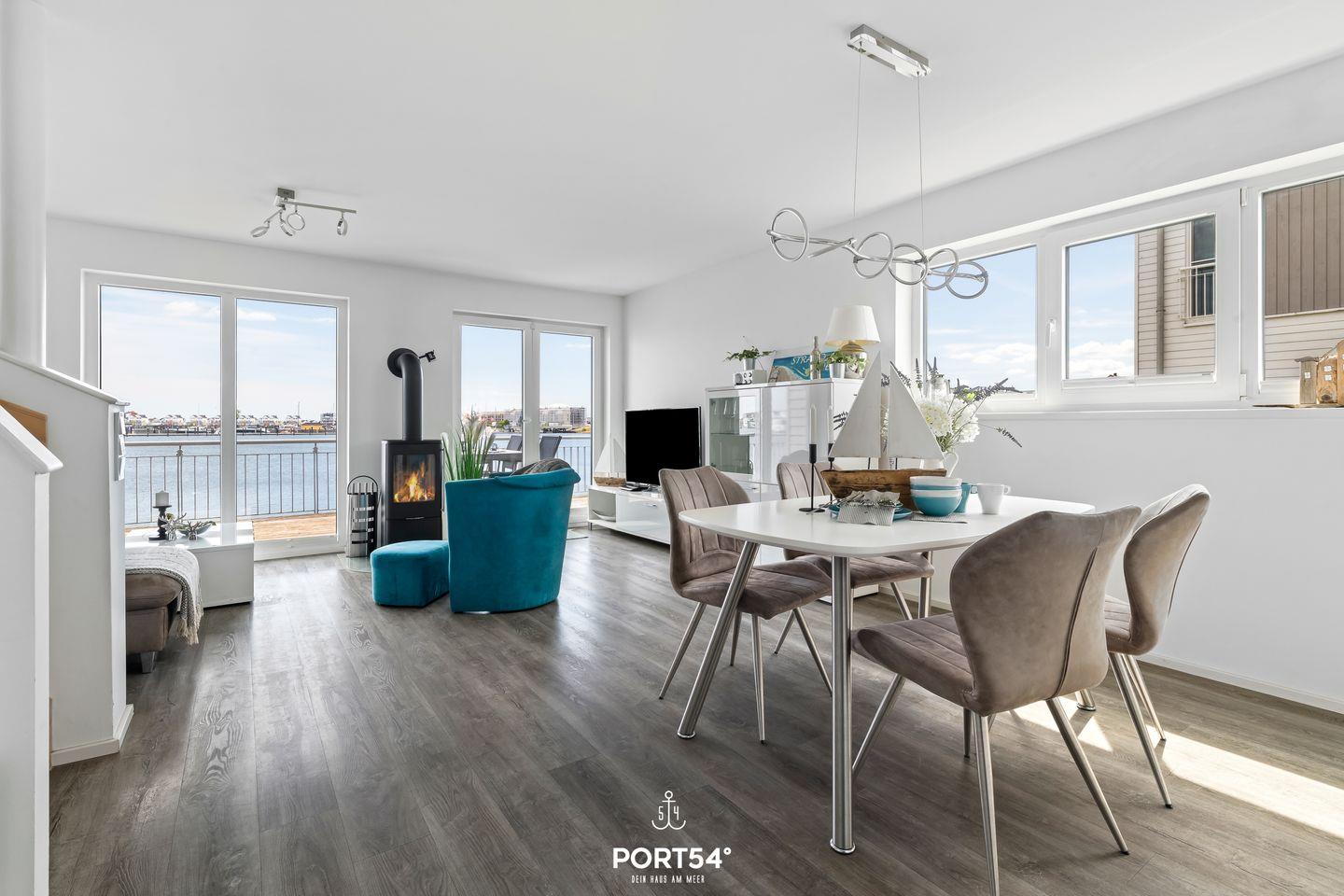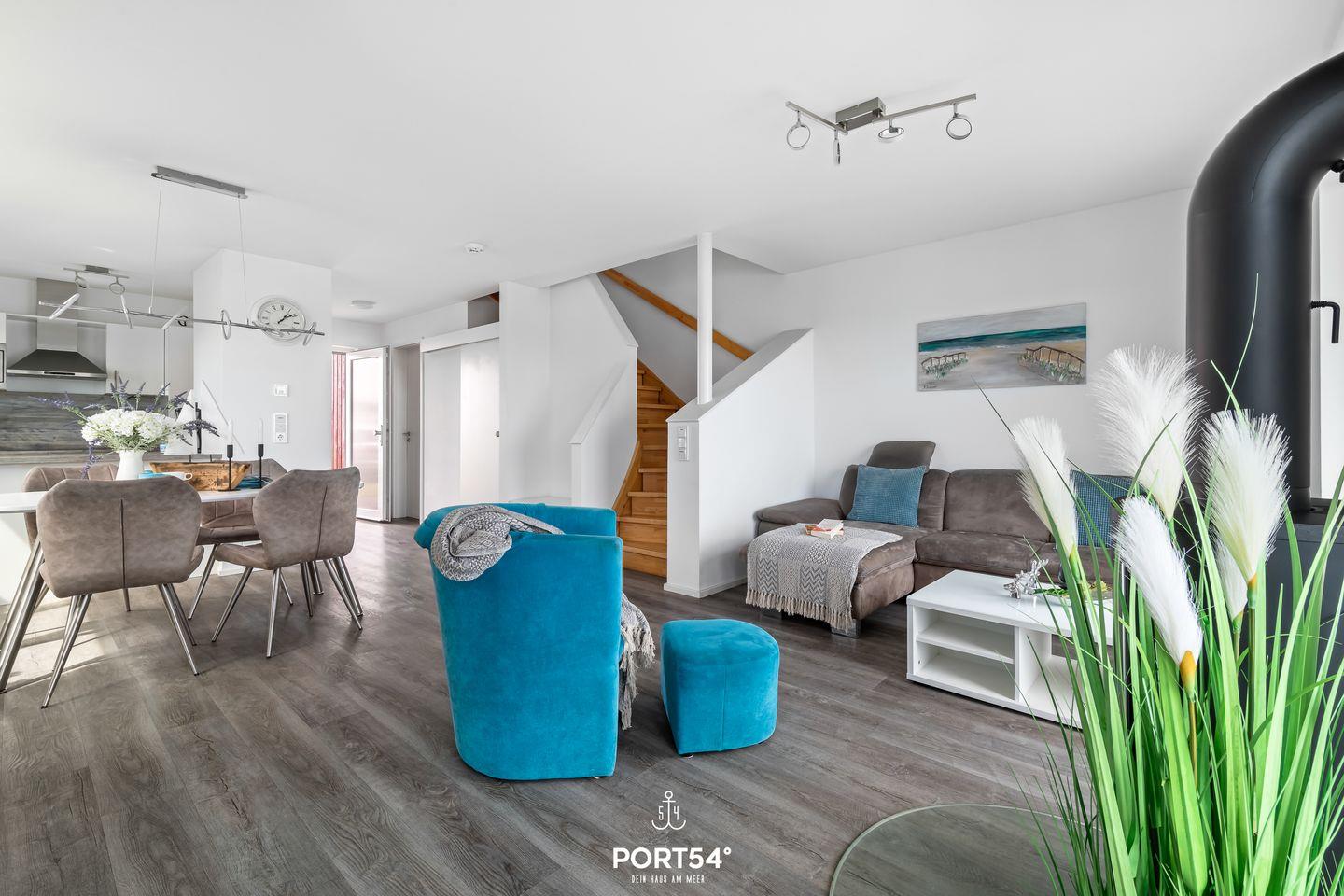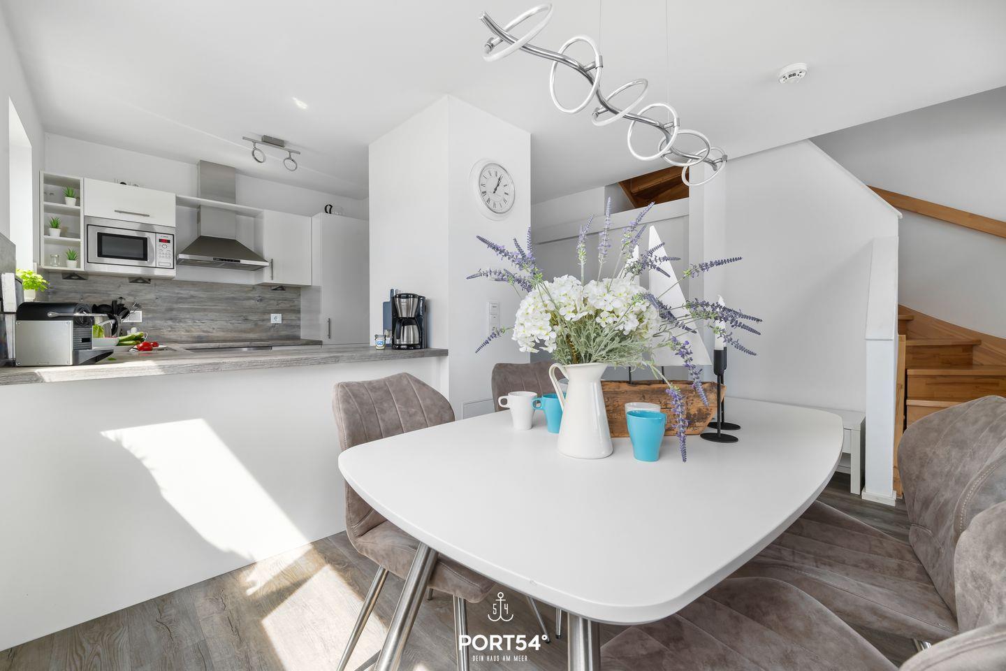 Der offene Wohn- und Essbereich des Strandnests ist das Herzstück des Hauses. Hier trifft stilvolles Design auf Gemütlichkeit. Der gemütliche Kamin sorgt auch an kühleren Tagen für eine behagliche Atmosphäre. Die moderne Küche ist voll ausgestattet und lässt keine Wünsche offen. Ob ein romantisches Dinner zu zweit oder ein geselliger Abend mit Familie und Freunden – dieser Raum ist perfekt für unvergessliche Momente.