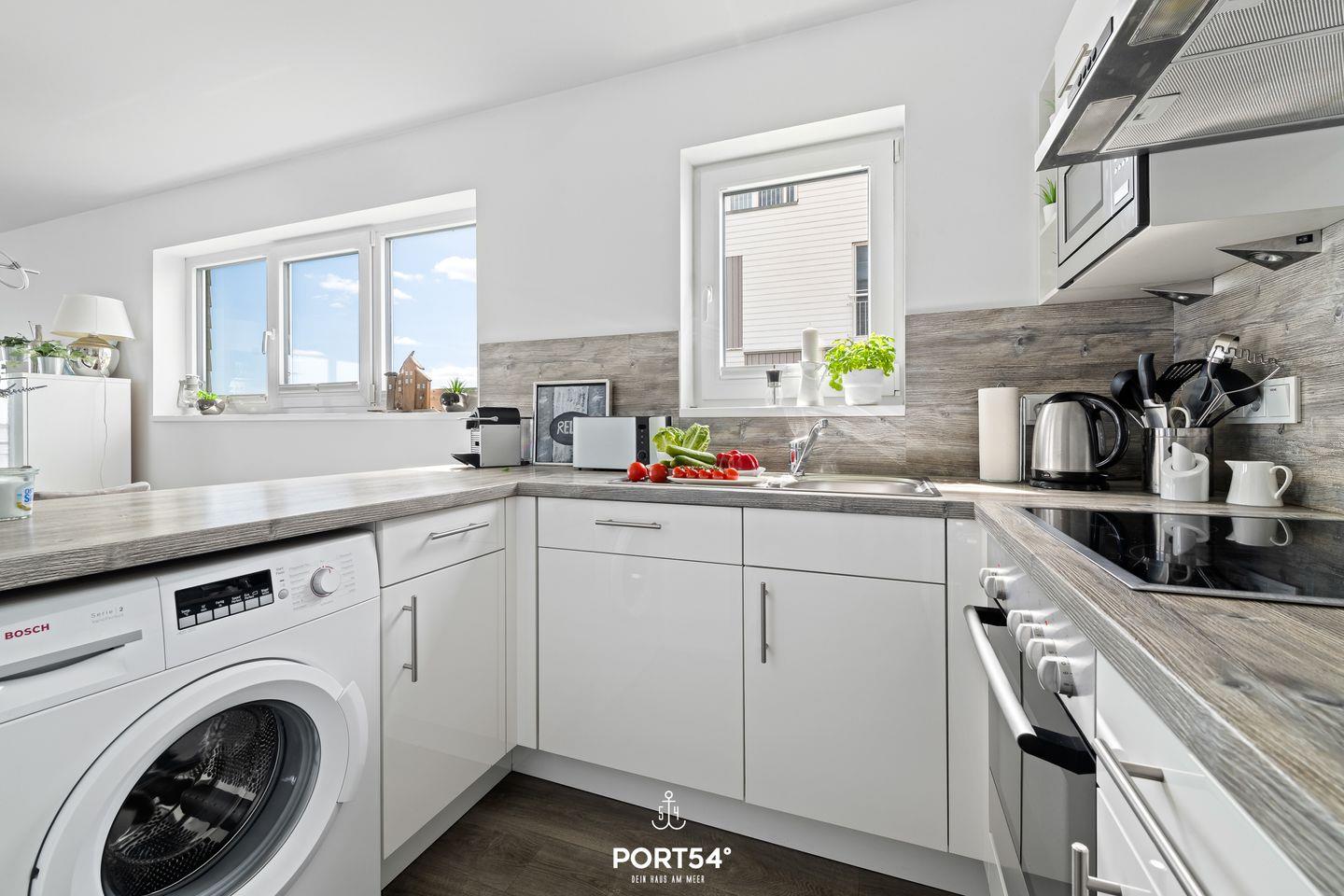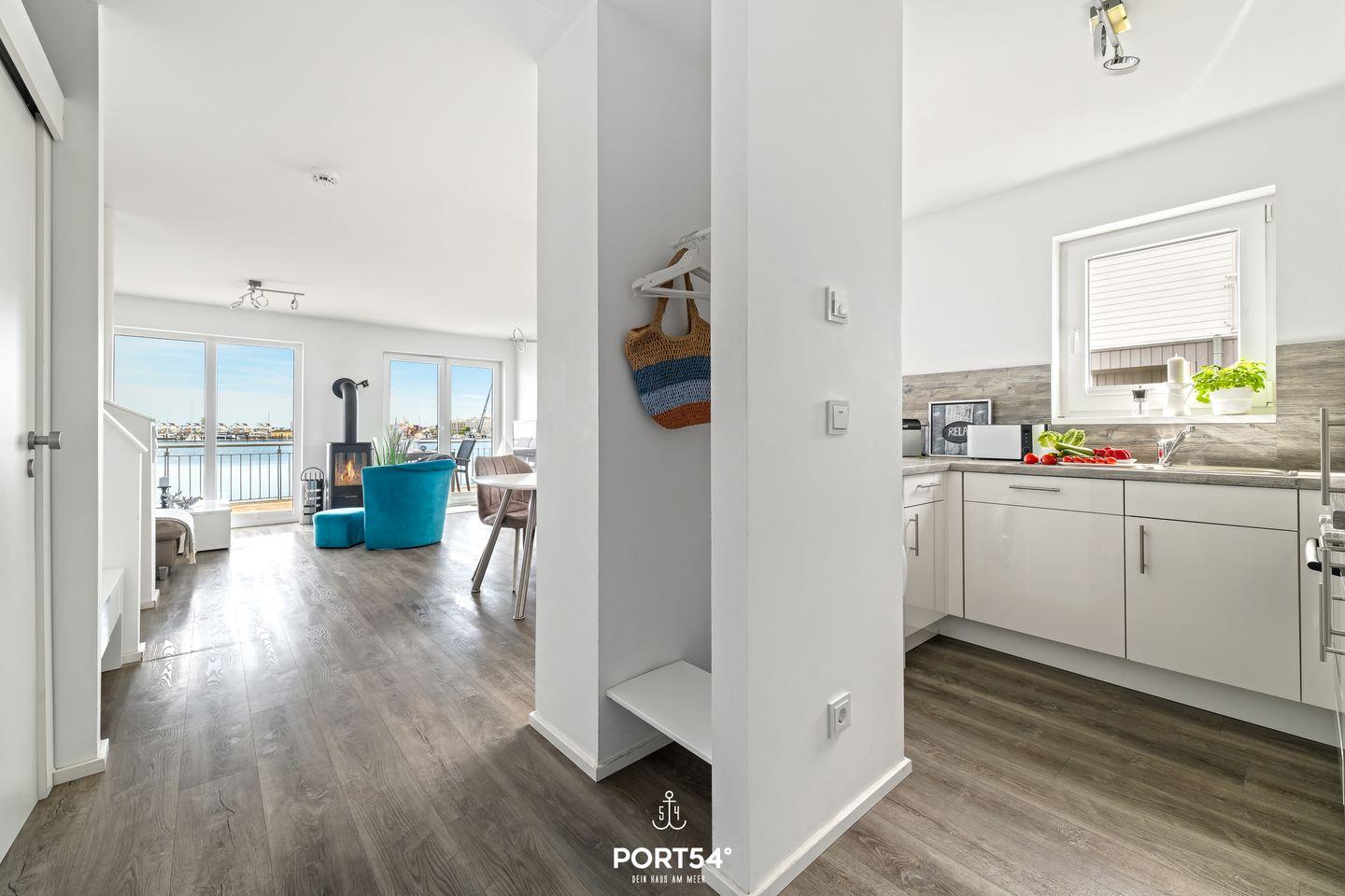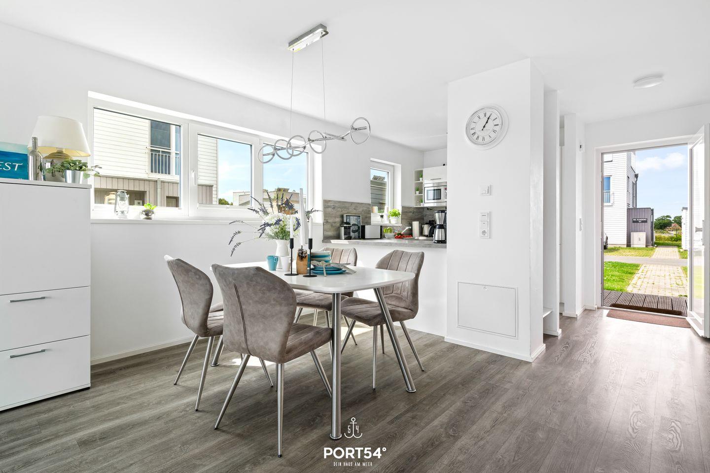 Der offene Wohn- und Essbereich des Strandnests ist das Herzstück des Hauses. Hier trifft stilvolles Design auf Gemütlichkeit. Der gemütliche Kamin sorgt auch an kühleren Tagen für eine behagliche Atmosphäre. Die moderne Küche ist voll ausgestattet und lässt keine Wünsche offen. Ob ein romantisches Dinner zu zweit oder ein geselliger Abend mit Familie und Freunden – dieser Raum ist perfekt für unvergessliche Momente.
