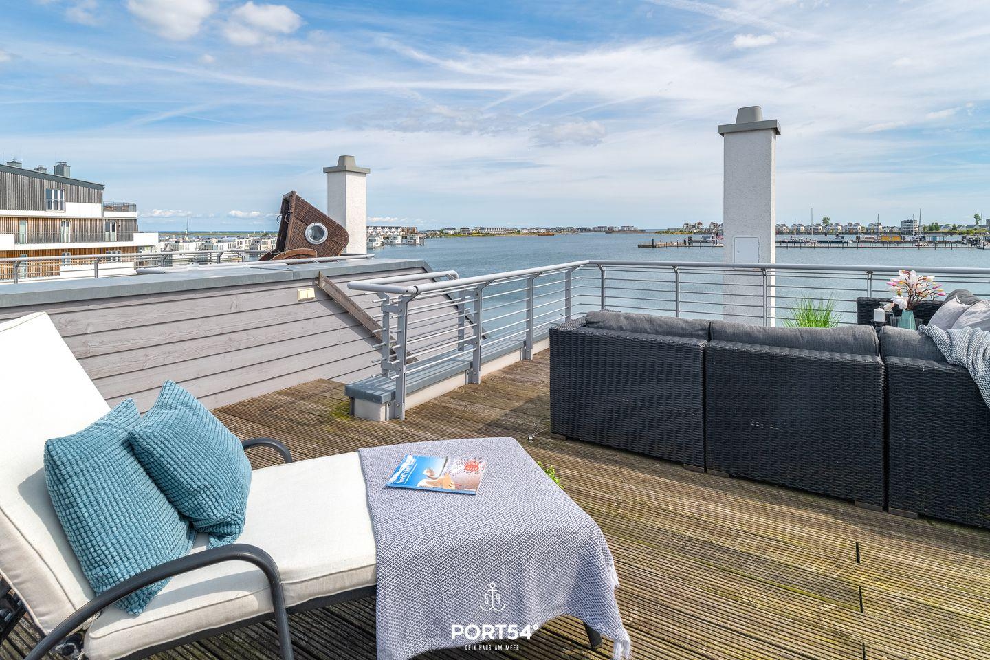 Ein Highlight des Strandnests ist die großzügige Dachterrasse, von der aus Du einen atemberaubenden 360°-Panoramablick auf die Schlei, die Schleimündung, das OstseeResort und das Hafenbecken genießen kannst. Hier kannst Du morgens Deinen Kaffee in der Sonne trinken, tagsüber ein Sonnenbad nehmen oder abends bei einem Glas Wein den Sonnenuntergang beobachten.
