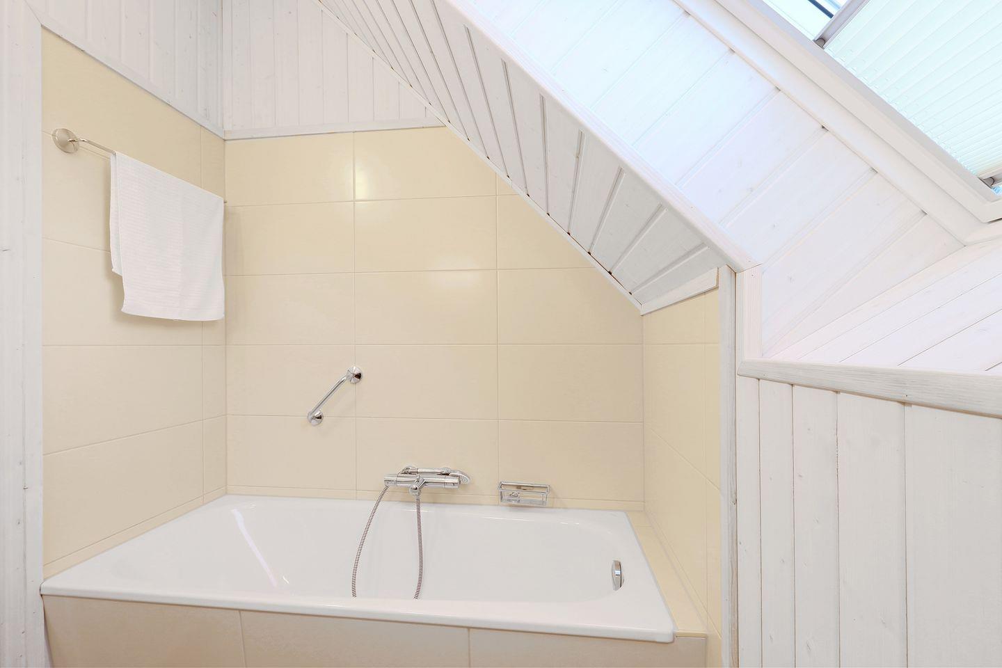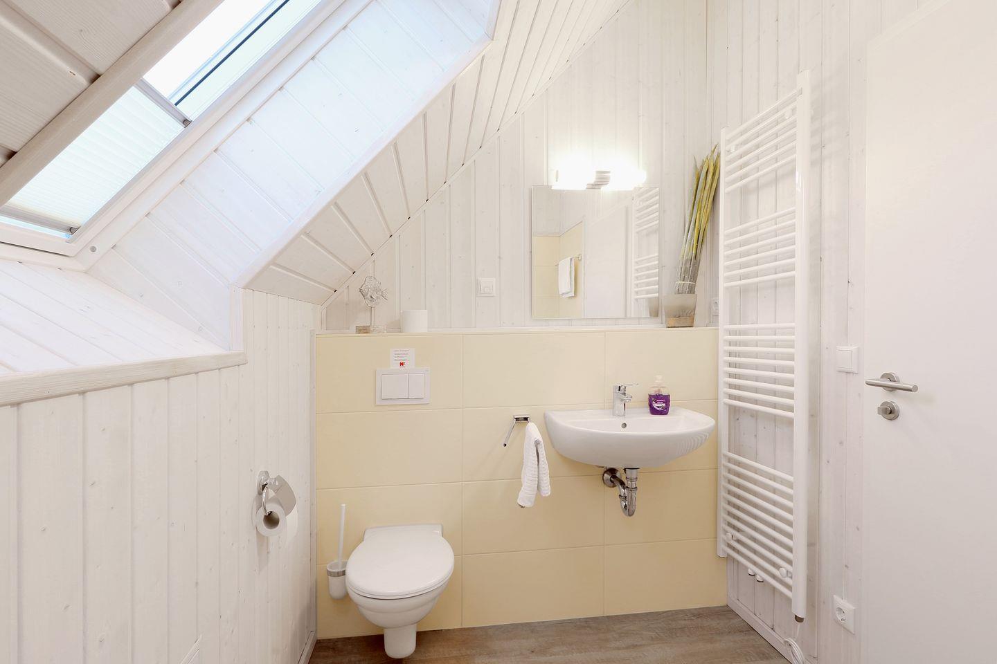 Ein Badezimmer mit Fenster und Sichtschutz befindet sich im Erdgeschoss. Es ist mit einer Dusche, einer Handtuchheizung und dem Highlight: einer Infrarot-Sauna ausgestattet. Hier kannst Du Dich an kalten Tagen aufwärmen und entspannen. Das weitere Badezimmer befindet sich im Obergeschoss und bietet ebenfalls ein Fenster mit Sichtschutz, eine Handtuchheizung und eine Duschwanne.