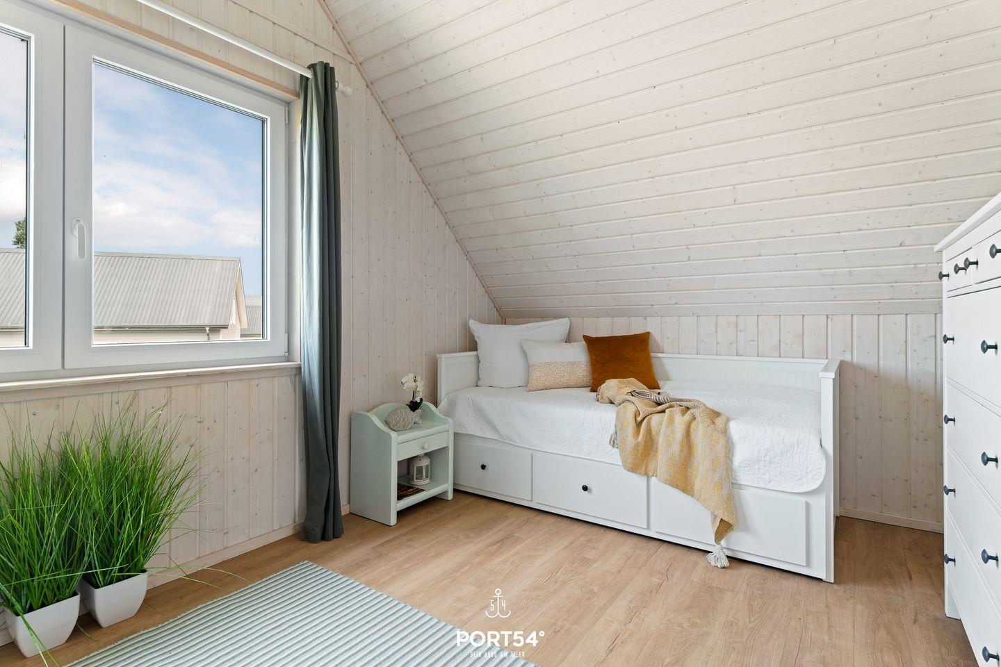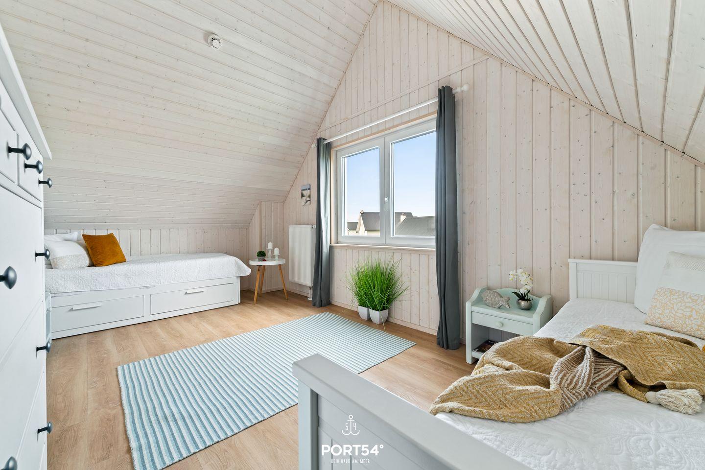 Im Obergeschoss findest Du zwei Schlafzimmer, eines verfügt über ein gemütliches Doppelbett (200 x 200 cm) mit Blick auf die Ostsee, das zweite über zwei Einzelbetten. Eines der beiden Betten lässt sich ausziehen, so gewinnt man einen weiteren Schlafplatz (80 x 200 cm). Ebenfalls im Obergeschoss findest Du ein Badezimmer mit Fenster, ausgestattet mit einer Badewanne zum Entspannen, einem WC und einer Handtuchheizung.