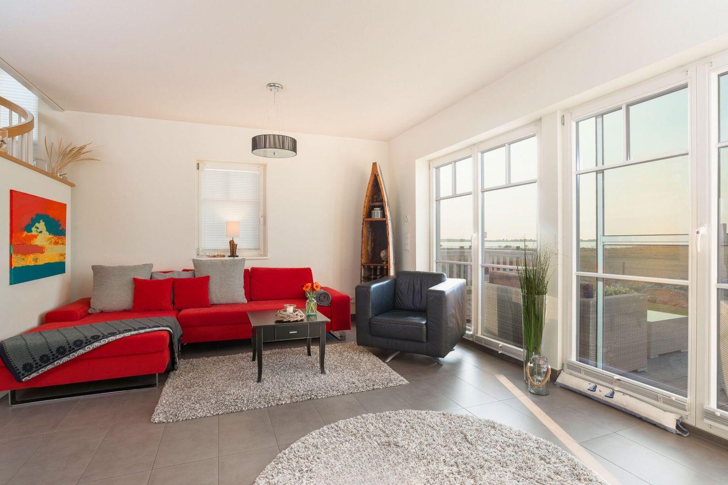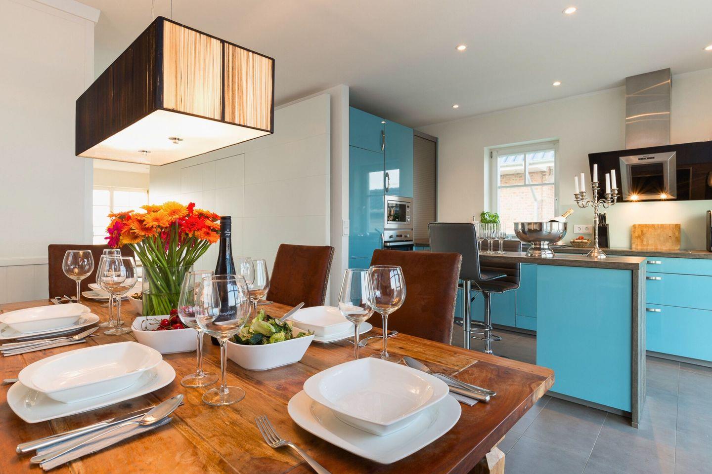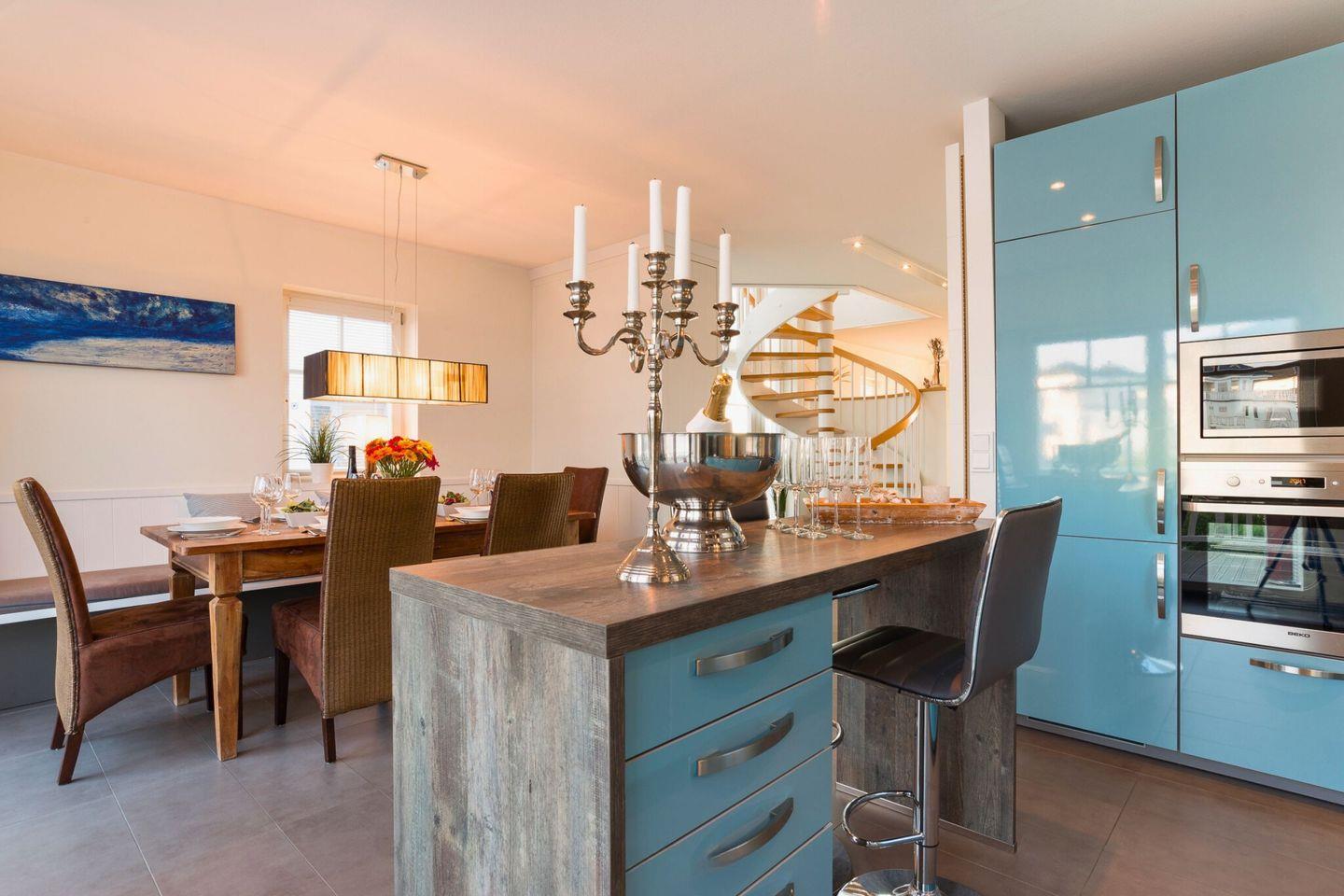 Das Ferienhaus "Strandhaus La Vela" besticht durch ein offenes, lichtdurchflutetes Erdgeschoss mit Wasserblick auf beiden Seiten. Der großzügige Wohnbereich, mit Blick auf die Ostsee und Schleimünde, ist mit einem gemütlichen Ecksofa, einem Kamin, einer umfangreichen Bibliothek und einem großen Flachbildfernseher ausgestattet ist. Die vollständig eingerichtete Küche, mit Blick auf die Olpenitz Badebucht, lässt keine Wünsche offen, sodass Sie in guter Gesellschaft köstliche Mahlzeiten zubereiten können. Vom Wohnbereich aus gelangen Sie direkt auf die große Terrasse, die einen herrlichen Blick auf das Naturschutzgebiet von Schleimünde bietet, von der Küche aus kommen Sie auf die Sonnenterrasse mit Blick auf die Badebucht.