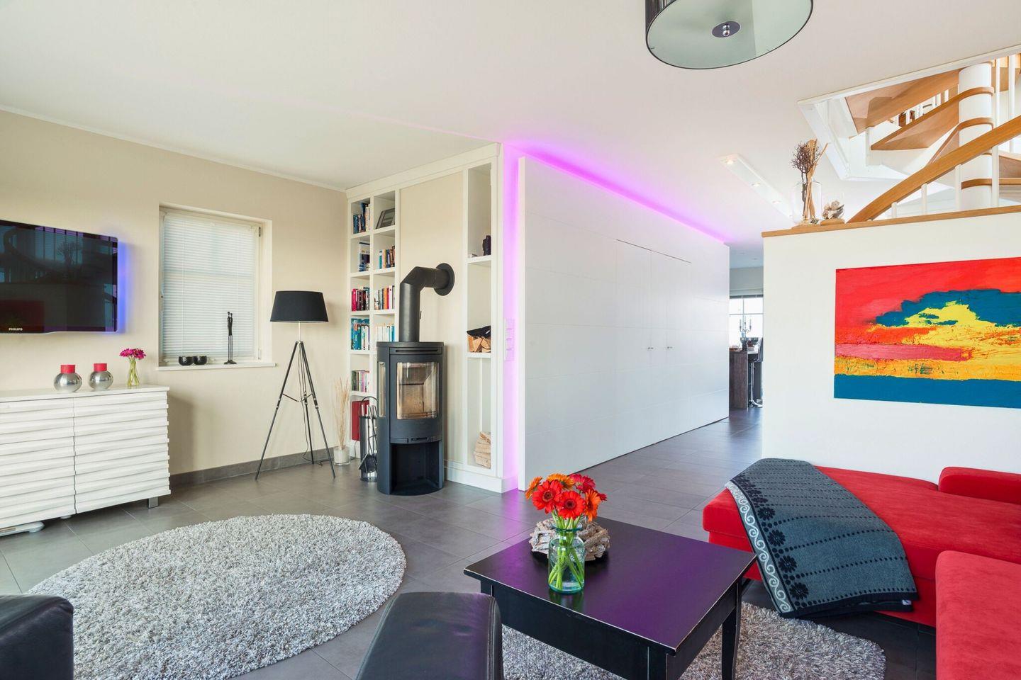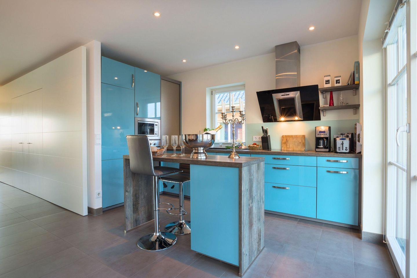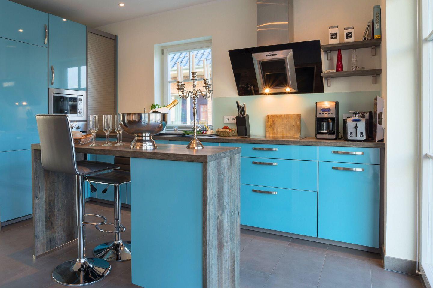 Das Ferienhaus "Strandhaus La Vela" besticht durch ein offenes, lichtdurchflutetes Erdgeschoss mit Wasserblick auf beiden Seiten. Der großzügige Wohnbereich, mit Blick auf die Ostsee und Schleimünde, ist mit einem gemütlichen Ecksofa, einem Kamin, einer umfangreichen Bibliothek und einem großen Flachbildfernseher ausgestattet ist. Die vollständig eingerichtete Küche, mit Blick auf die Olpenitz Badebucht, lässt keine Wünsche offen, sodass Sie in guter Gesellschaft köstliche Mahlzeiten zubereiten können. Vom Wohnbereich aus gelangen Sie direkt auf die große Terrasse, die einen herrlichen Blick auf das Naturschutzgebiet von Schleimünde bietet, von der Küche aus kommen Sie auf die Sonnenterrasse mit Blick auf die Badebucht.