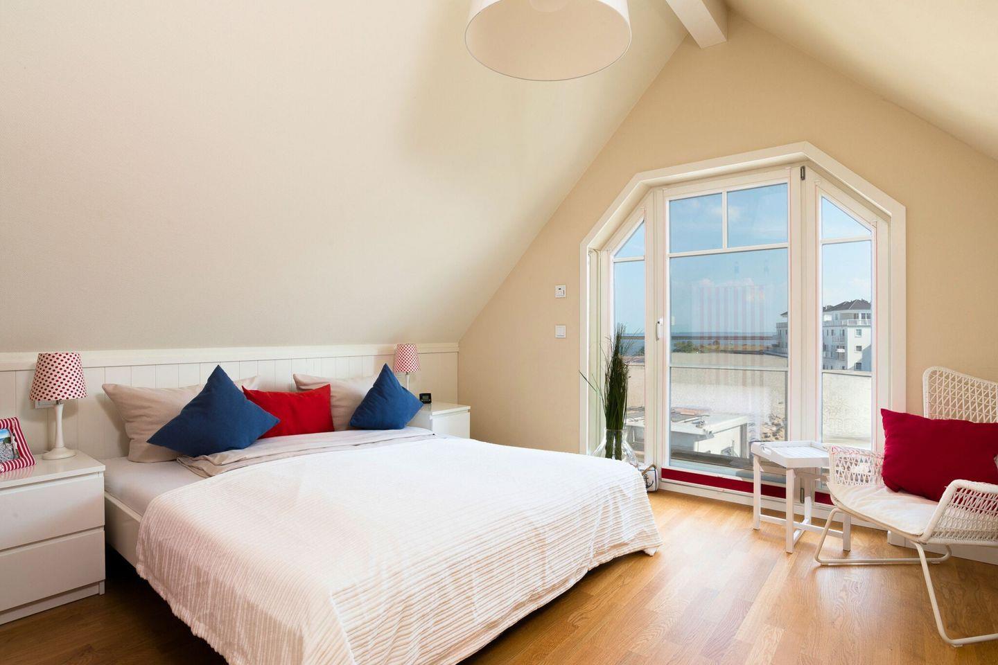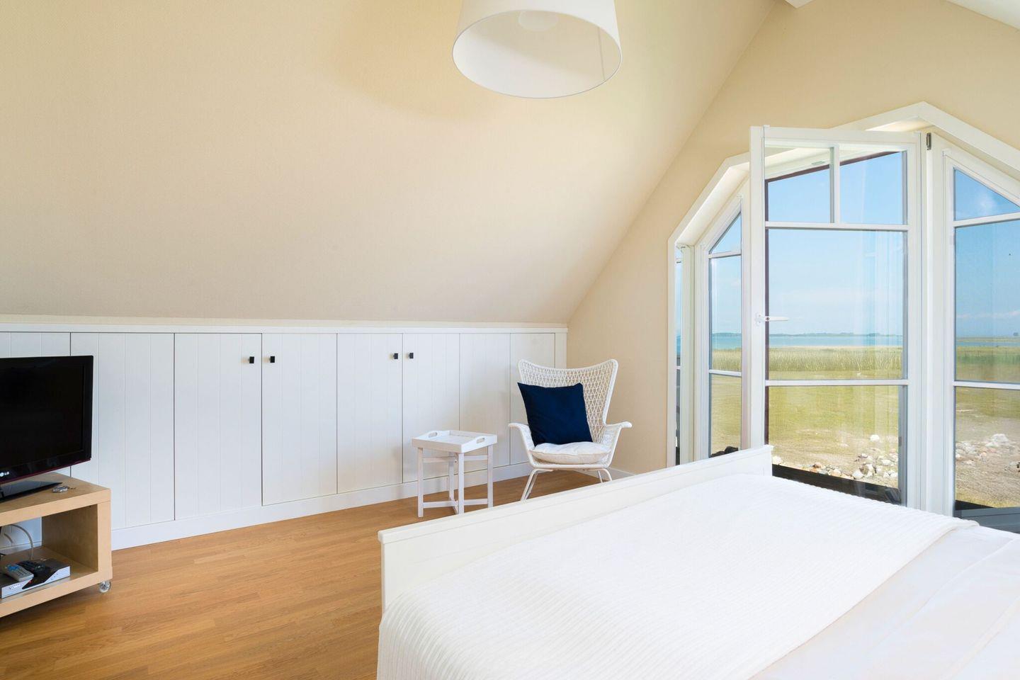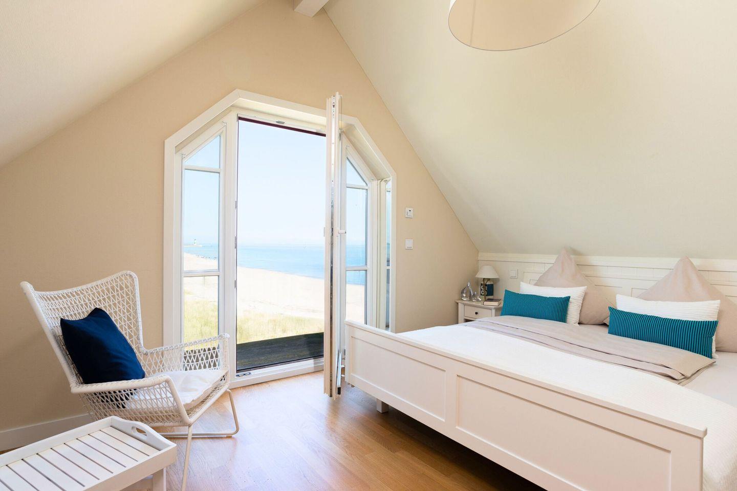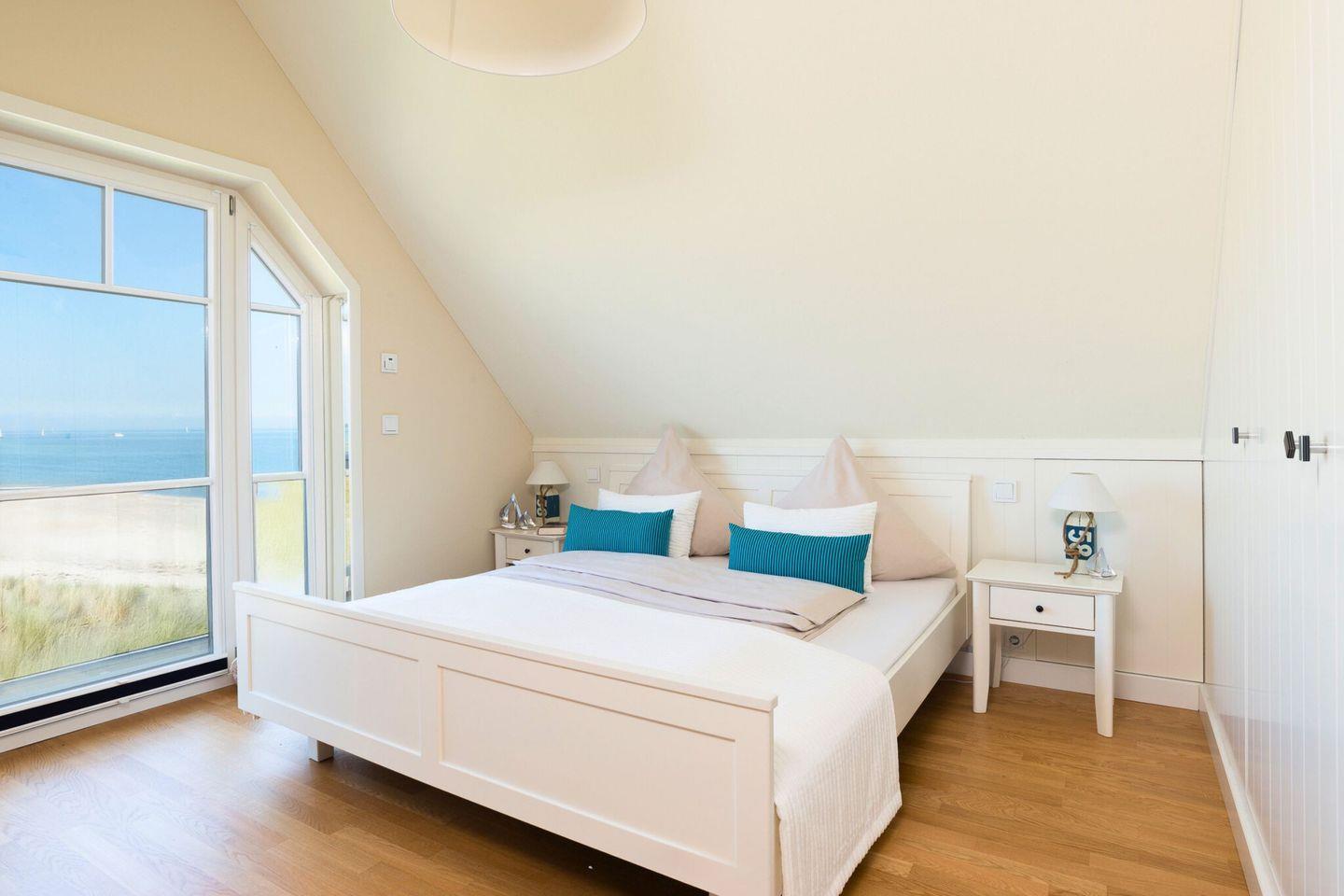 Im Obergeschoss befinden sich zwei helle, hochwertig eingerichtete Schlafzimmer mit großen Doppelbetten, die einen erholsamen Schlaf garantieren. Jedes Schlafzimmer bietet einen traumhaften Blick auf die Ostsee. Der Masterbedroom ist mit einem Fernseher ausgestattet. Das moderne Badezimmer im Obergeschoss verfügt über eine finnische Sauna und eine Dusche, ideal für entspannende Momente.