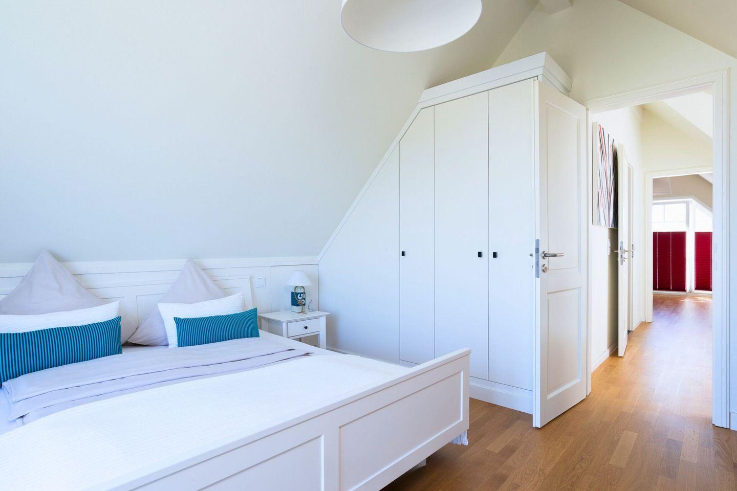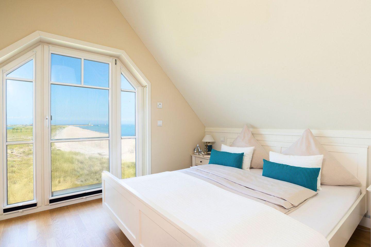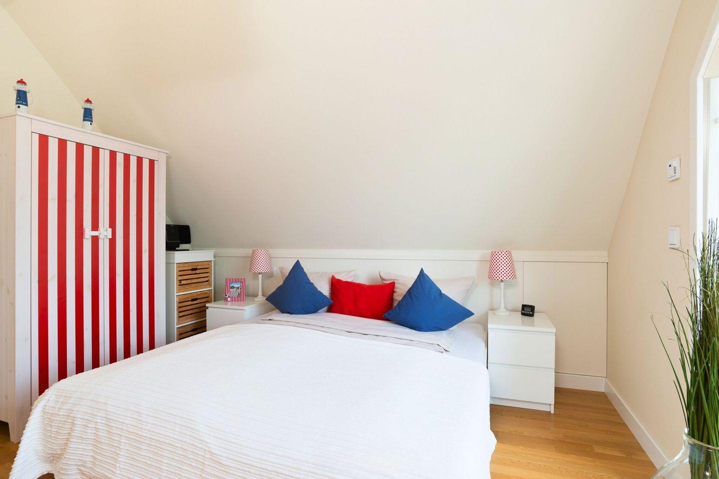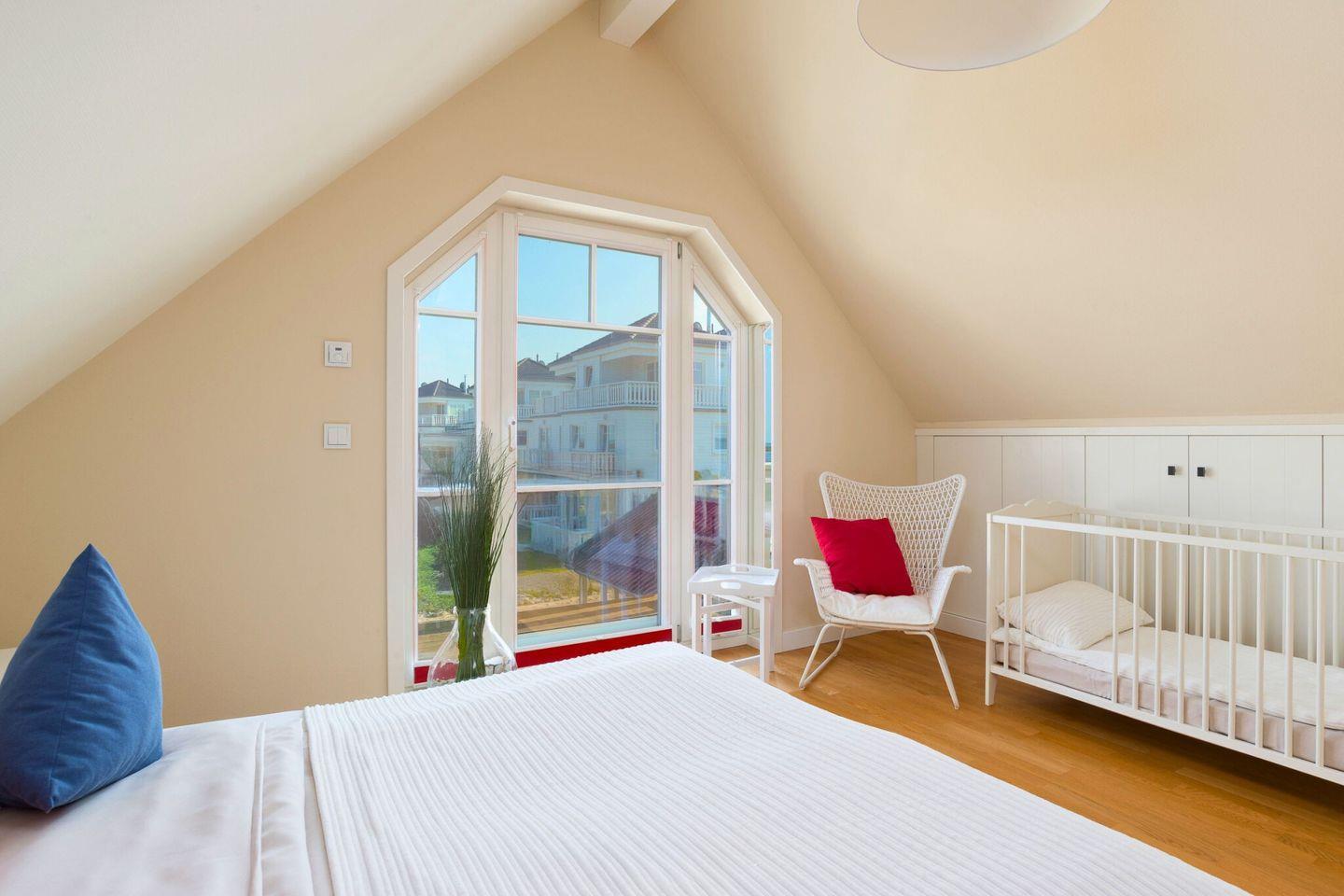 Im Obergeschoss befinden sich zwei helle, hochwertig eingerichtete Schlafzimmer mit großen Doppelbetten, die einen erholsamen Schlaf garantieren. Jedes Schlafzimmer bietet einen traumhaften Blick auf die Ostsee. Der Masterbedroom ist mit einem Fernseher ausgestattet. Das moderne Badezimmer im Obergeschoss verfügt über eine finnische Sauna und eine Dusche, ideal für entspannende Momente.