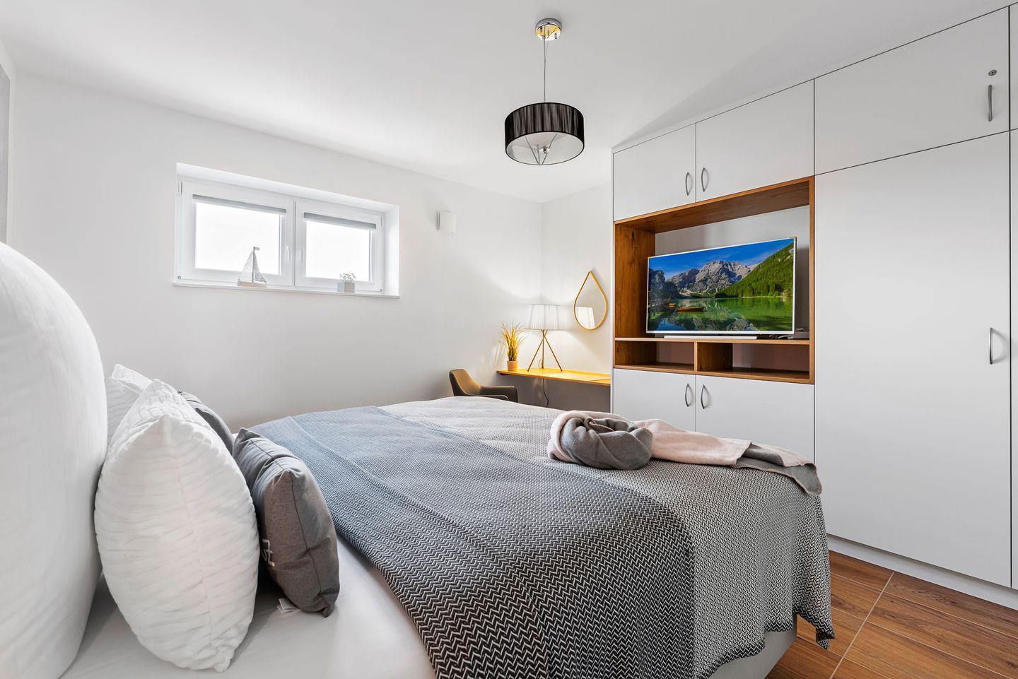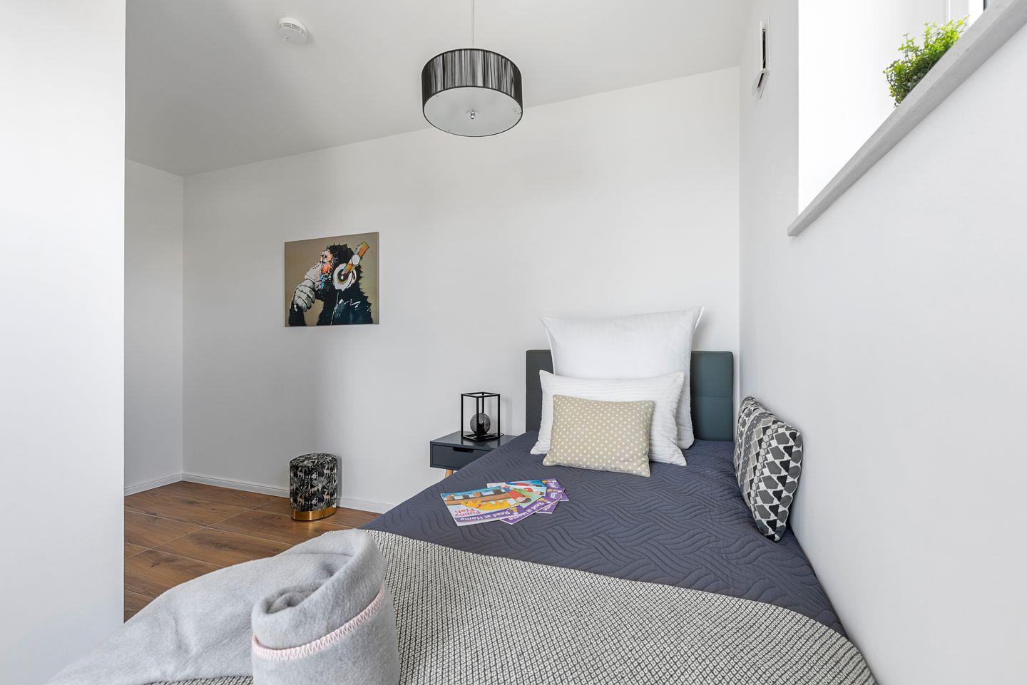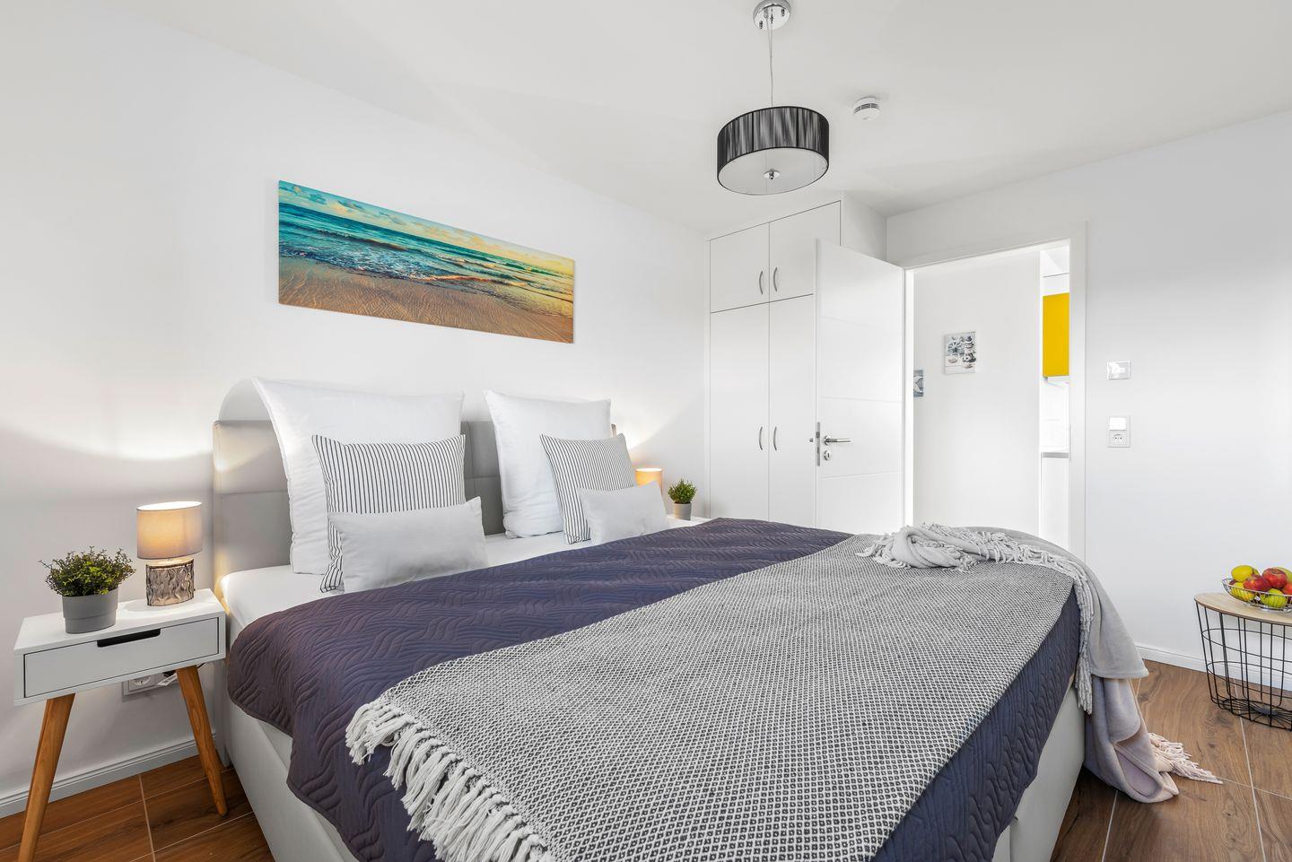 Zwei große Schlafzimmer mit integrierten Kleiderschränken, hochwertigen Boxspringbetten, Schreibtisch und Smart-TV bieten die perfekte Erholung in der Nacht. Das liebevoll eingerichtete Einzelzimmer ist mit Kinderspielzeug, einem Kleiderschrank und kindgerechten Bildern ausgestattet.
