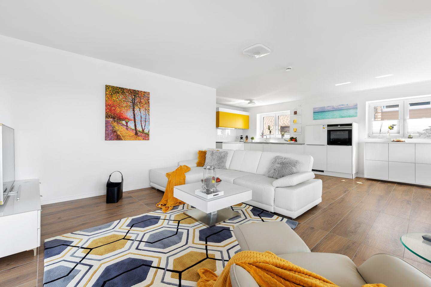 Das Apartment Brise bietet auf 113 qm genügend Platz für 5 Personen. Der große Wohn-Essbereich mit Südausrichtung, bodentiefen Fenstern und Blick auf die einlaufenden Segelyachten in die Marina Olpenitz bieten das perfekte Panorama, um einen erholsamen Urlaub zu genießen. Die bequeme Couch mit Schlaffunktion, der Smart-TV und der bequeme Lesesessel runden die stilvolle Einrichtung dieses besonderen Apartments ab.
