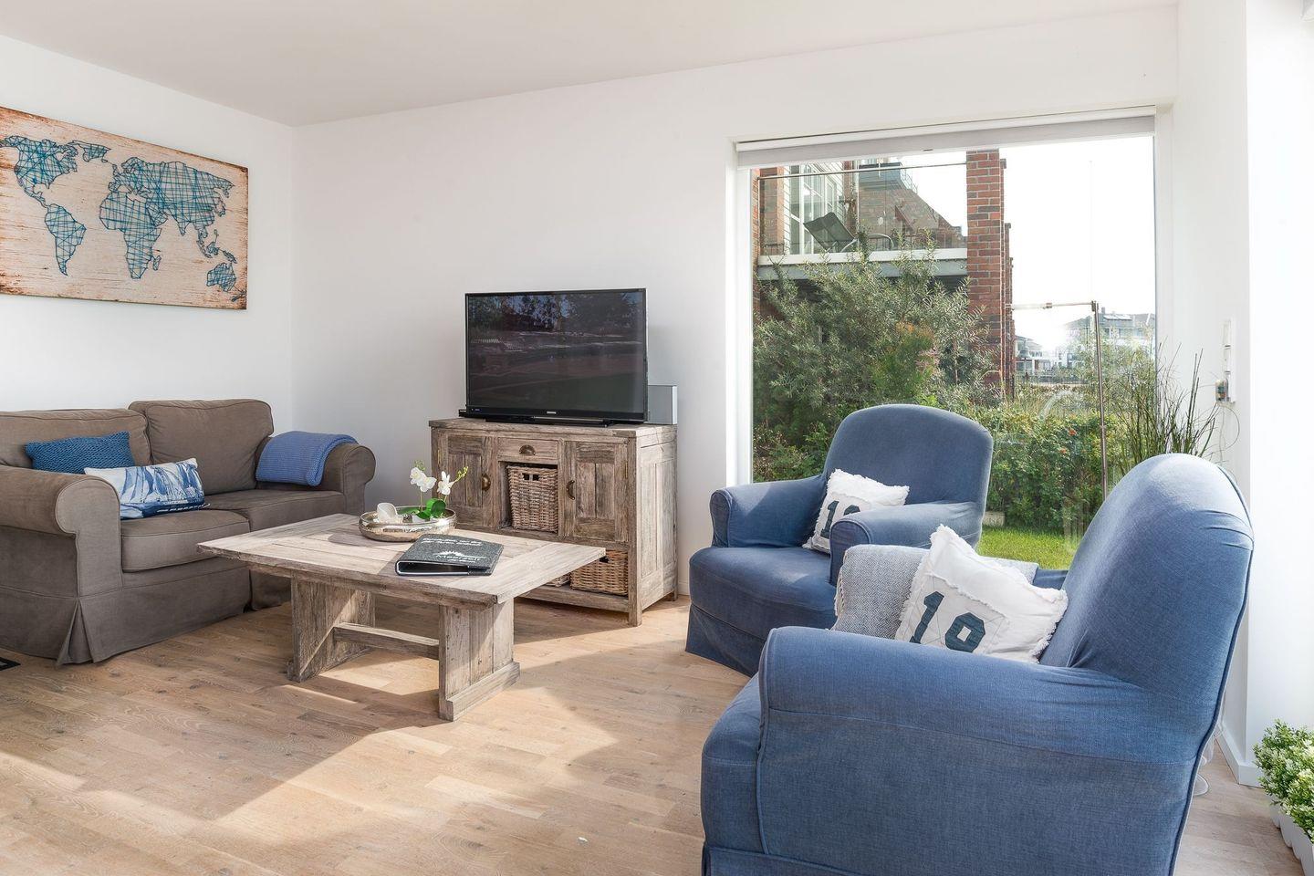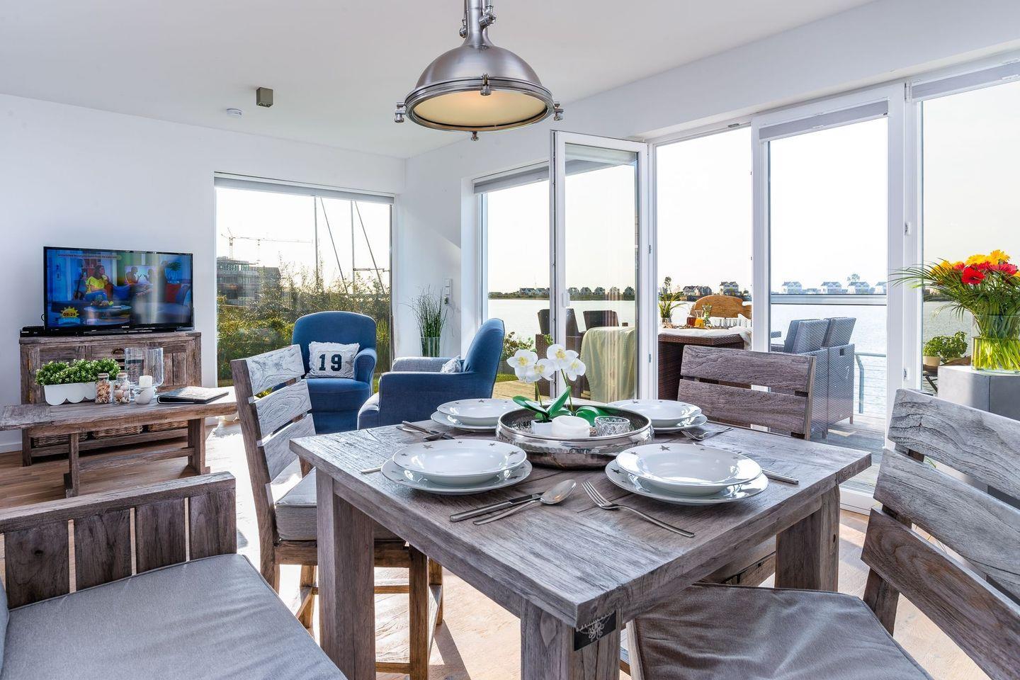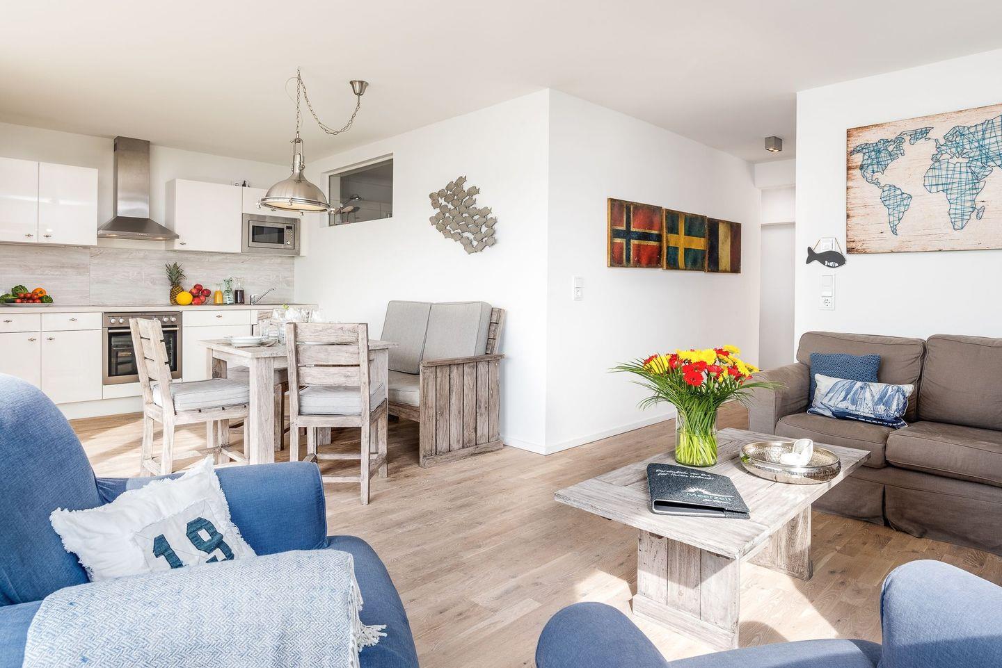 Auf der großen Sonnenterrasse mit Südausrichtung, hochwertigen Loungemöbeln, Strandkorb, Sonnenschirm und Grill können sie vom Alltag ausspannen und den Segelbooten beim Ein- und Auslaufen zusehen. In dieser liebevoll und sehr stilvoll eingerichteten Ferienwohnung kann man den Urlaub in vollen Zügen genießen und sich rundum wohlfühlen.