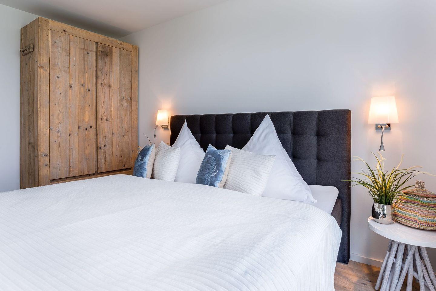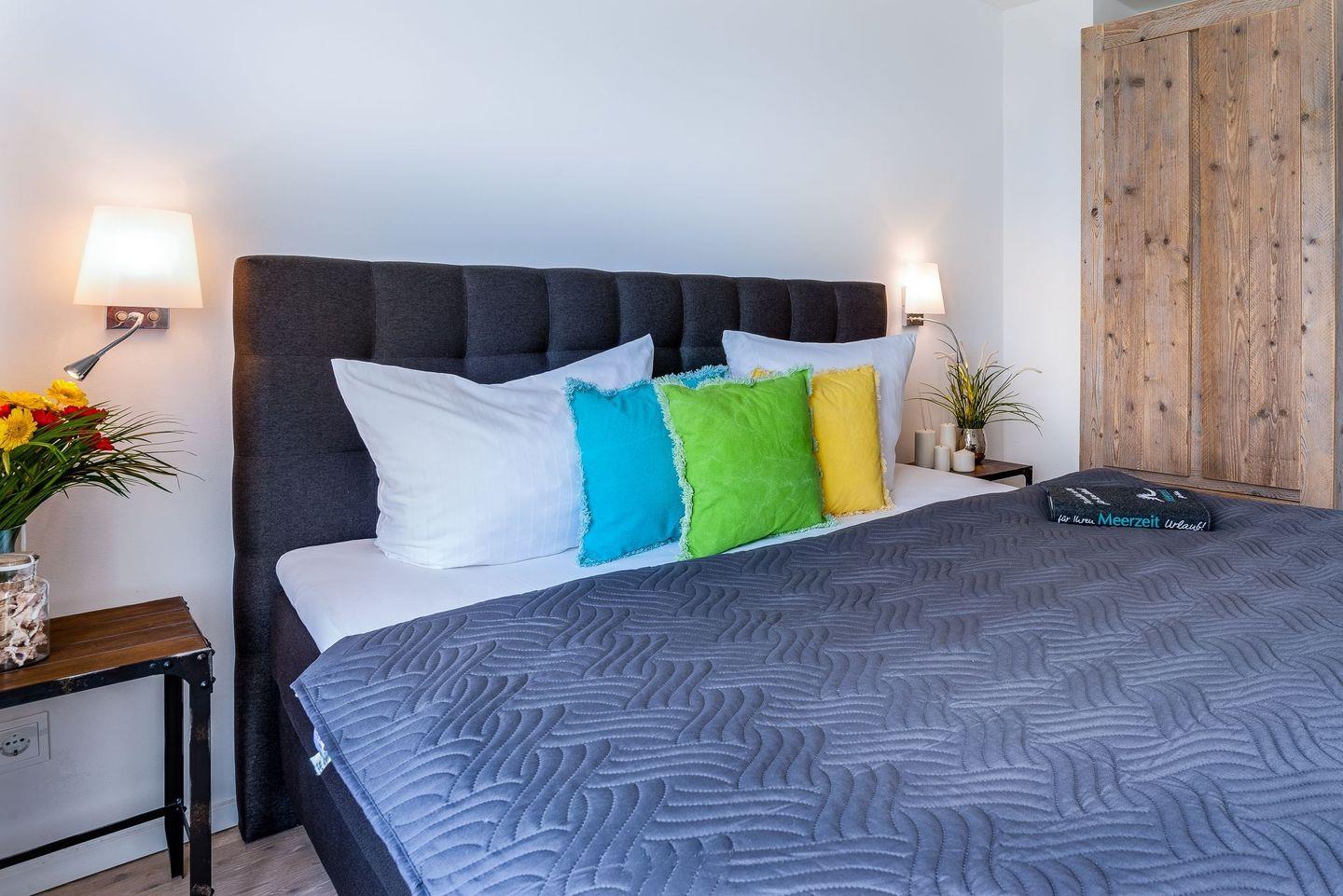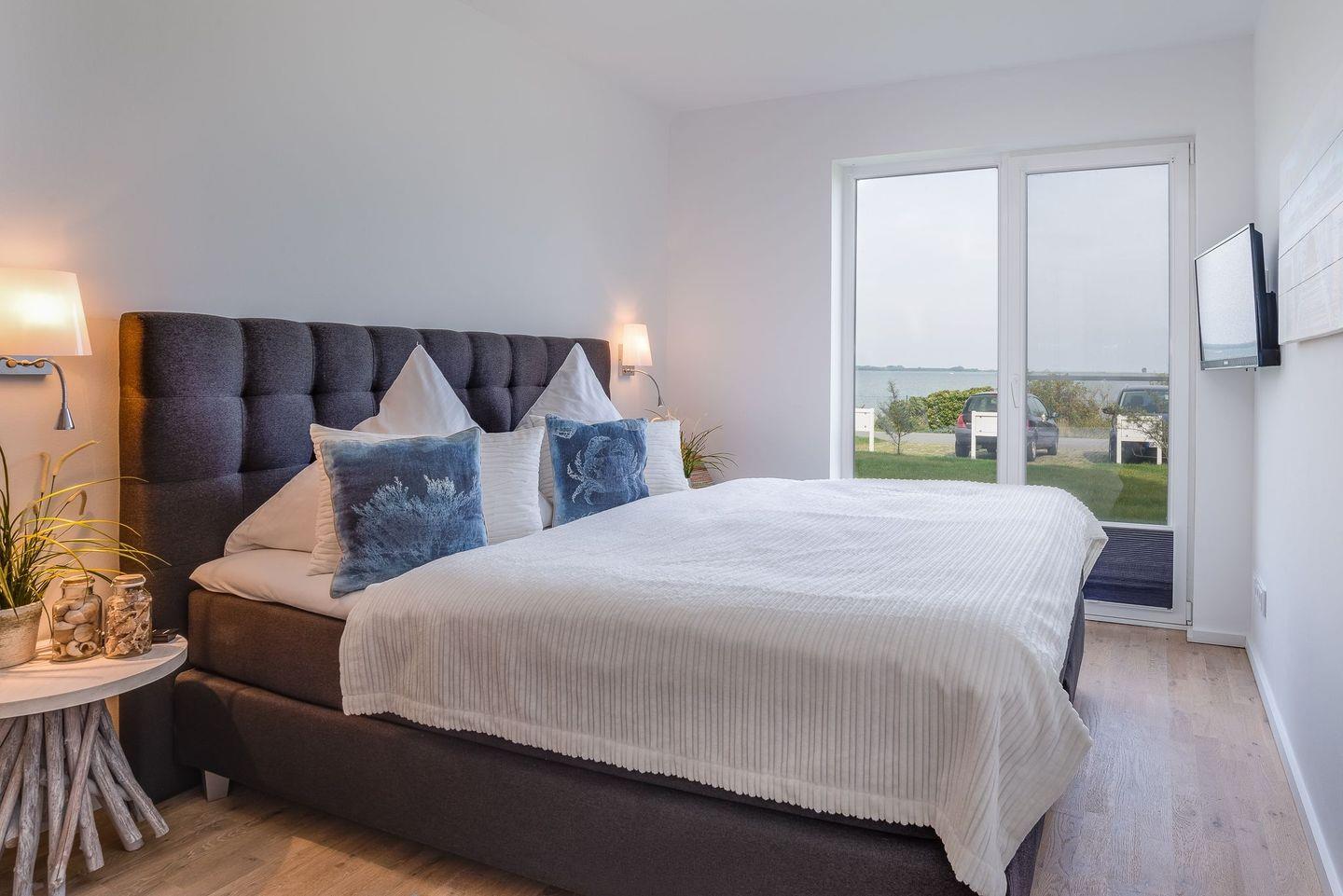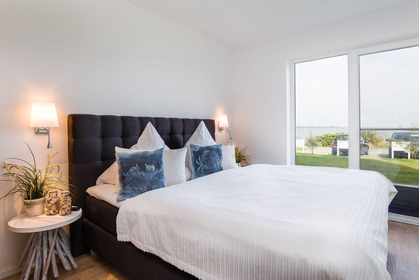 Die traumhaft eingerichteten Schlafzimmer mit hochwertigen Boxspringbetten (1,80 x 2,00) sind nach Nord/Ost ausgerichtet und garantieren den Blick auf einen wunderbaren Sonnenaufgang über der Schleimündung mit Leuchtturm oder aber den Sonnenuntergang über Maasholm.