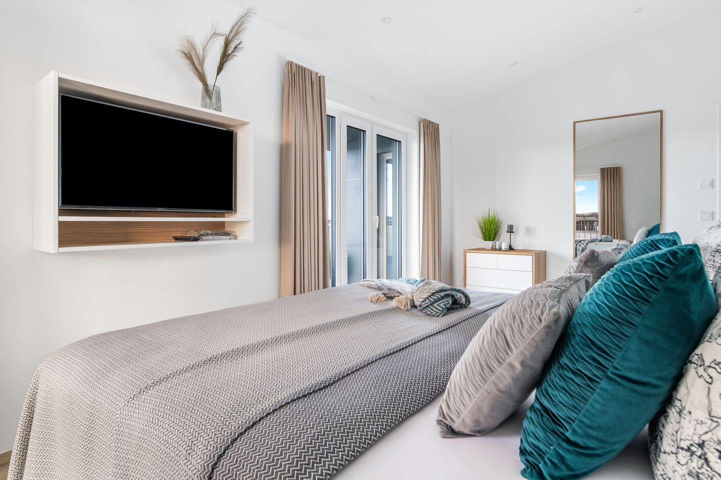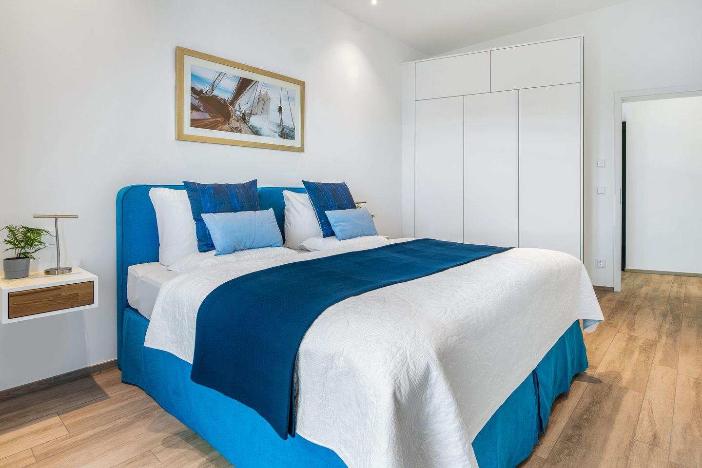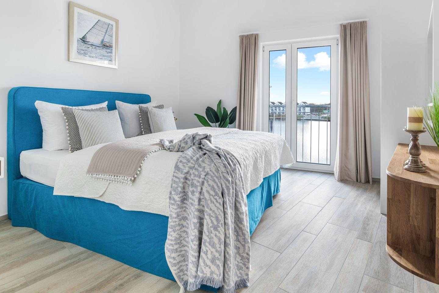 Die Schlafzimmer punkten allesamt mit dem wunderschönen Blick auf das Wasser. Zwei von den insgesamt vier Schlafzimmern haben direkten Zugang zu den beiden Dachterrassen (22 m² und 44 m²). Beim morgendlichen Kaffee lässt sich der Sonnenaufgang und der Schiffverkehr beobachten. Für die perfekte Entspannung stehen dort zwei gemütliche Lounge Möbel. Drei Schlafzimmer verfügen über 1,80m große Boxspringbetten. Das vierte Schlafzimmer ist mit einer Schlafcouch für bis zu zwei Personen ausgestattet.