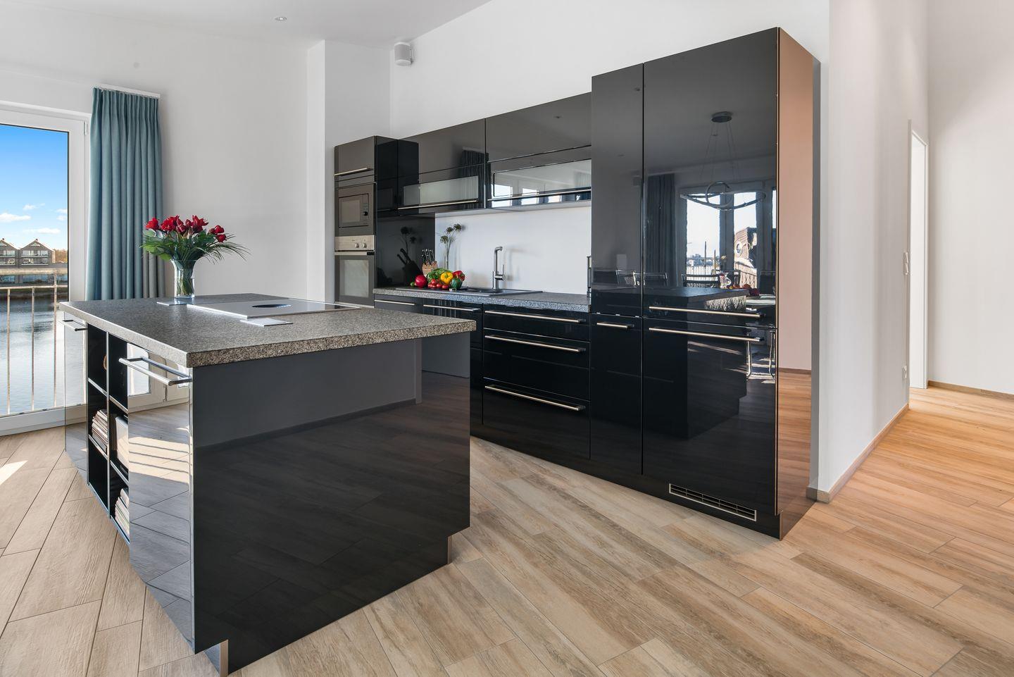 Der offen gestaltete, lichtdurchflutete Wohn- und Essbereich lädt zu kulinarischen und geselligen Abenden ein. Am großen Esstisch finden 8 Personen bequem Platz. So können Sie beim Dinner den Blick über das Wasser durch die riesigen Panoramafenster genießen. Die Küche lässt keine Wünsche offen, sie ist rundum ausgestattet und bietet Hobbyköchen Komfort in Ausstattung und Design. Vom Frühstücken in der Morgensonne bis hin zum gemeinsamen Sundowner auf der fast 44 m² großen Dachterrasse mit Blick auf den Hafen, die Schlei und die Ostsee ist alles möglich.