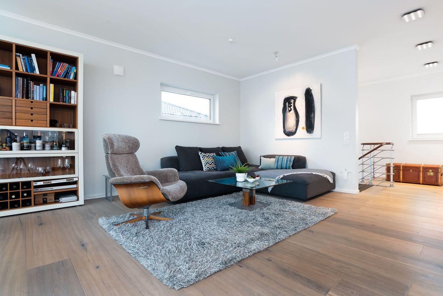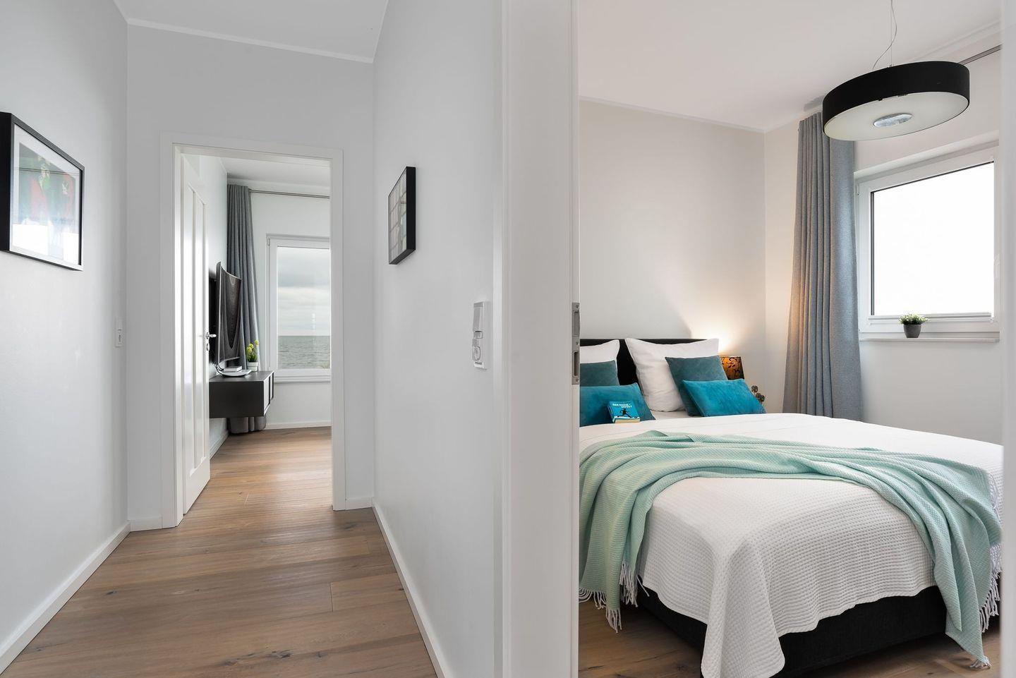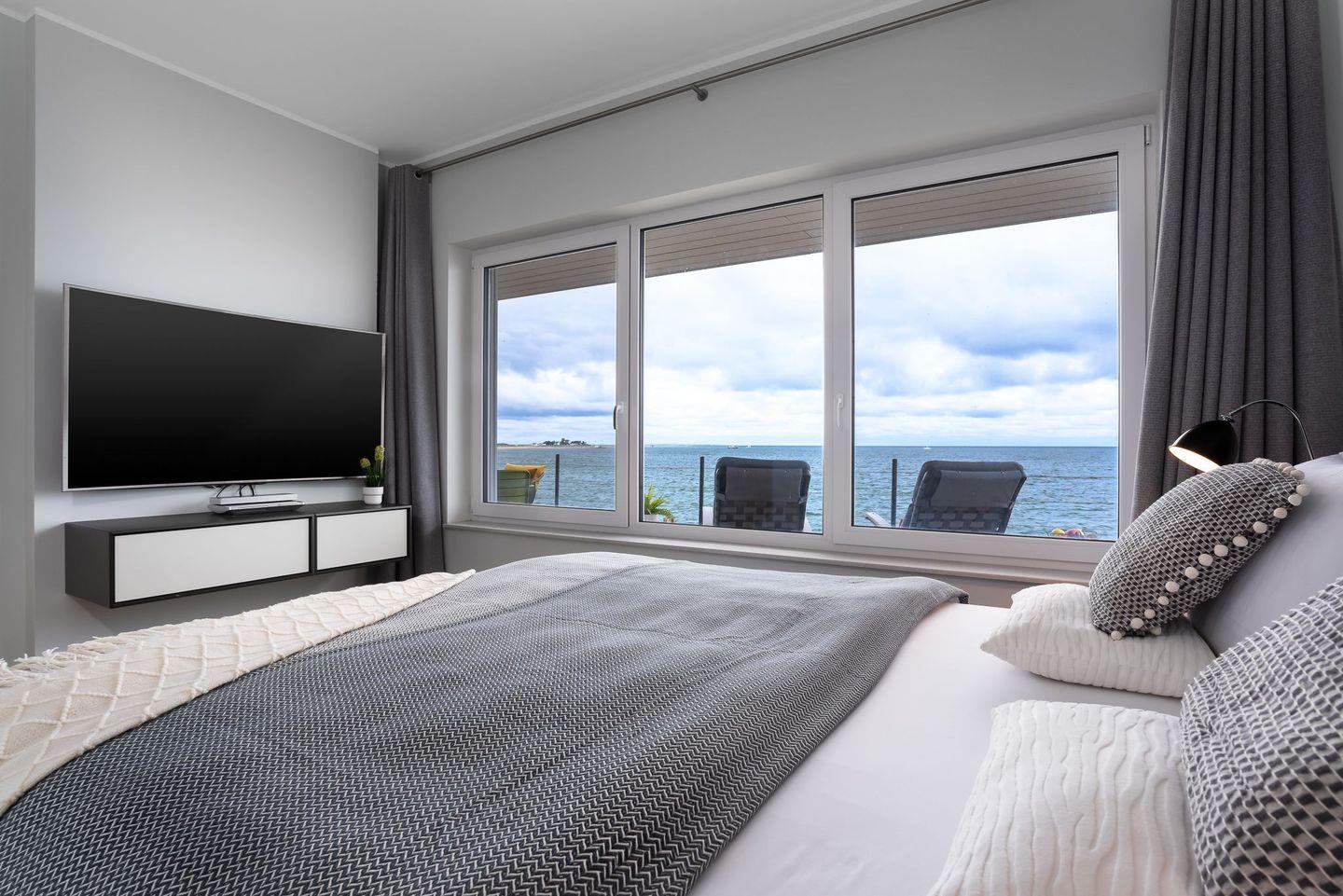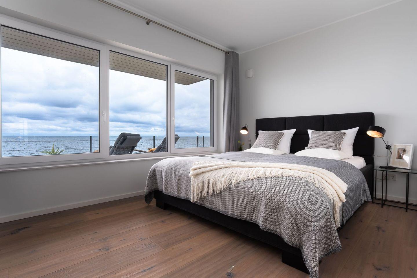 Eine wunderschöne Holztreppe führt durch das lichtdurchflutete Treppenhaus in das Obergeschoss, welches der Dreh- und Angelpunkt in dieser Villa ist. Hier wurde der Blick auf die Ostsee bis nach Dänemark perfektioniert. Eine große Panoramaglasfront, welche das Haus überragend ist, wurde über die gesamte Breite der Villa verbaut und bietet so aus jedem Winkel einen unverbauten Ausblick, der seinesgleichen sucht.