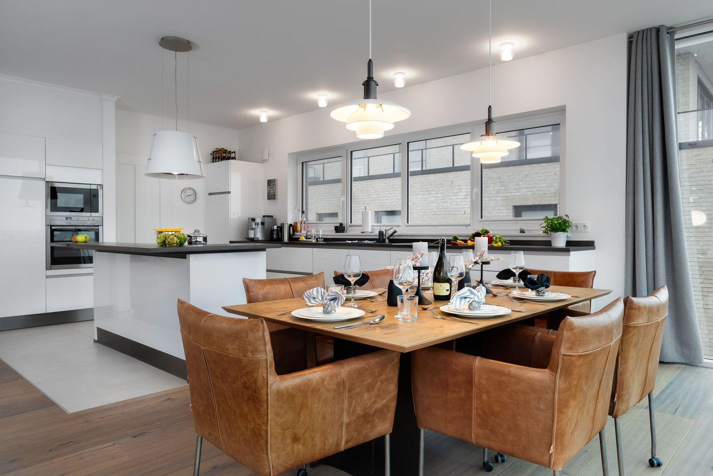 Das Obergeschoss besteht aus einem großen Raum, wobei hier an Großzügigkeit nicht gespart wurde. Die offene Küche mit hochwertiger Vollausstattung lädt zum Zubereiten von regionalen Köstlichkeiten ein. Geselliges Beisammensein und dabei den Sonnenuntergang über der Schleimündung genießen, dies ist an dem großen Esstisch mit seiner bequemen Bestuhlung möglich. Wer es entspannter mag, legt sich in einen der Relaxsessel vor den Kamin und hat dabei das Gefühl, über dem Wasser zu schweben. Das gemütliche Sofa und der große Flatscreen fügen sich perfekt in diesen Raum ein, ohne dabei dem Charme des maritimen Ambientes das Funkeln zu nehmen.