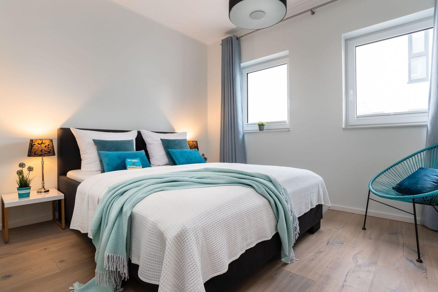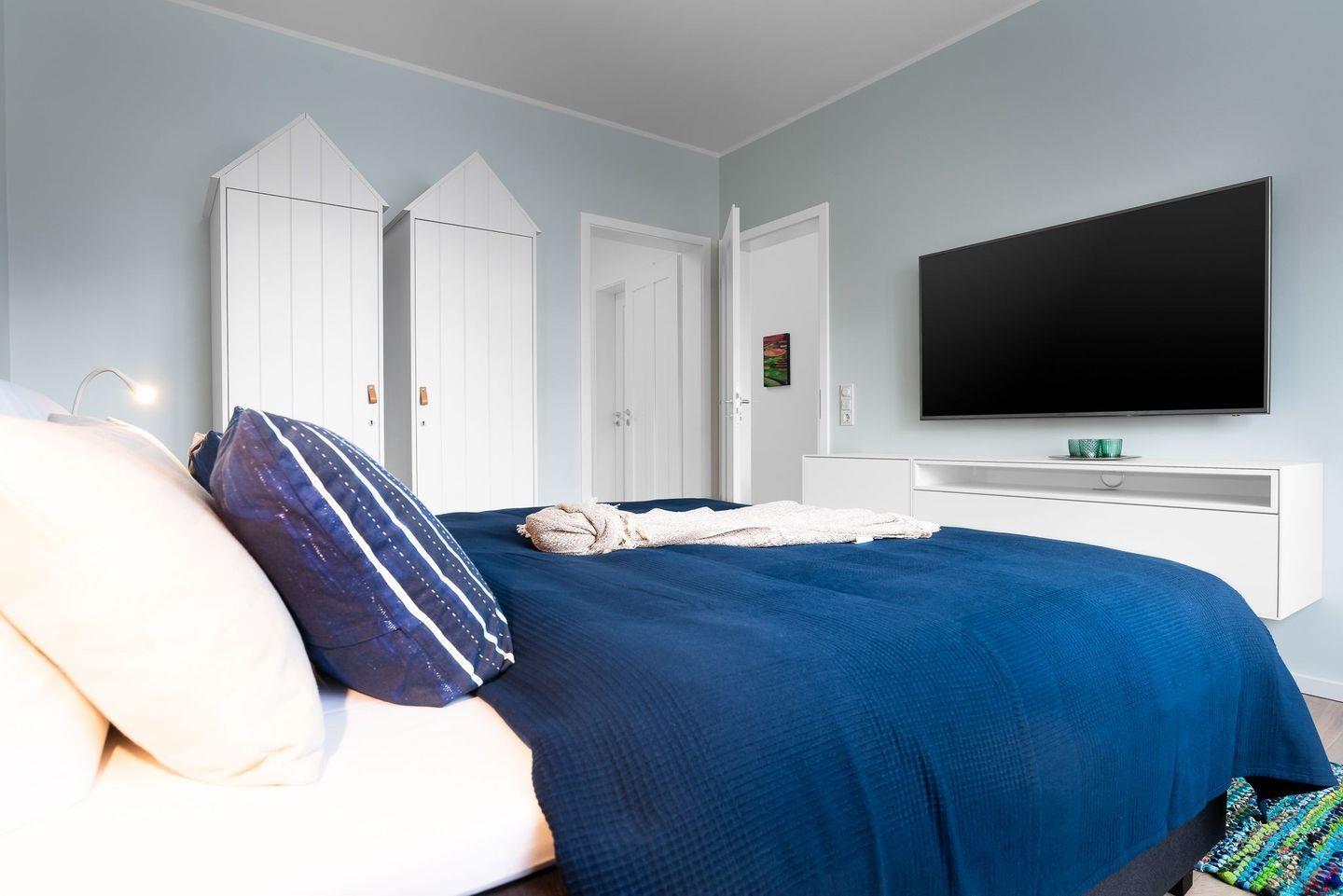 Im Erdgeschoss befindet sich der wundervolle Masterbedroom, welcher mit seinen großen Panoramafenstern direkten Ostseeblick beim Aufwachen verspricht. Das lichtdurchflutete, großzügige Badezimmer kann direkt vom Schlafzimmer aus betreten werden und bietet Wellness und Entspannung pur. Die frei stehende Badewanne vor dem großen Fenster ermöglicht beim Baden den Blick auf das Meer. Eine große finnische Sauna, eine Raindancedusche, Doppelwaschtisch und WC befinden sich ebenfalls in diesem luxuriösen Wellnesstempel.