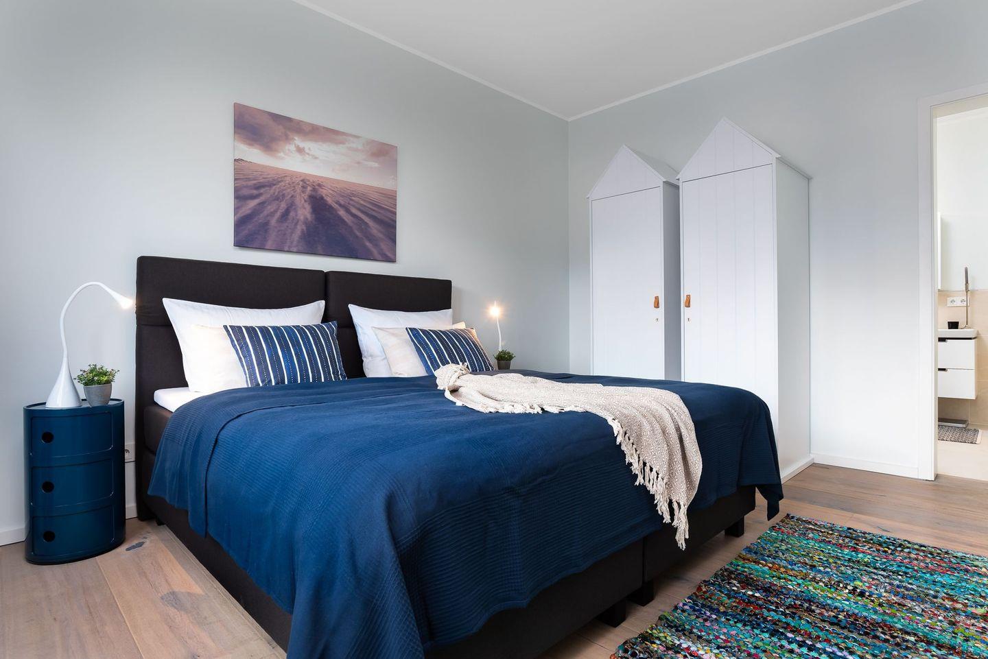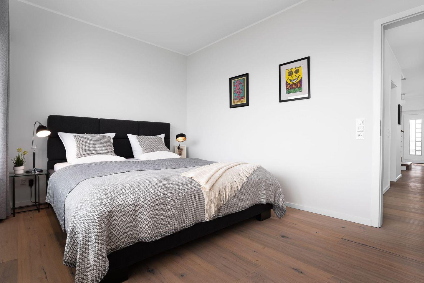 Für erholsame Nächte ist bestens gesorgt. Im wundervollen Masterbedroom im Erdgeschoss erwartet Sie ein Bett mit extralanger Liegefläche von 220 Zentimetern. Im rechten Schlafzimmer beträgt die Bettlänge 210 Zentimeter. Das vordere Schlafzimmer bietet zusätzliche Flexibilität, da das Doppelbett bei Bedarf in zwei einzelne Betten getrennt werden kann.