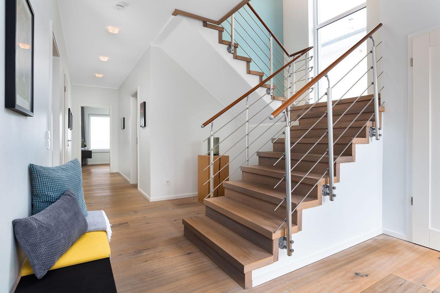 Bereits im Erdgeschoss empfängt Sie ein Eingangsbereich, welcher nicht nur großzügig gestaltet ist, sondern auch mit seinen edlen Eiche-Echtholzdielen Gemütlichkeit und Wärme ausstrahlt.