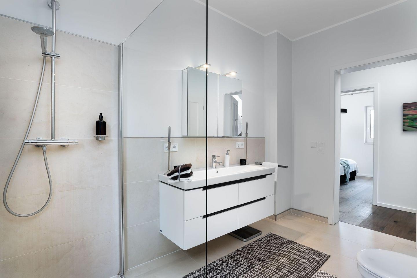 Von hier aus erschließt sich Ihr privater Wellnessbereich. Das lichtdurchflutete Badezimmer ist großzügig gestaltet und lädt zum Entspannen ein. Die frei stehende Badewanne vor dem großen Fenster eröffnet beim Baden den Blick auf das Meer. Eine finnische Sauna, eine Raindancedusche, ein Doppelwaschtisch sowie ein WC ergänzen diesen exklusiven Rückzugsort. Ein weiteres voll ausgestattetes Badezimmer steht im Erdgeschoss ebenfalls zur Verfügung.