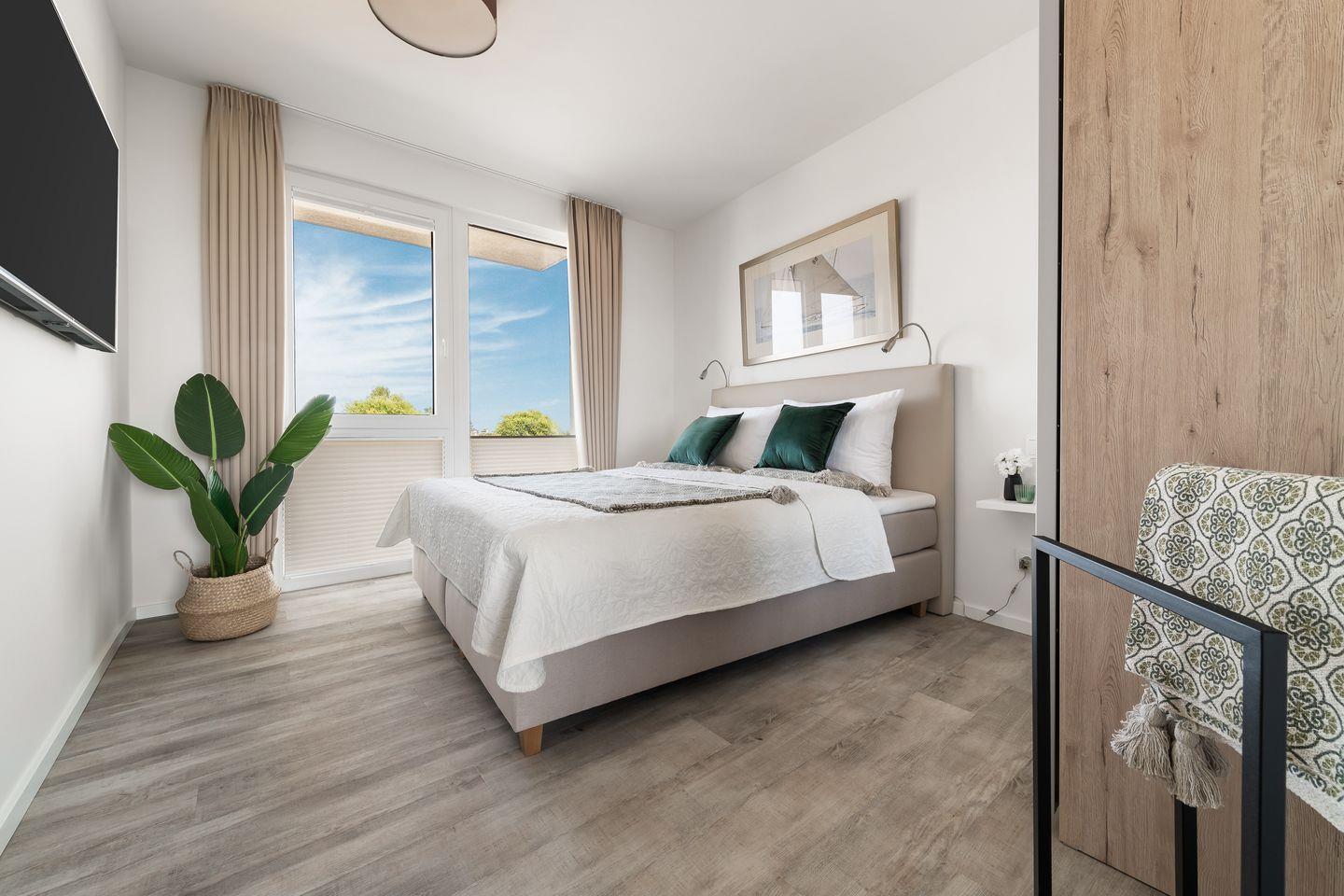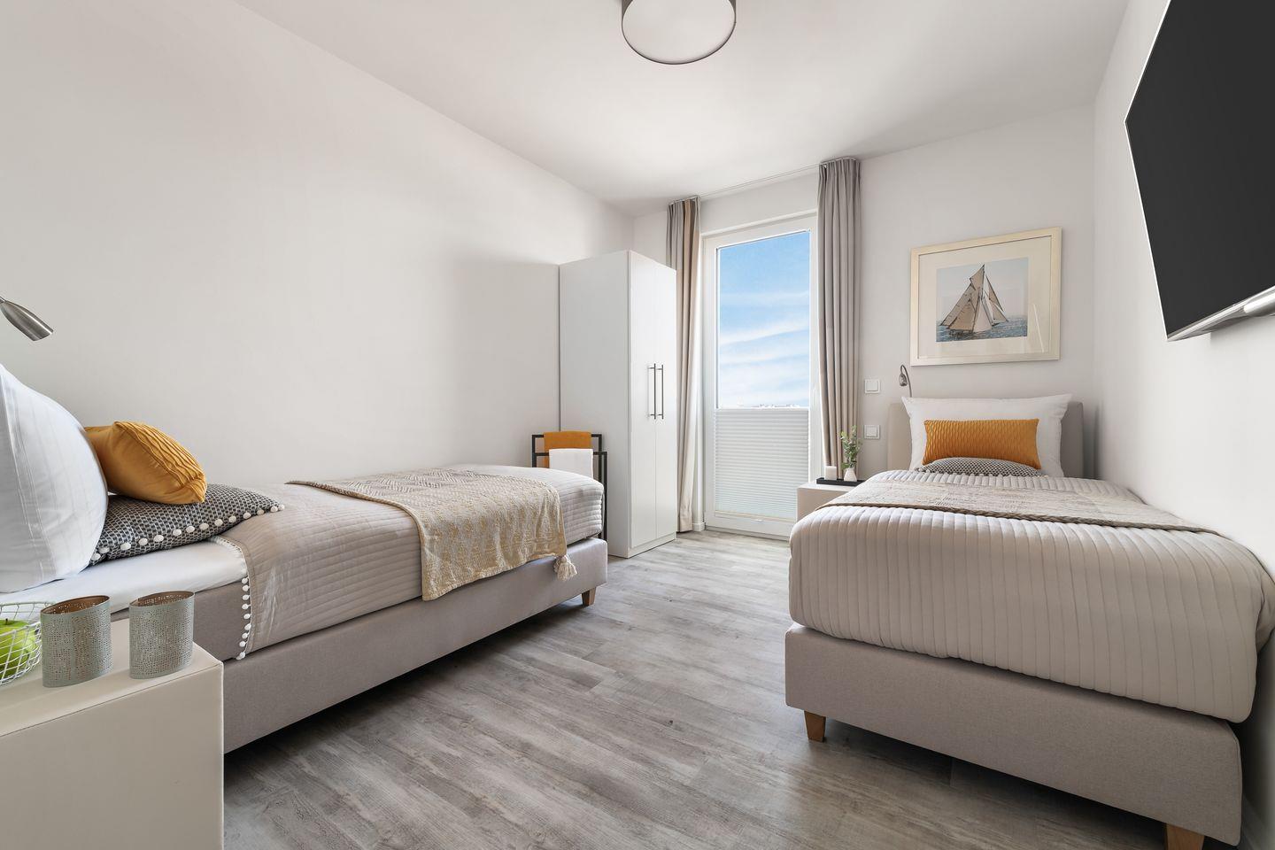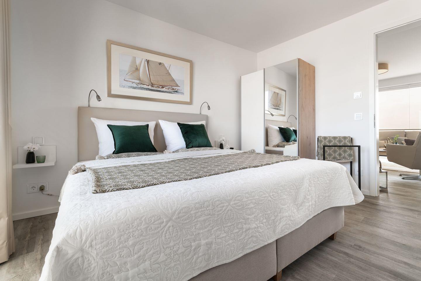Das Apartment "BeachLoungeTwo" bietet zwei Schlafzimmer, ausgestattet mit hochwertigen Boxspringbetten für einen erholsamen Schlaf. Entspannen Sie sich in der finnischen Sauna oder genießen Sie ein Bad in der großzügigen Wanne.