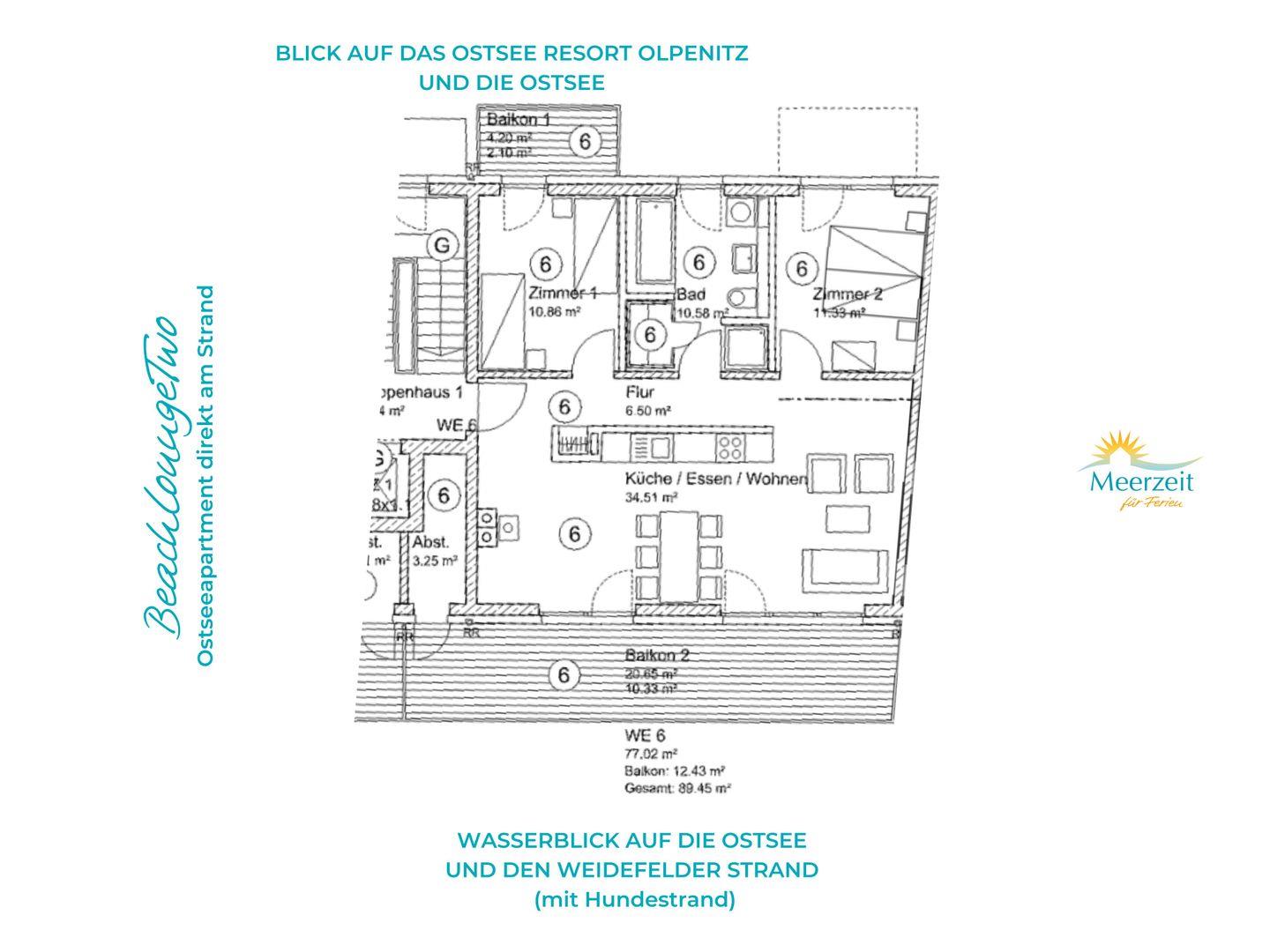 Ostseeurlaub in moderner Ferienwohnung mit bodentiefen Panoramafenstern und Meerblickterrasse direkt am Weidefelder Strand: Genießen Sie exklusives Wohnen im Apartment "BeachLoungeTwo", gelegen im 1. Obergeschoss eines Apartmenthauses. Im Haus, das insgesamt über vier Stockwerke verfügt, befindet sich ein Aufzug. Im Treppenhaus befinden sich 9 Stufen vom Eingang bis zum Fahrstuhl.