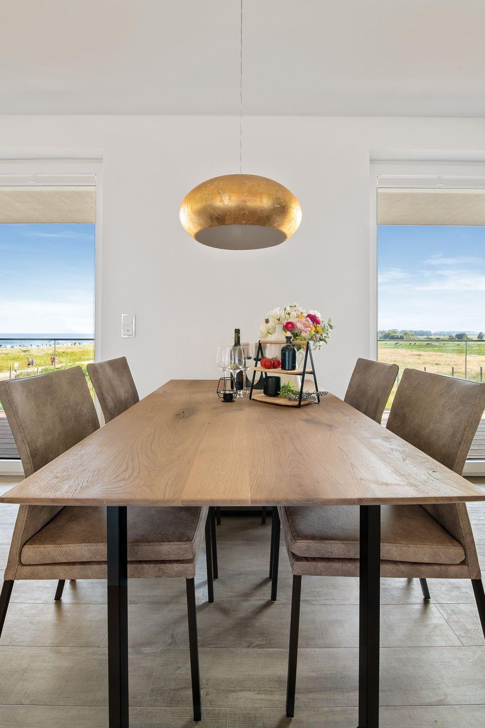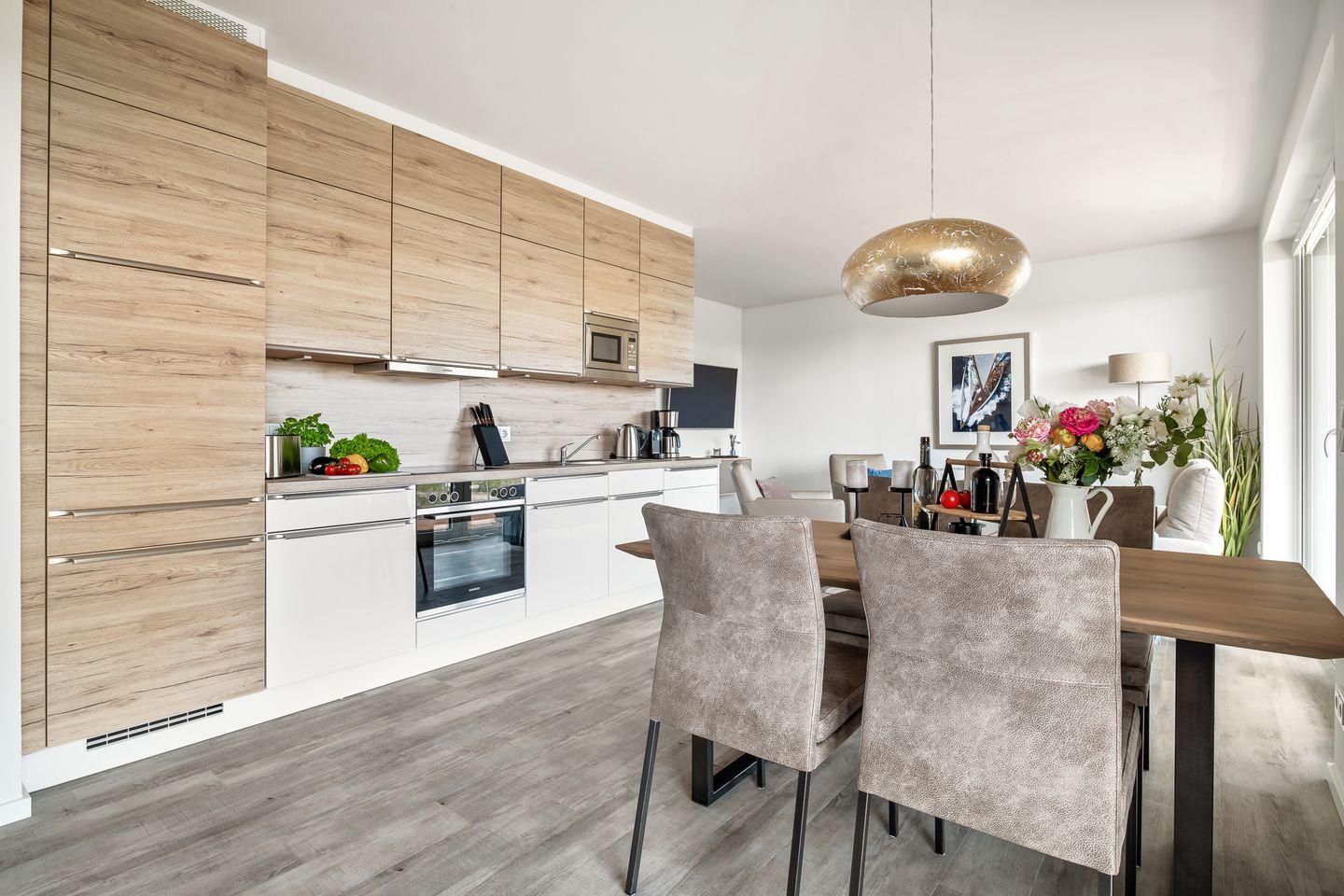 Der großzügige Wohn- und Essbereich ist der perfekte Ort für gesellige Stunden. Ausgestattet mit einer vollintegrierten Küche, können Sie hier leckere Mahlzeiten für Familie und Freunde zubereiten, während Sie den Blick auf die vorbeiziehenden Segelboote genießen. In der kühleren Jahreszeit sorgt der Kamin für gemütliche Atmosphäre.