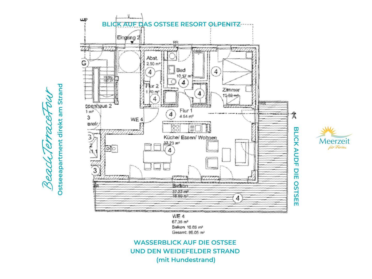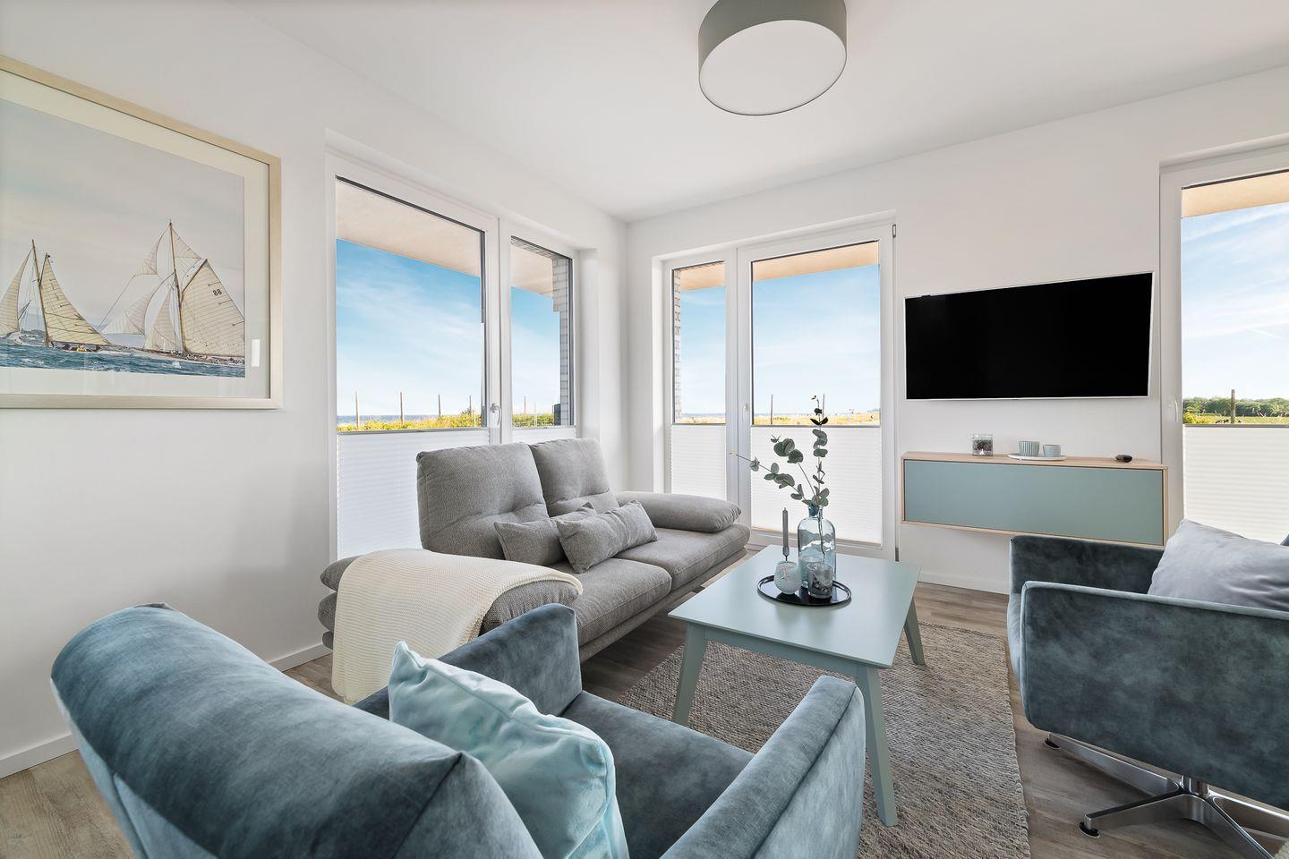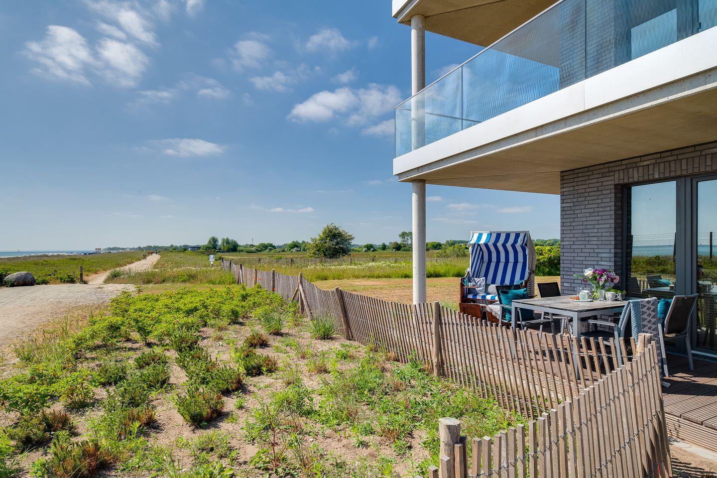 Ostseeurlaub in moderner Ferienwohnung mit bodentiefen Panoramafenstern und Meerblickterrasse, direkt am Weidefelder Strand: Genießen Sie exklusives Wohnen im Apartment "BeachTerraceFour", gelegen im Erdgeschoss eines Apartmenthauses mit Aufzug.