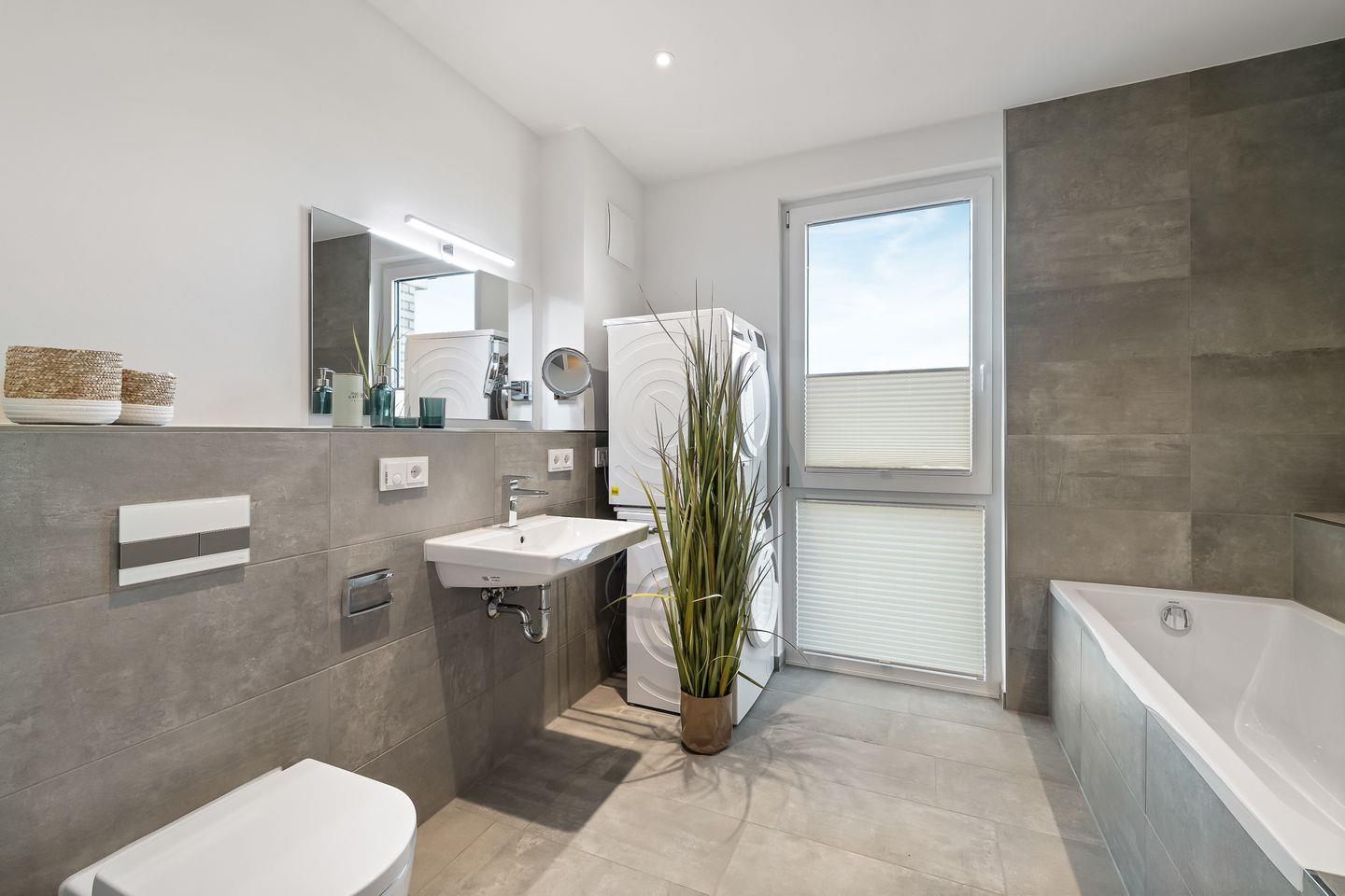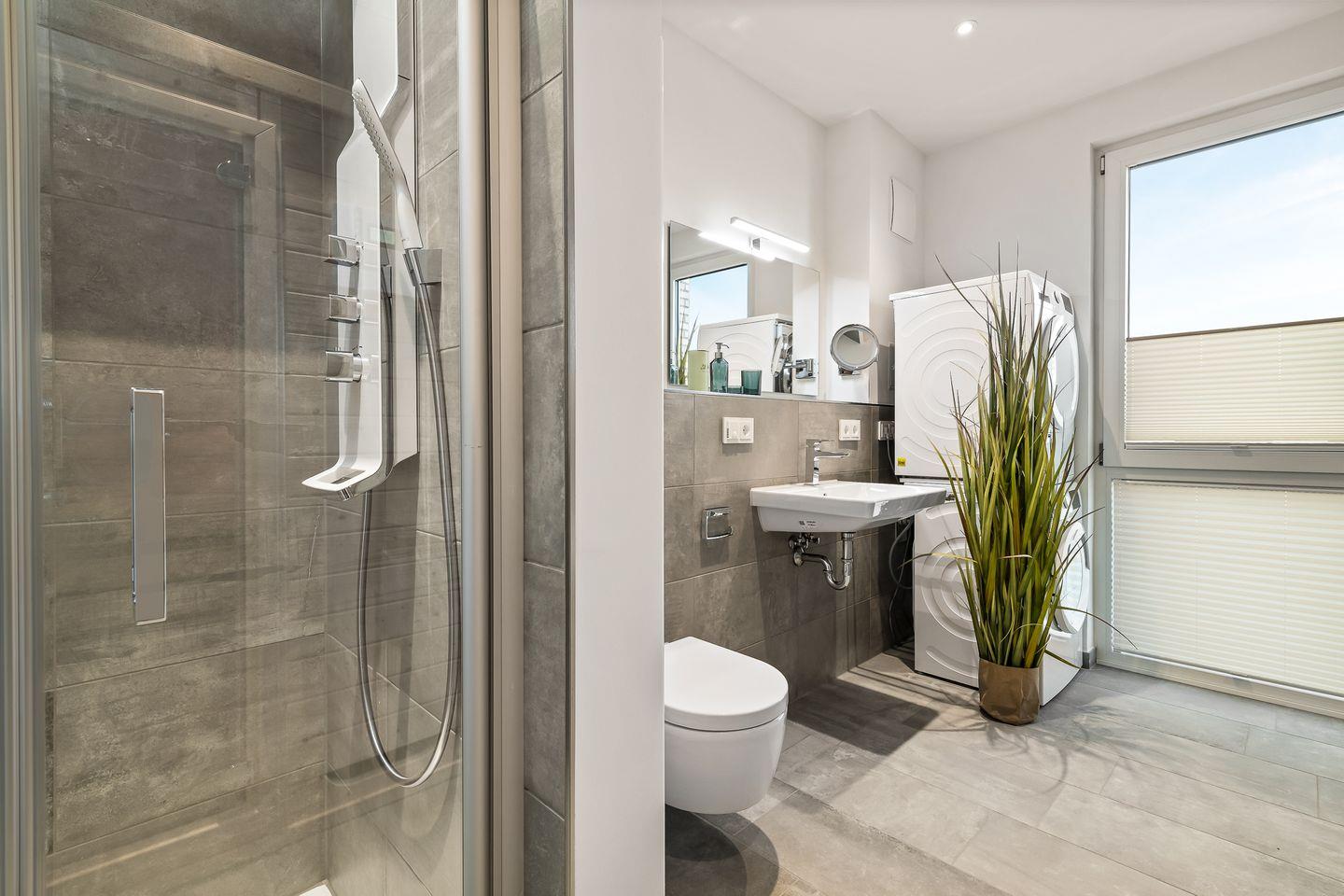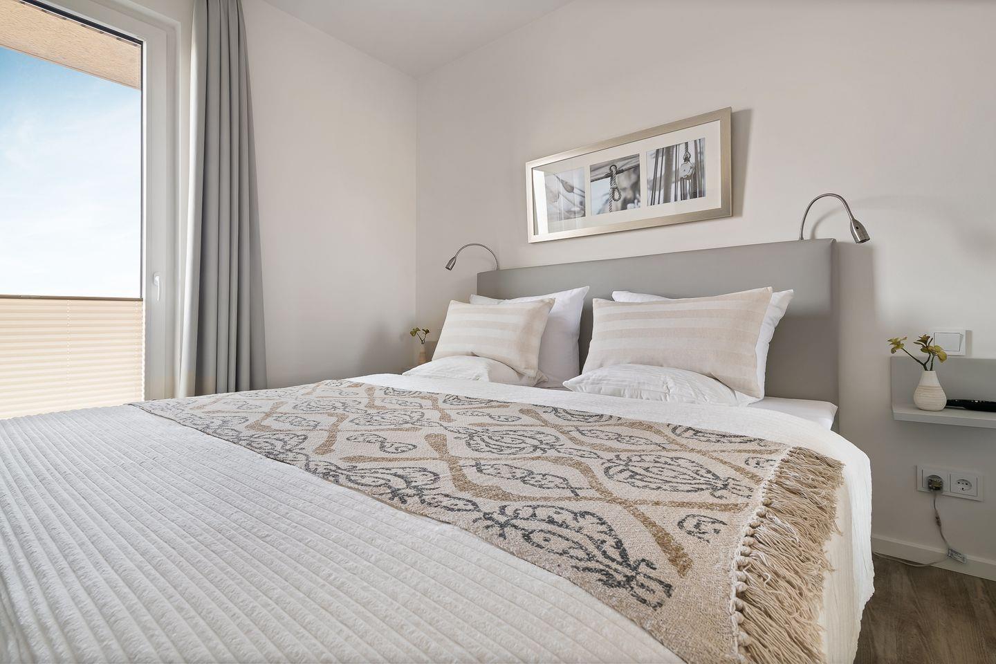 Das Apartment "BeachTerraceFour" bietet ein Schlafzimmer, ausgestattet mit einem hochwertigen Boxspringbett für erholsamen Schlaf. Entspannen Sie in der finnischen Sauna oder genießen Sie ein Bad in der großzügigen Wanne.
