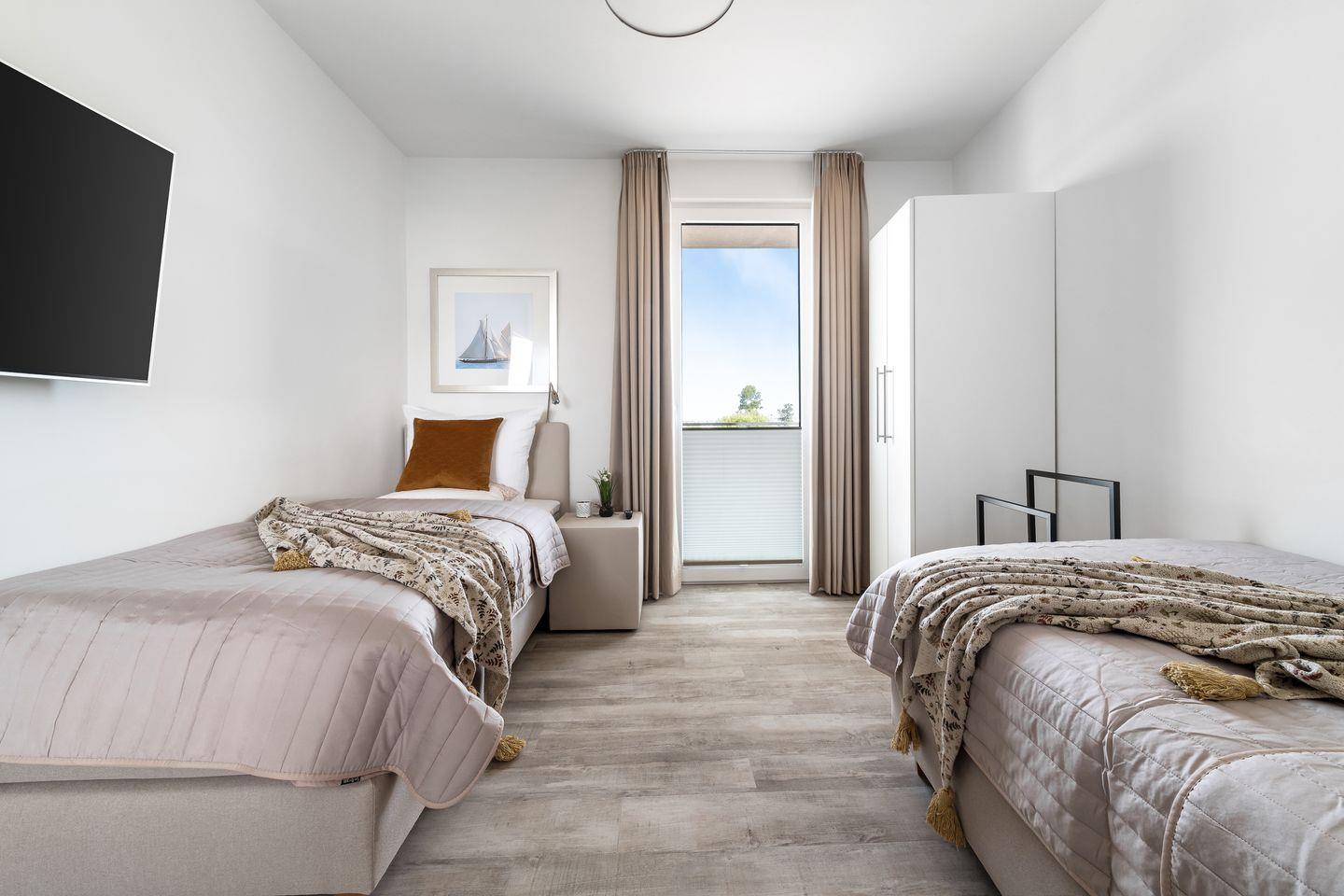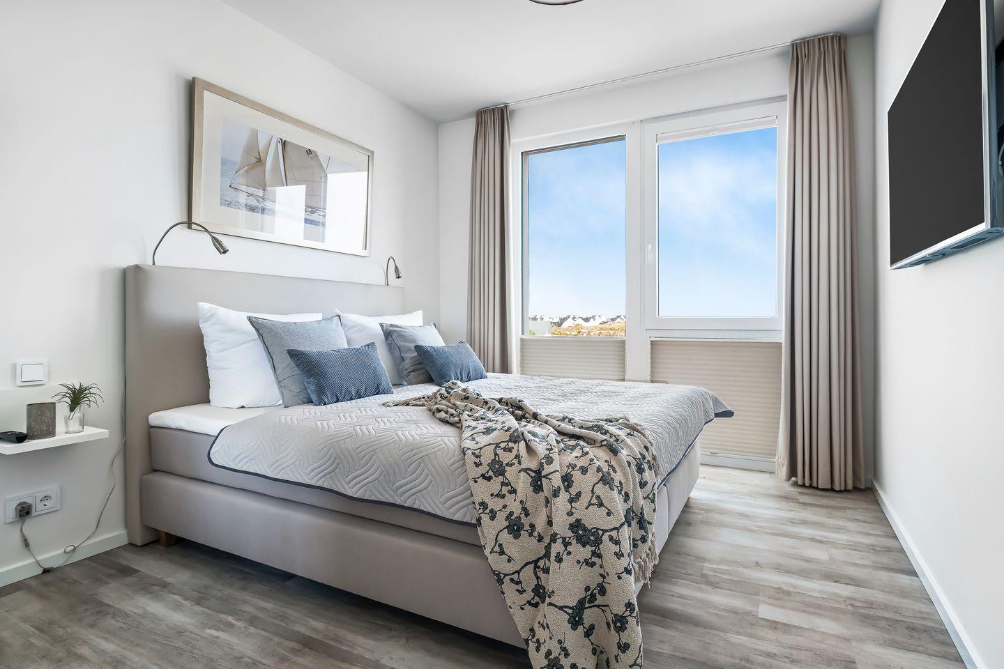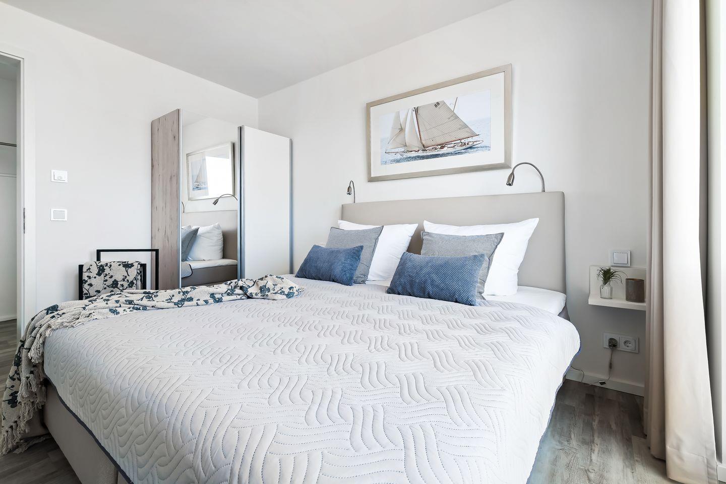 Das Apartment "BeachWaveTwo" bietet zwei Schlafzimmer, ausgestattet mit hochwertigen Boxspringbetten für einen erholsamen Schlaf. Entspannen Sie sich in der finnischen Sauna oder genießen Sie ein Bad in der großzügigen Wanne.