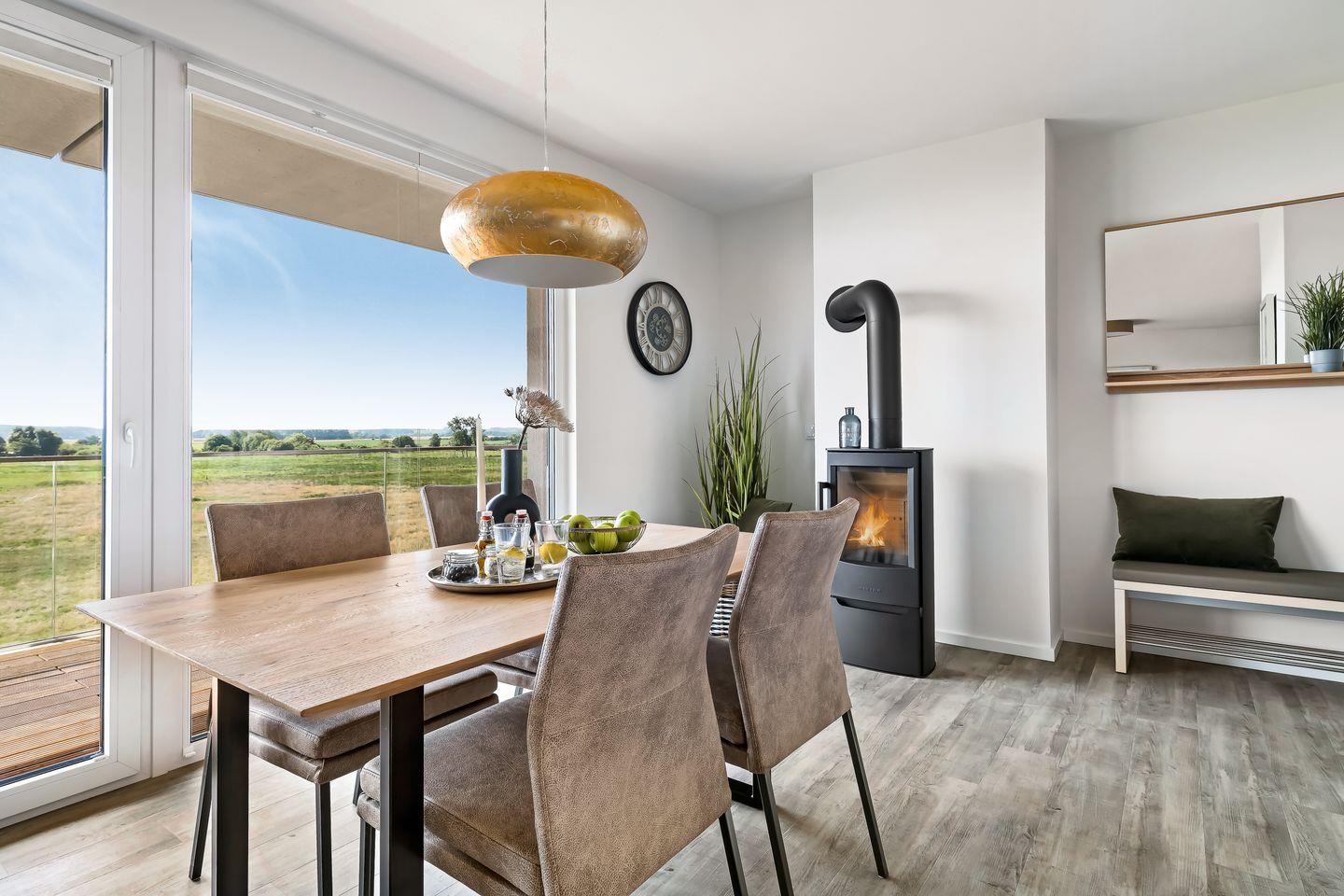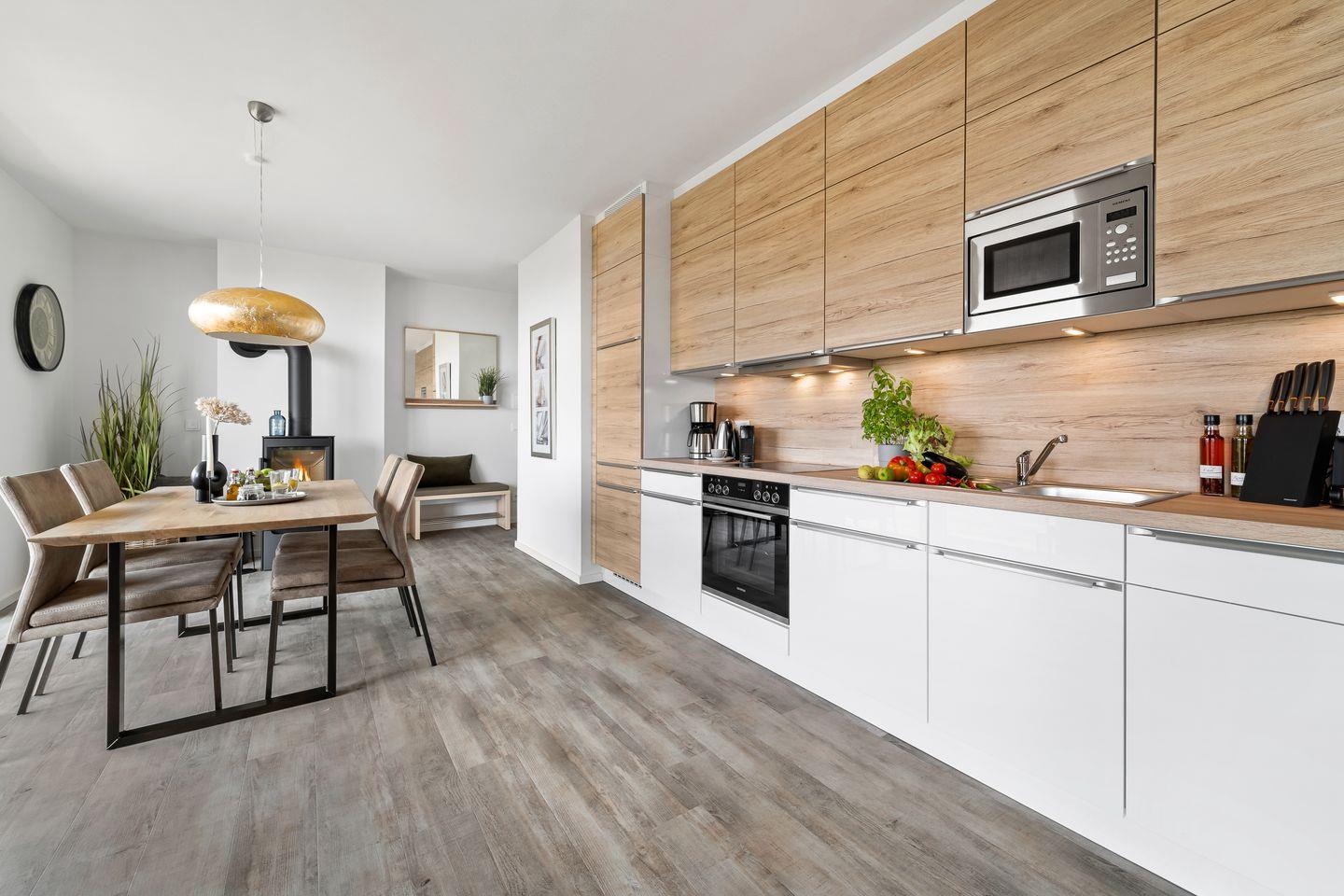 Der großzügige Wohn- und Essbereich ist der perfekte Ort für gesellige Stunden. Ausgestattet mit einer vollintegrierten Küche, können Sie hier leckere Mahlzeiten für Familie und Freunde zubereiten, während Sie den Blick auf die vorbeiziehenden Segelboote genießen. In der kühleren Jahreszeit sorgt der Kamin für gemütliche Atmosphäre.