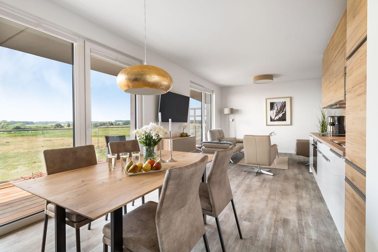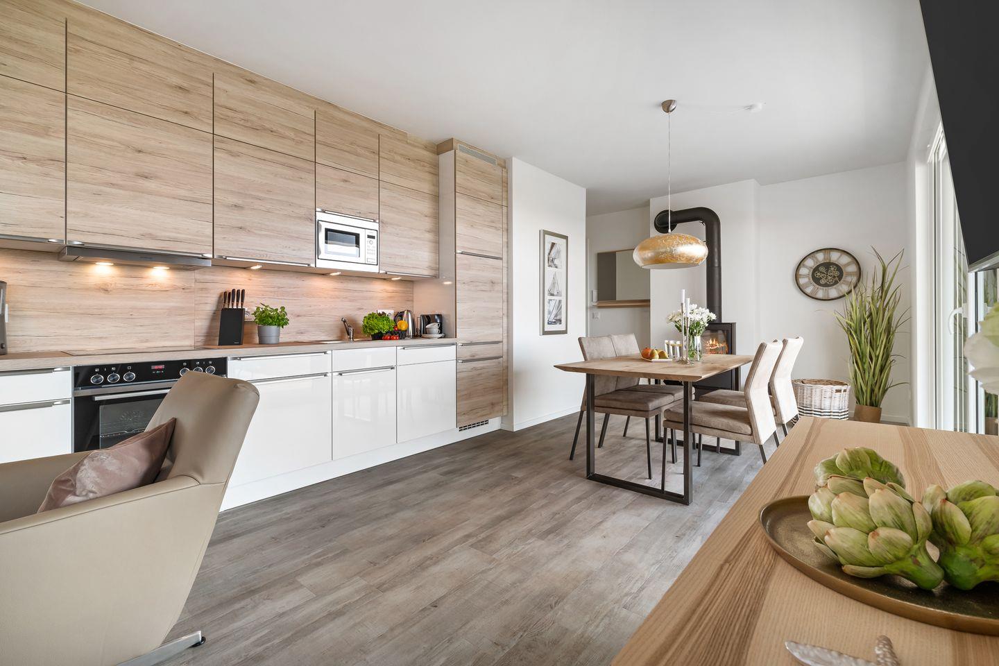 Der großzügige Wohn- und Essbereich ist der perfekte Ort für gesellige Stunden. Ausgestattet mit einer vollintegrierten Küche, können Sie hier leckere Mahlzeiten für Familie und Freunde zubereiten, während Sie den Blick auf die vorbeiziehenden Segelboote genießen. In der kühleren Jahreszeit sorgt der Kamin für gemütliche Atmosphäre.