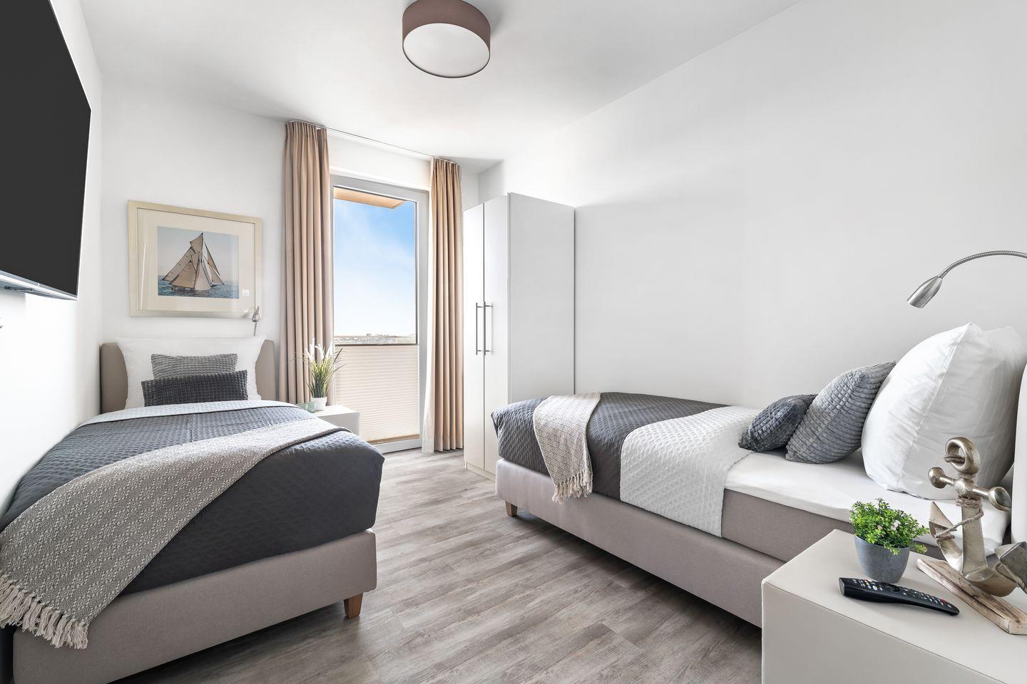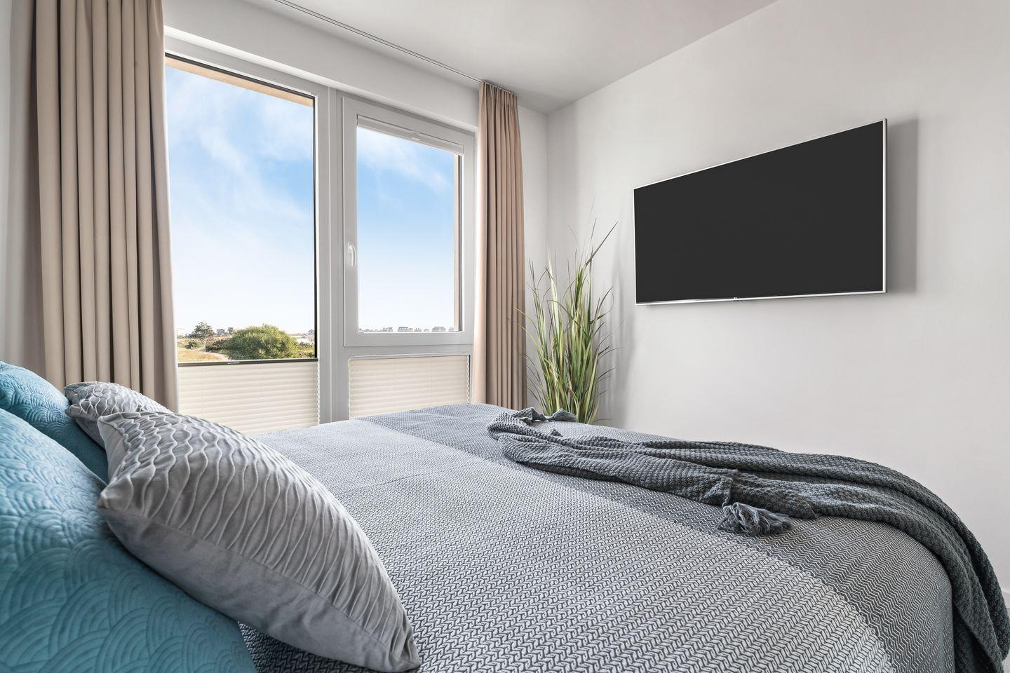 Das Apartment "BeachWaveThree" bietet zwei Schlafzimmer, ausgestattet mit hochwertigen Boxspringbetten für einen erholsamen Schlaf. Entspannen Sie sich in der finnischen Sauna oder genießen Sie ein Bad in der großzügigen Wanne.