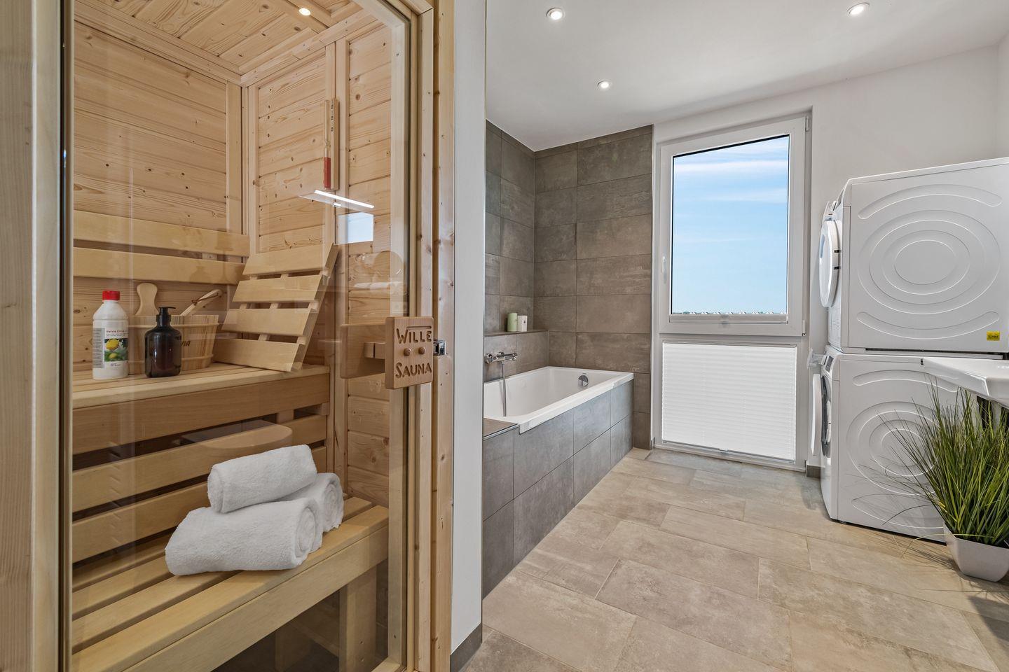Das Apartment "BeachViewTwo" bietet zwei Schlafzimmer, ausgestattet mit hochwertigen Boxspringbetten für einen erholsamen Schlaf. Entspannen Sie sich in der finnischen Sauna oder genießen Sie ein Bad in der großzügigen Wanne.