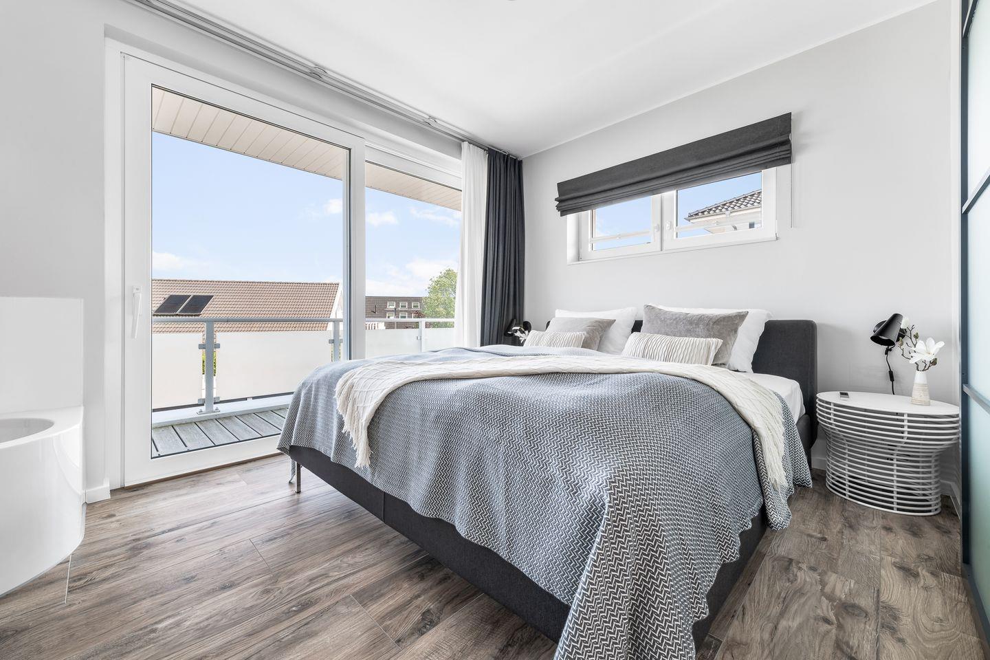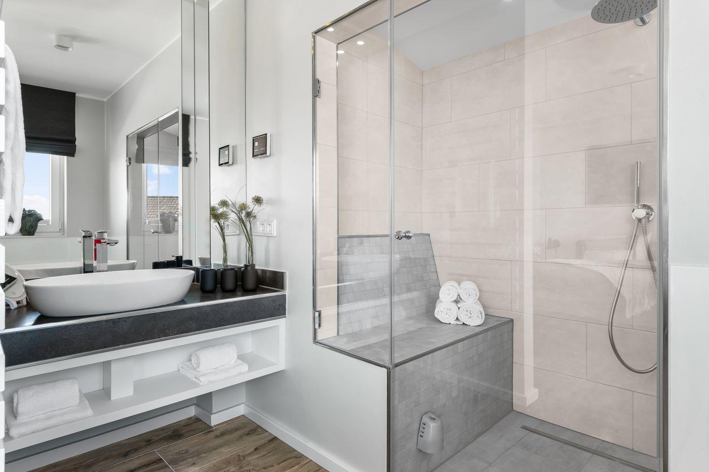 Der Masterbedroom verfügt über ein komfortables Doppelbett (1,80 x 2,00) mit direkt angrenzendem Badezimmer, das über einen großen Waschtisch, Badewanne und Dusche verfügt. Die große Dusche mit zwei gefliesten Sitzbänken bietet ein weiteres Highlight, da sie neben der Duschfunktion ebenso als Dampfsauna genutzt werden kann. Ein separates WC befindet sich abgetrennt durch eine Tür direkt neben dem Schlafzimmer.