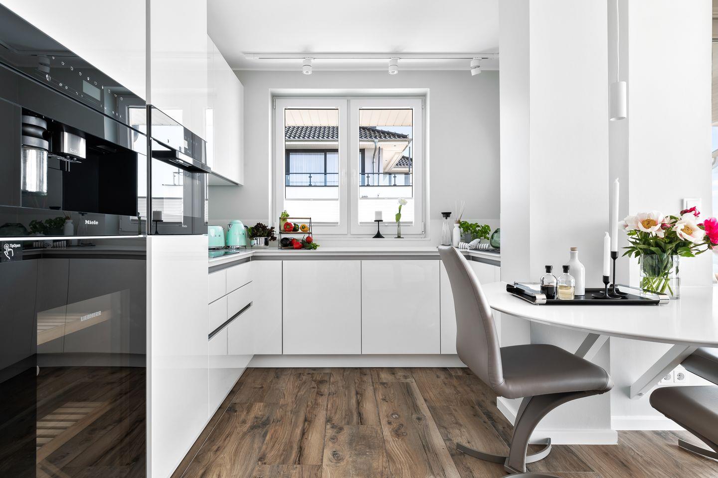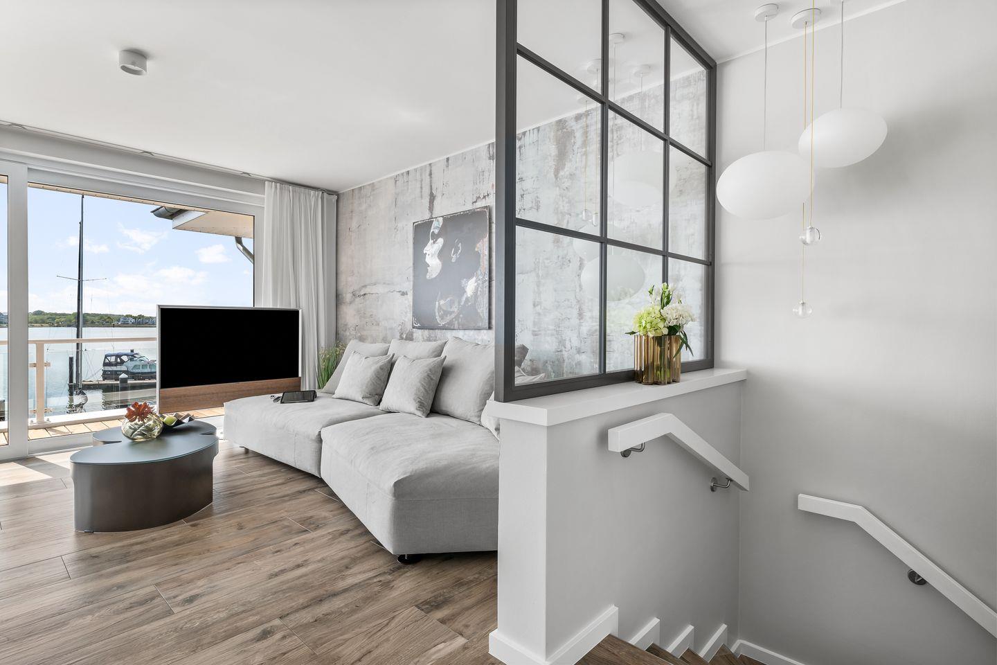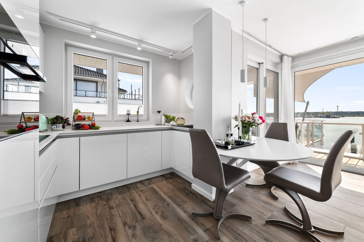 In der hochwertig ausgestatteten Küche steht Ihnen vom Topf- und Pfannenset bis hin zum Eierpikser oder Weinkühlschrank alles zur Verfügung und lässt keine Wünsche offen. Die moderne Küche geht direkt in das Wohn- und Esszimmer über, in dem ein großes gemütliches Sofa zum Relaxen einlädt. Die sonnige Terrasse mit Blick auf das Hafenbecken und der Schlei ist durch große Terassentüren direkt vom Wohnzimmer zu erreichen und bietet den perfekten Ort zum Grillen. Der Außenbereich ist jedoch nicht nur mit einem Grill ausgestattet, sondern lädt zusätzlich mit einer großen Sonneninsel, zwei Loungesesseln und einem Gartentisch mit Stühlen zum Sonnen und Genießen ein.