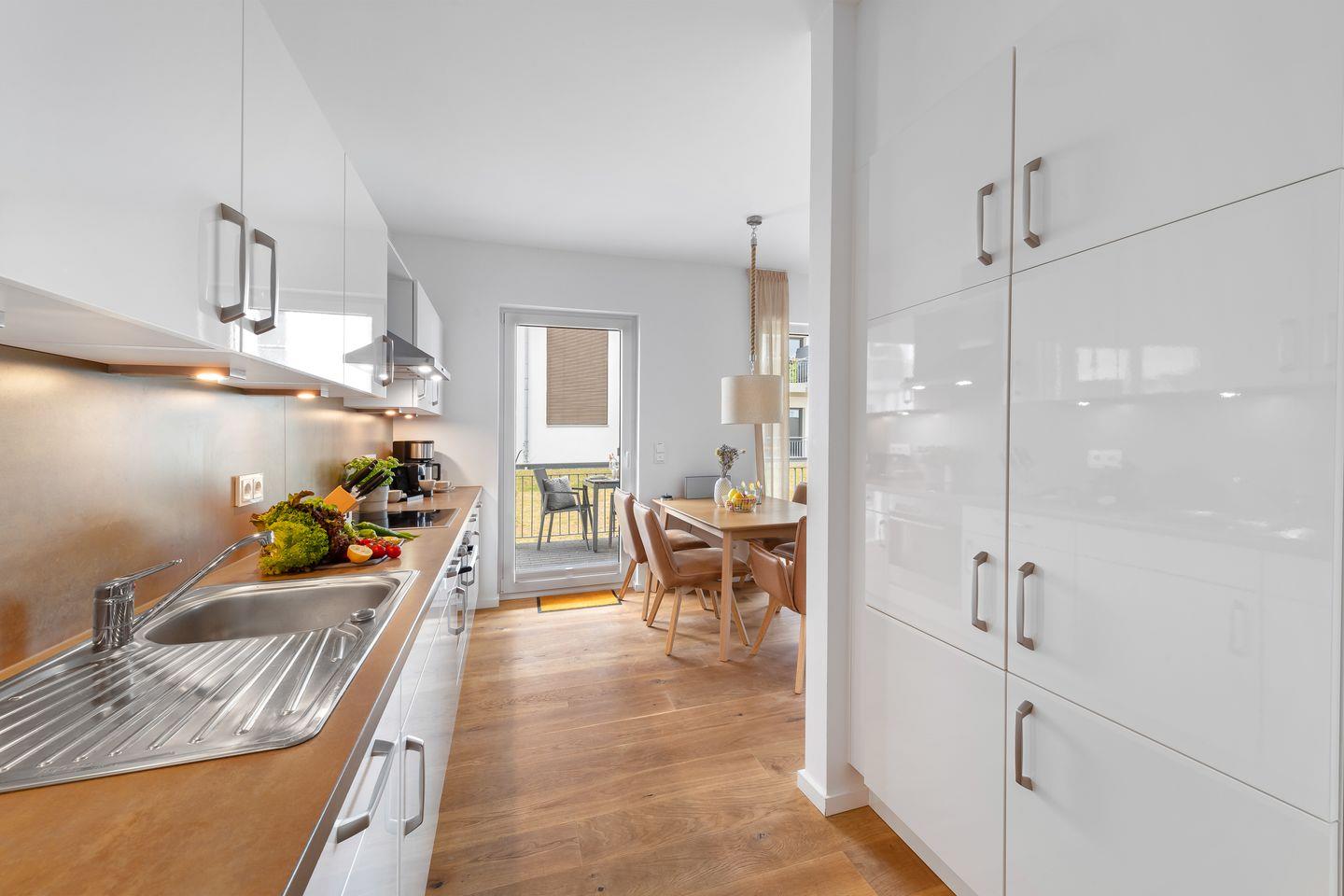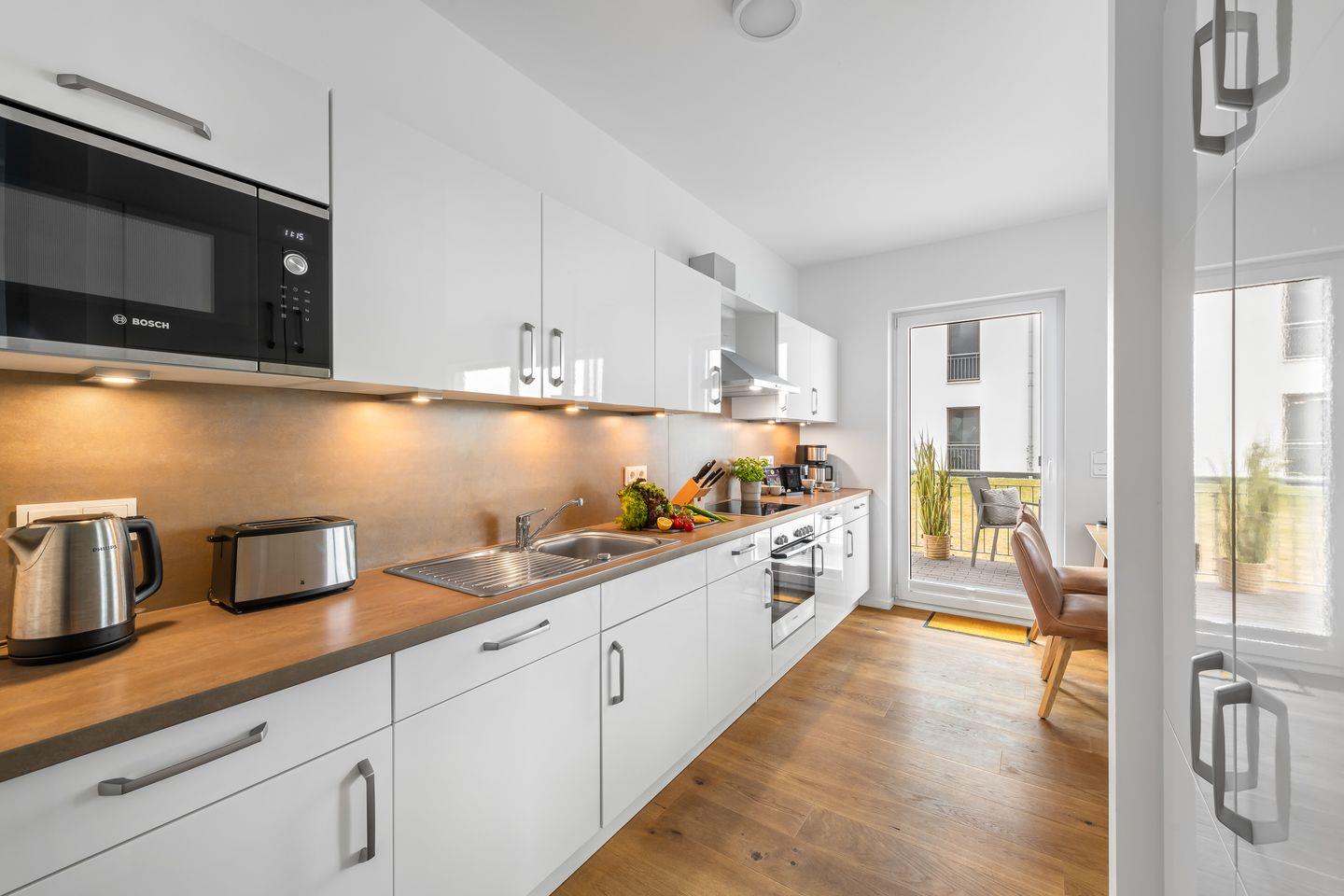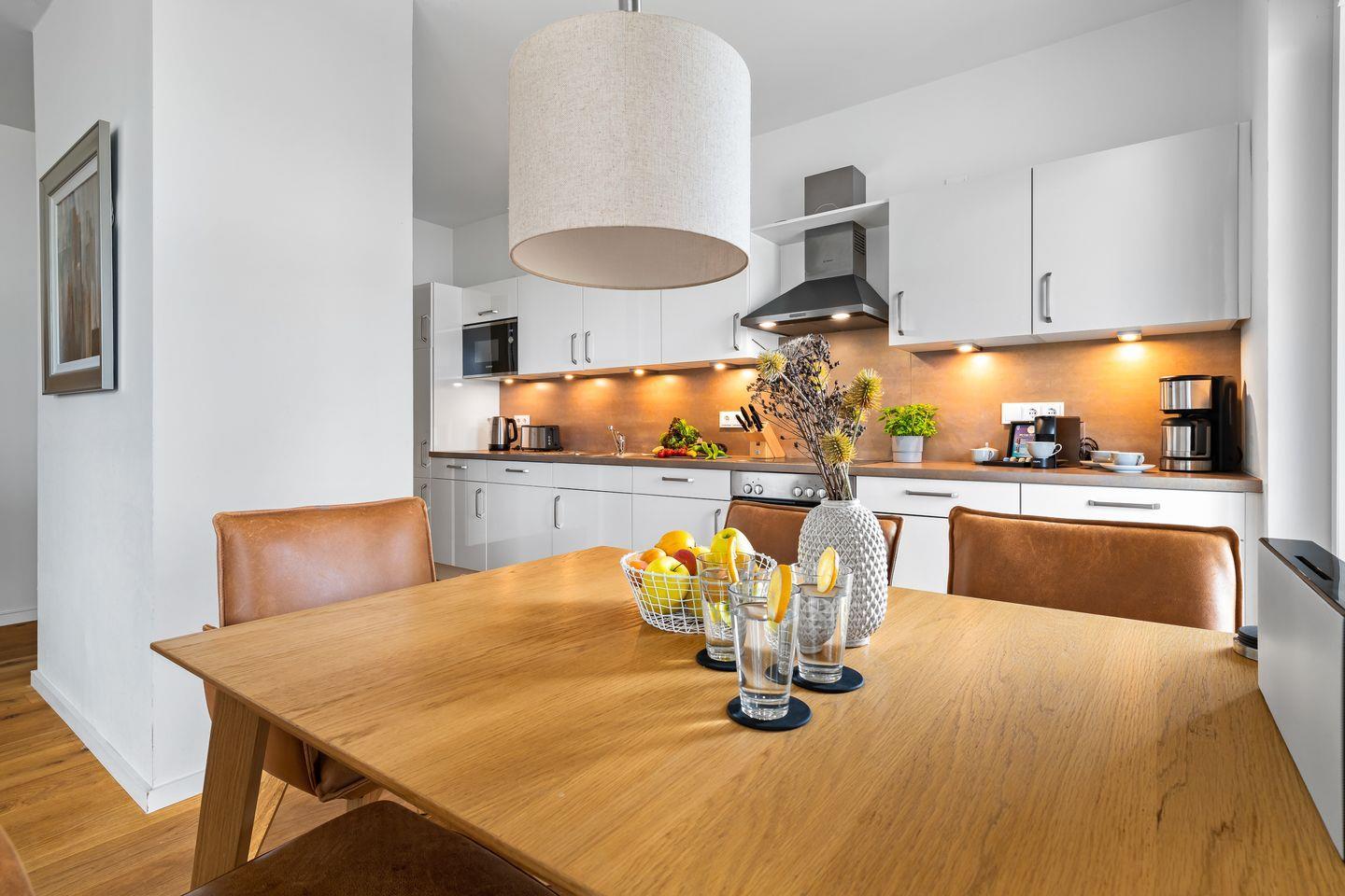 An den Wohnbereich grenzt der offene Koch- und Essbereich an. Die Gäste erwartet eine moderne Einbauküche, die mit allem, was das Herz eines Hobbykochs begehrt, ausgestattet ist. Am großen Esstisch findet jeder seinen Platz, ob beim gemütlichen Abendessen oder beim Spieleabend.
